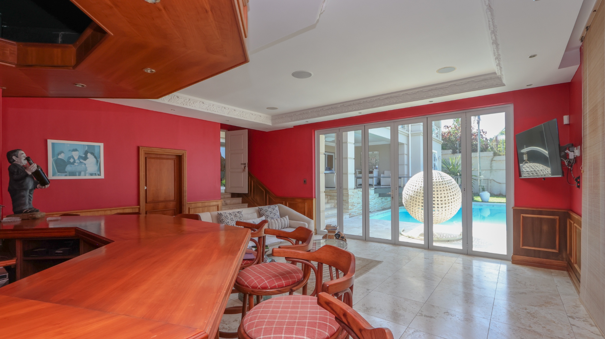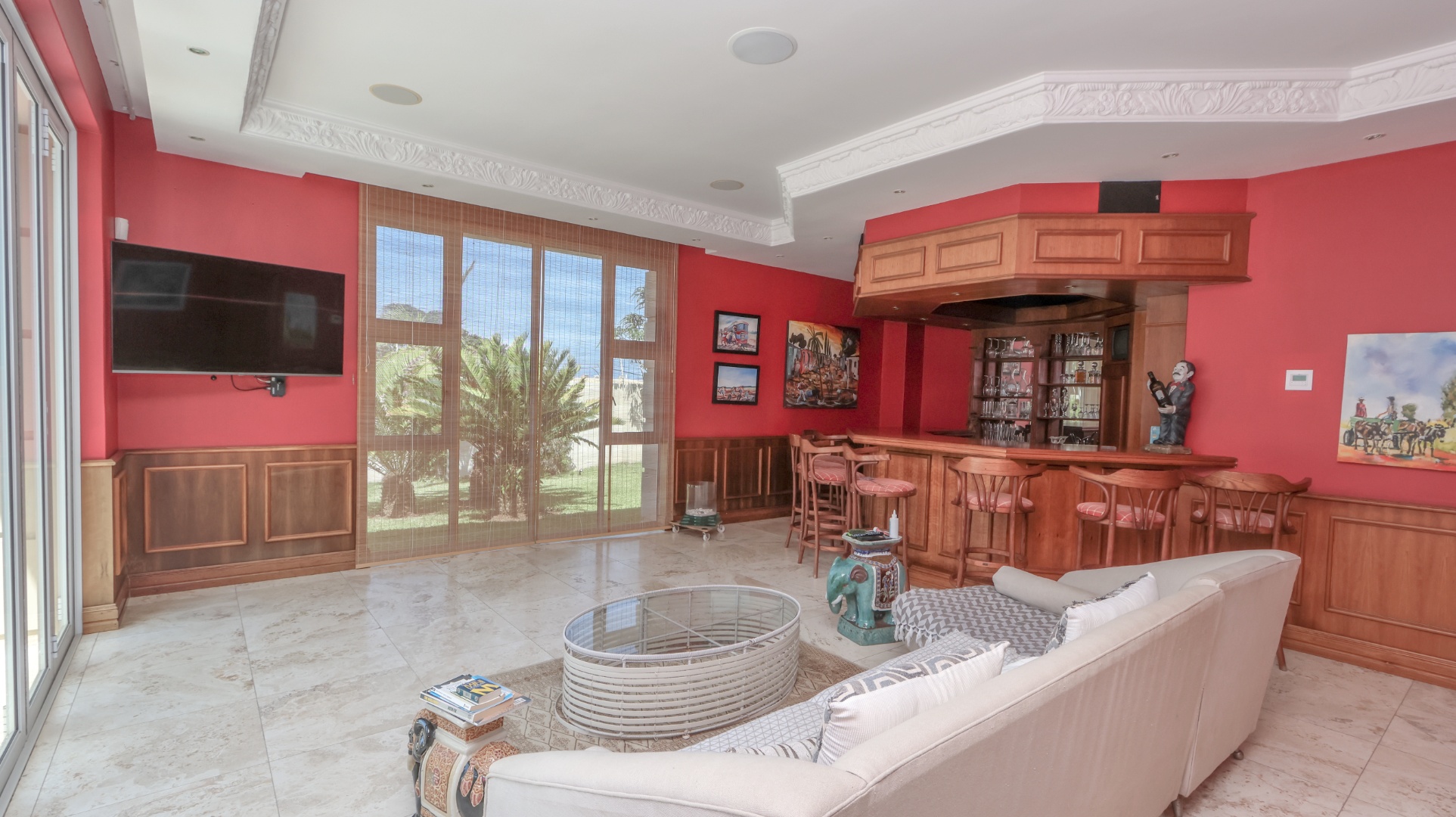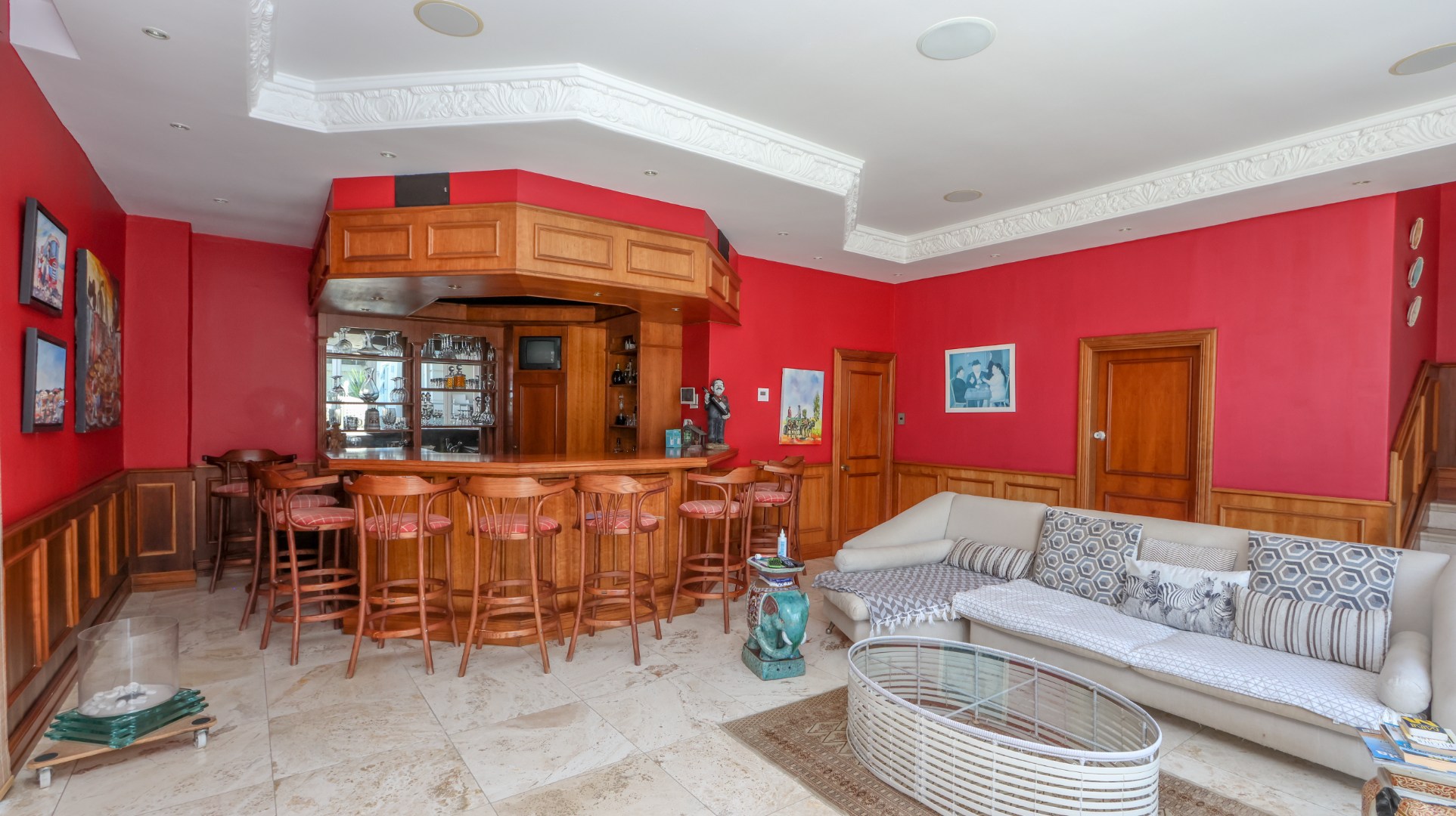 At the heart of the home lies a gourmet chef’s kitchen, fully equipped with state-of-the-art appliances and cutting-edge technology. A spacious walk-in fridge and dedicated wine racks offer premium storage for fine ingredients and prized vintages. The fitted bar, positioned to overlook the pool area, creates the perfect setting for both relaxed evenings and upscale entertaining.