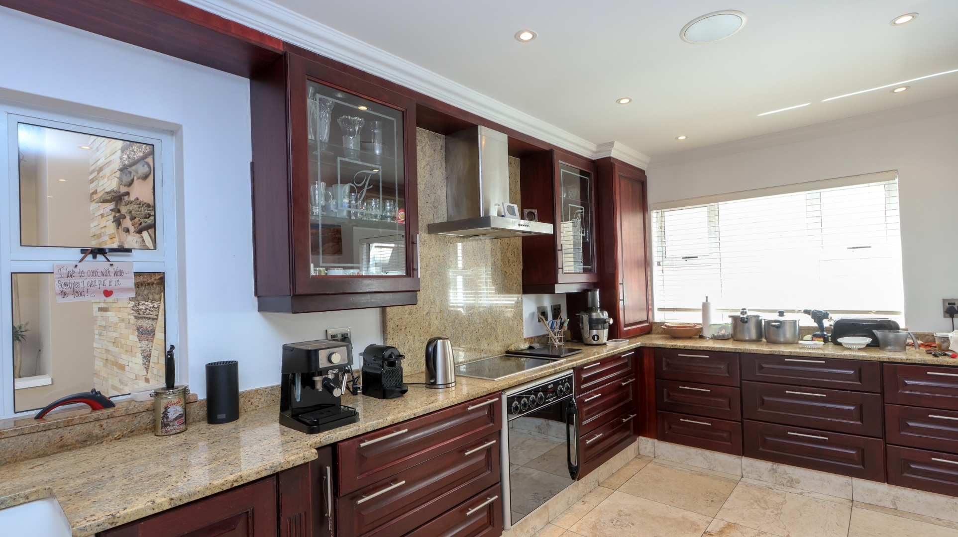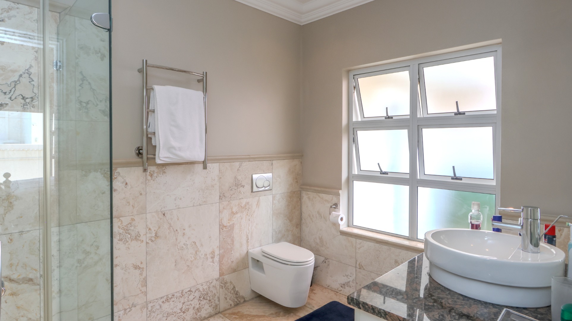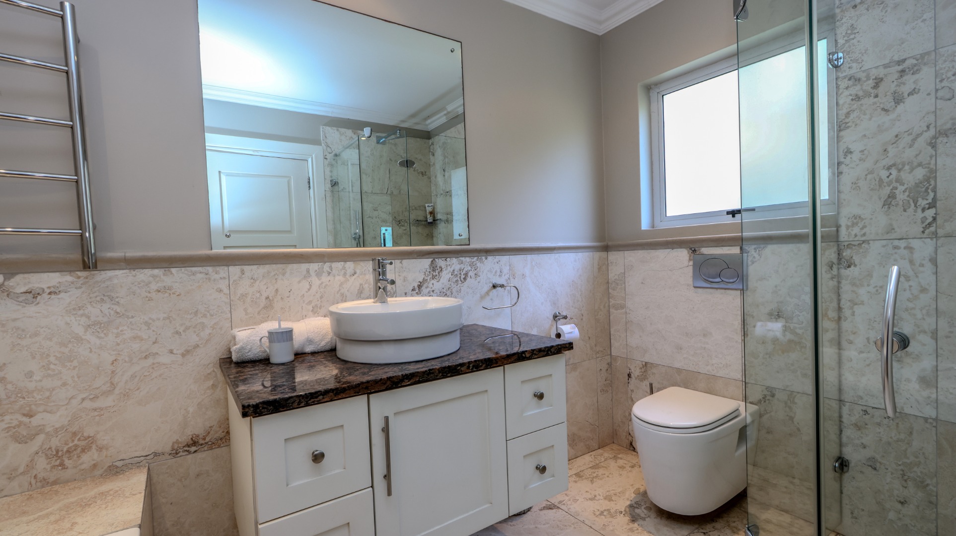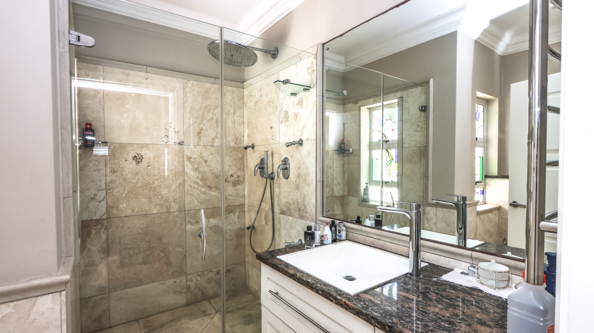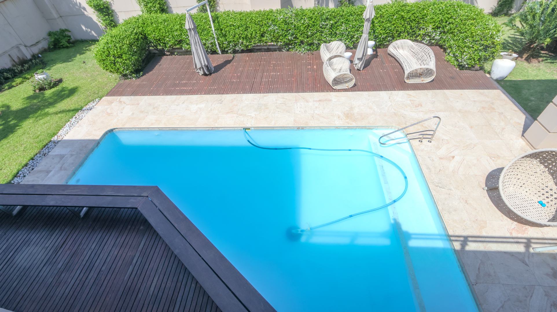 Outdoors, the beautifully designed pool area is framed by sleek marble tiling, creating a resort-like atmosphere. The borehole is a valuable addition, ensuring consistent and sustainable water supply.