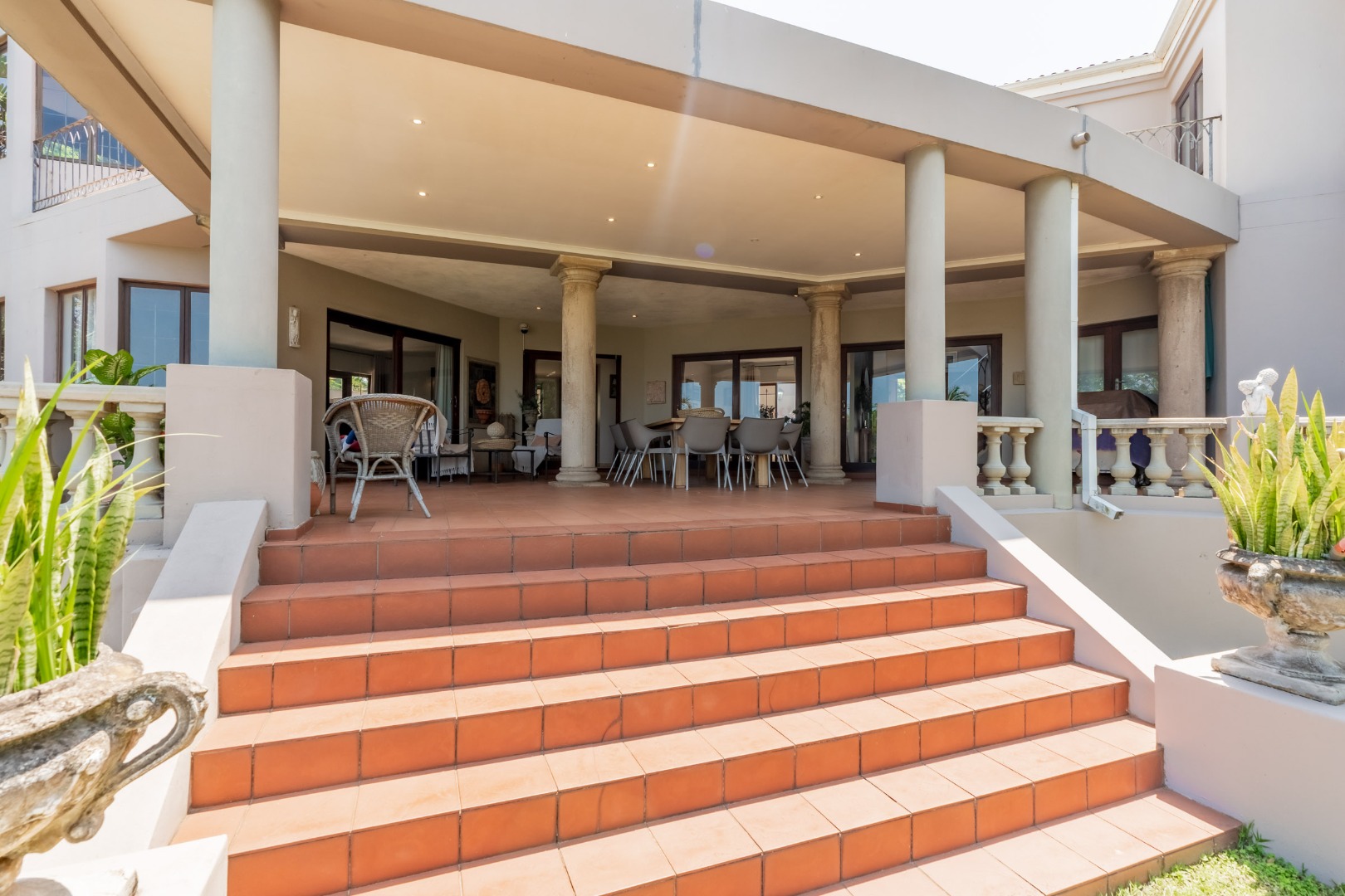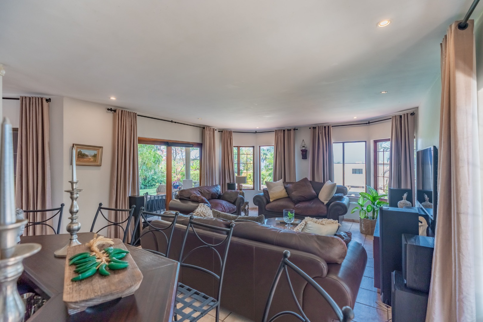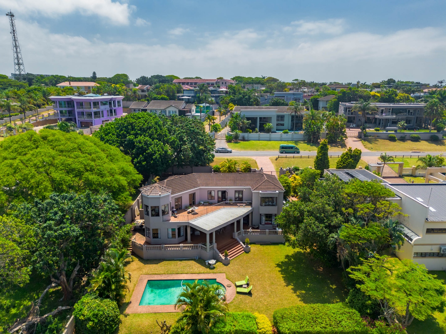 Discover this impressive four-bedroom, three-bathroom residence, perfectly situated in the sought-after suburban area of Umhlanga Rocks. The property immediately captivates with its strong kerb appeal, featuring a spacious brick paver driveway, a separate double garage, and a prominent Mediterranean-style entrance which leads to a grand double-volume entrance hall, setting a sophisticated tone for the home.
