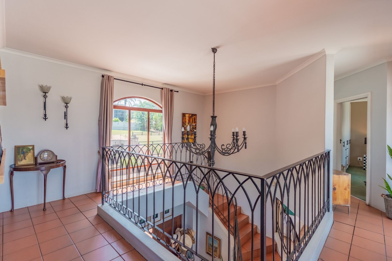 The interior boasts an elegant wrought iron staircase and an upper-level balcony overlooking the entrance, enhancing the sense of space and light. The layout includes a comfortable lounge and entertainment space, a dedicated dining room, and a family/TV room, all designed for versatile living. The well-appointed kitchen features a convenient pantry, while large glass sliding doors throughout ensure abundant natural light and seamless indoor-outdoor flow. Air conditioning is installed for year-round comfort.