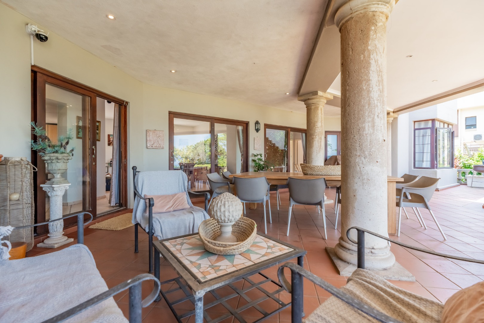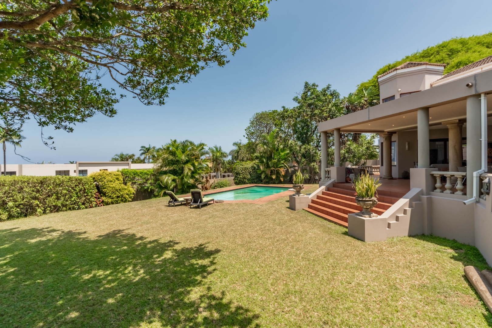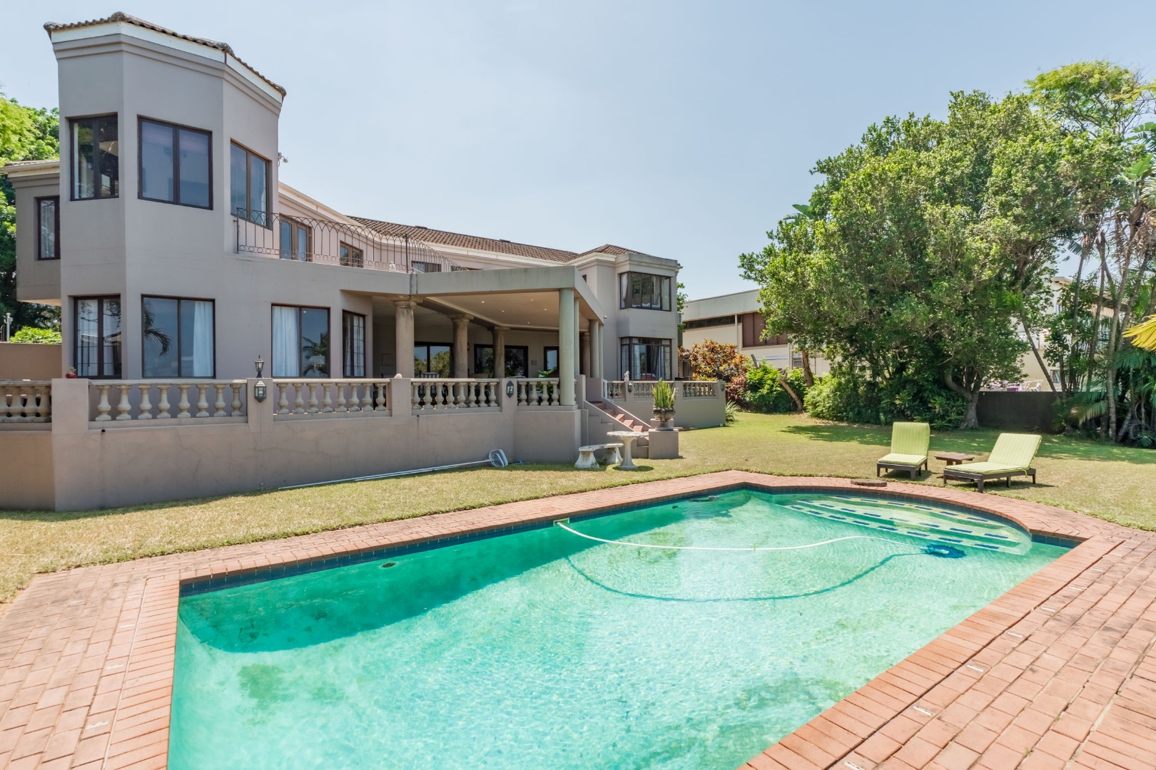 Discover this impressive four-bedroom, three-bathroom residence, perfectly situated in the sought-after suburban area of Umhlanga Rocks. The property immediately captivates with its strong kerb appeal, featuring a spacious brick paver driveway, a separate double garage, and a prominent Mediterranean-style entrance which leads to a grand double-volume entrance hall, setting a sophisticated tone for the home.
