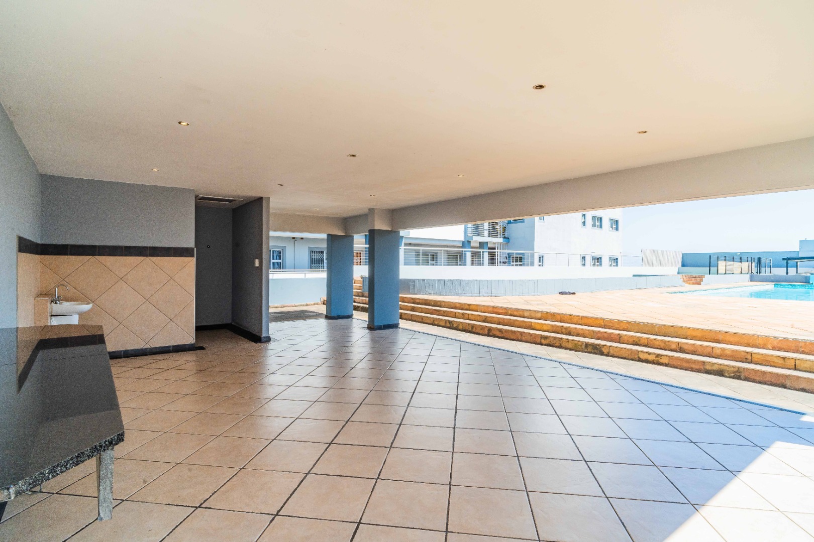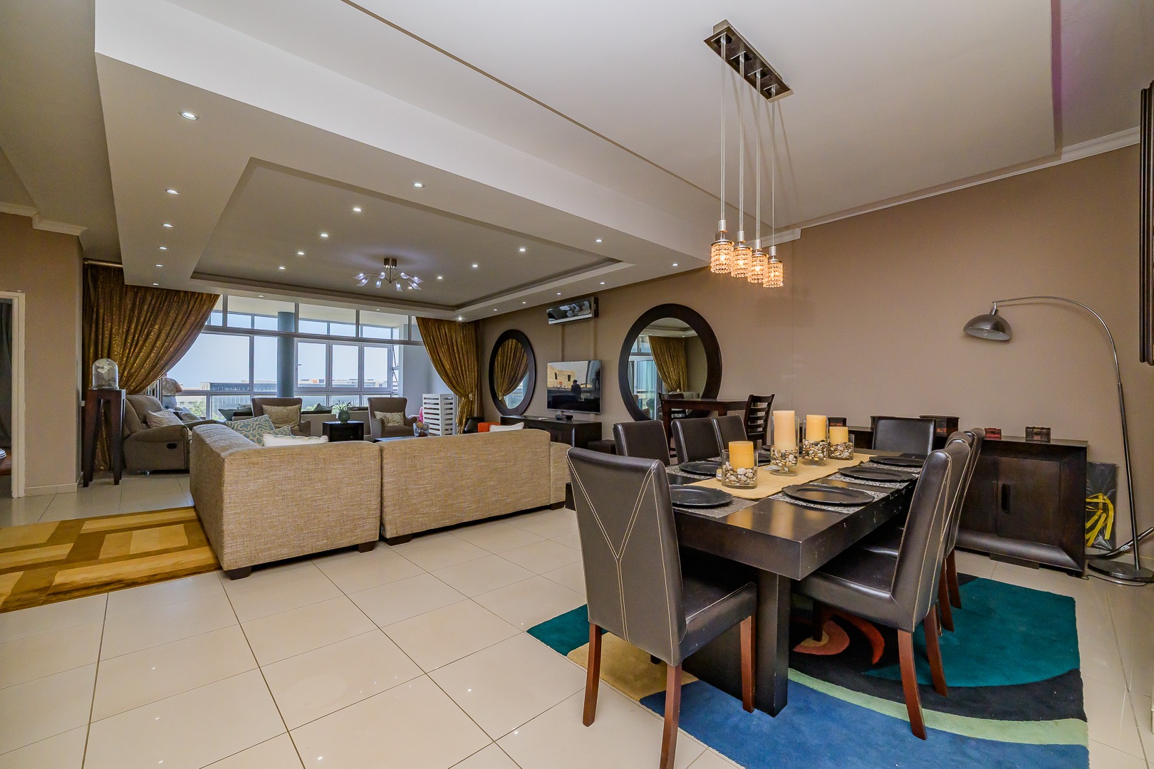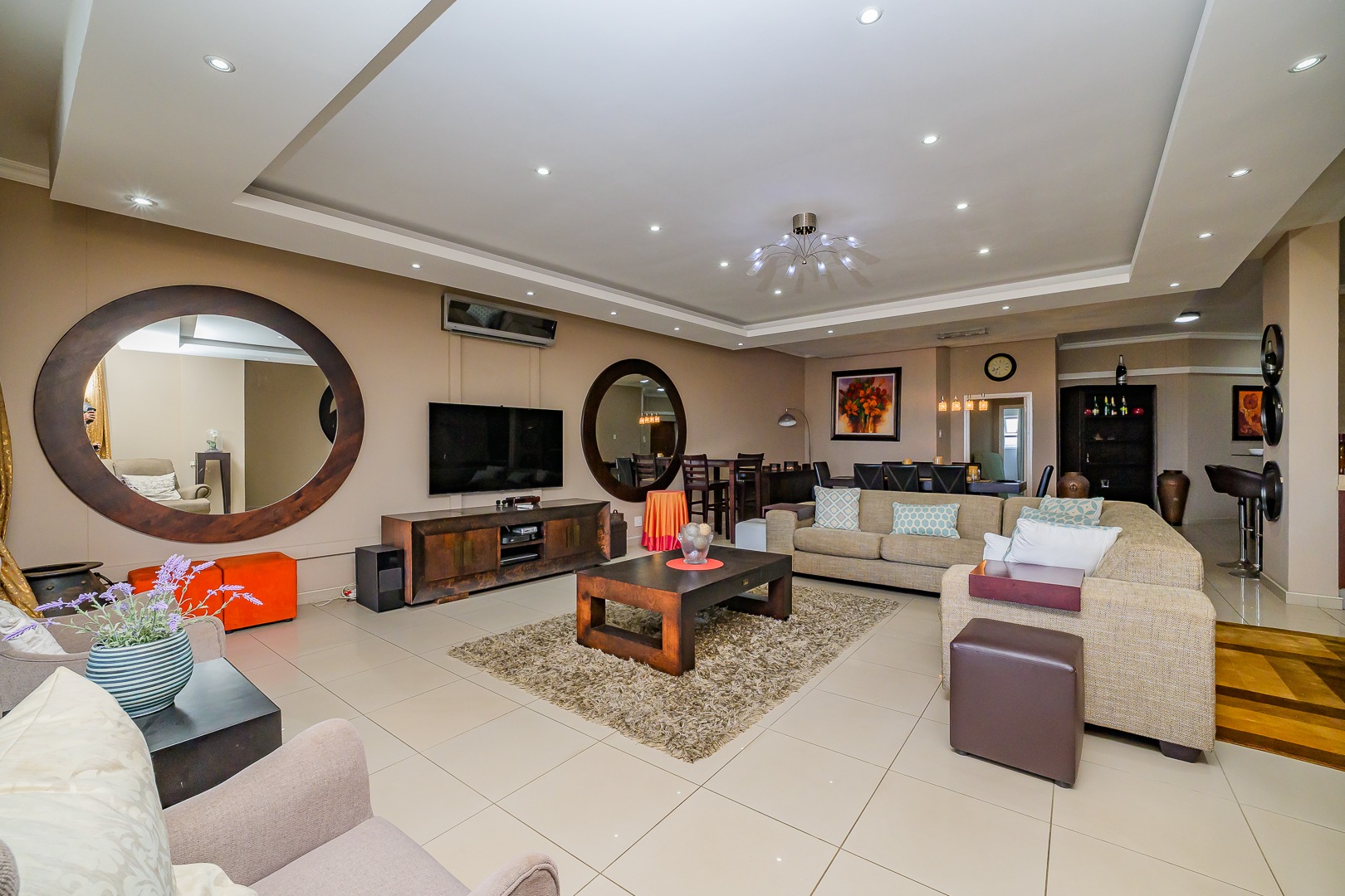 Step into modern coastal living with this expansive 214 sqm apartment located in the vibrant Umhlanga Ridge. The open-plan design seamlessly integrates the spacious lounge and dining areas, featuring contemporary recessed lighting, air conditioning, and elegant tiled flooring throughout. Large windows and sliding doors invite abundant natural light, creating a bright and airy ambiance. The well-appointed kitchen boasts dark wood cabinetry, with quartz countertops and an integrated bar area, perfect for entertaining. A convenient pantry adds to the functionality of this central hub.