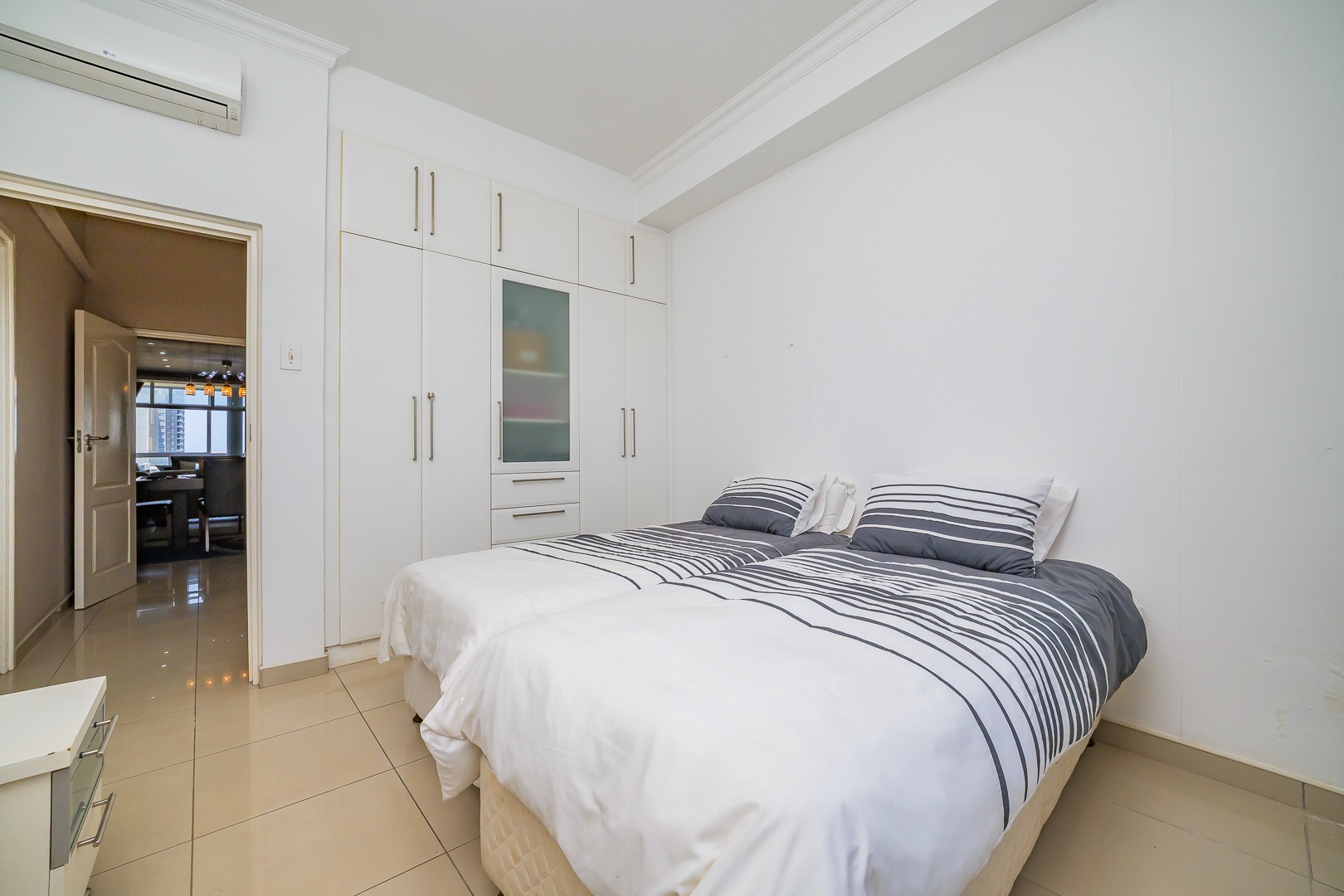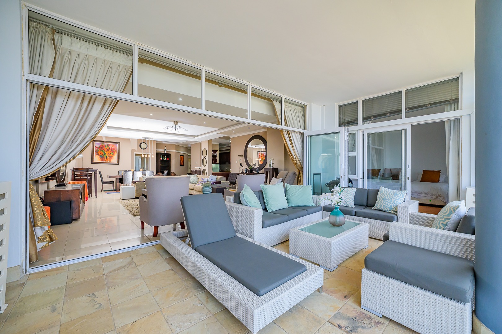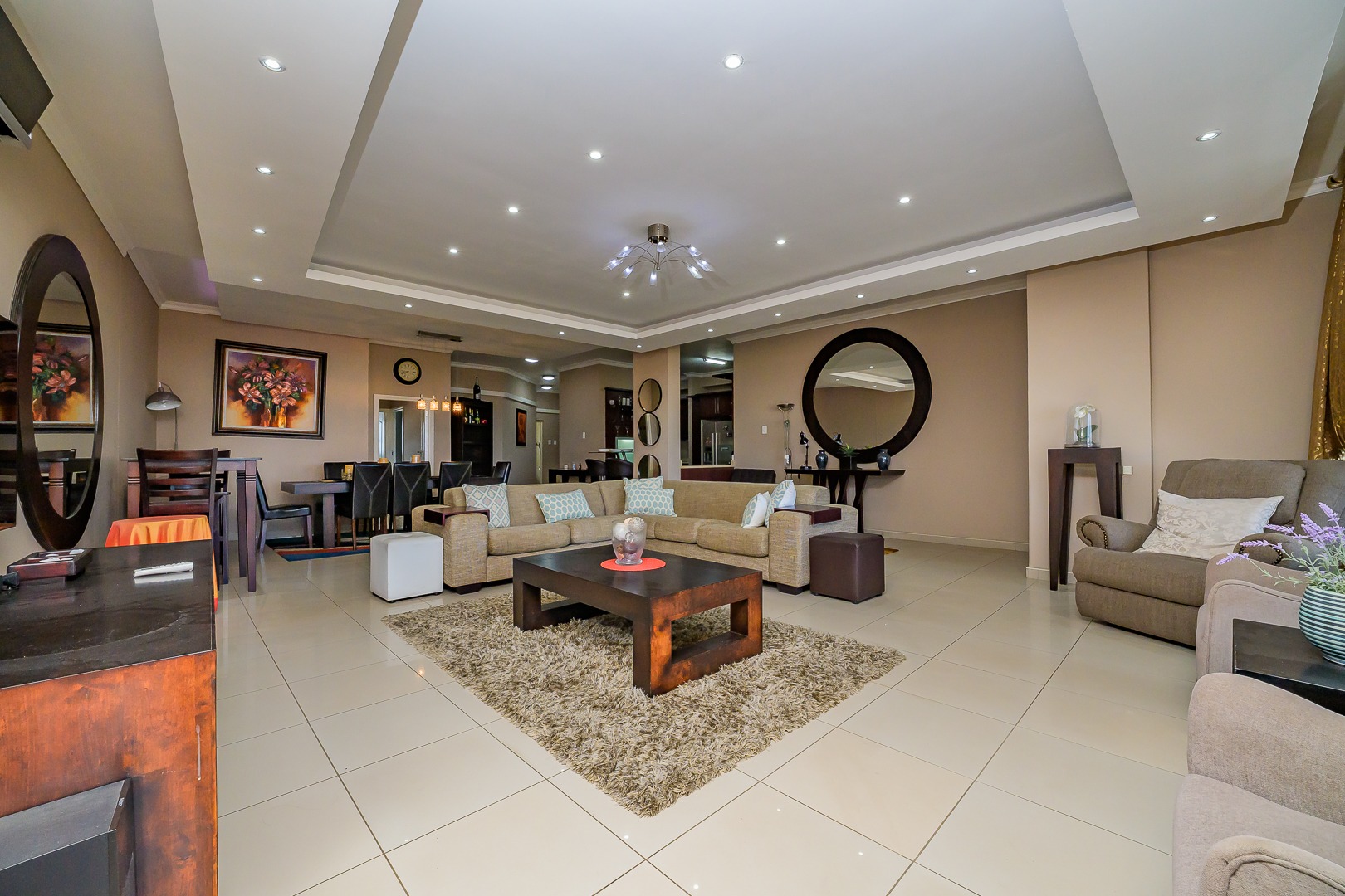 Step into modern coastal living with this expansive 214 sqm apartment located in the vibrant Umhlanga Ridge. The open-plan design seamlessly integrates the spacious lounge and dining areas, featuring contemporary recessed lighting, air conditioning, and elegant tiled flooring throughout. Large windows and sliding doors invite abundant natural light, creating a bright and airy ambiance. The well-appointed kitchen boasts dark wood cabinetry, with quartz countertops and an integrated bar area, perfect for entertaining. A convenient pantry adds to the functionality of this central hub.