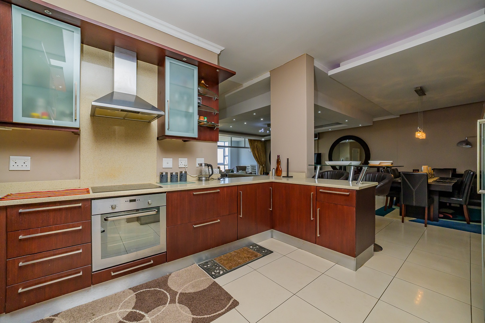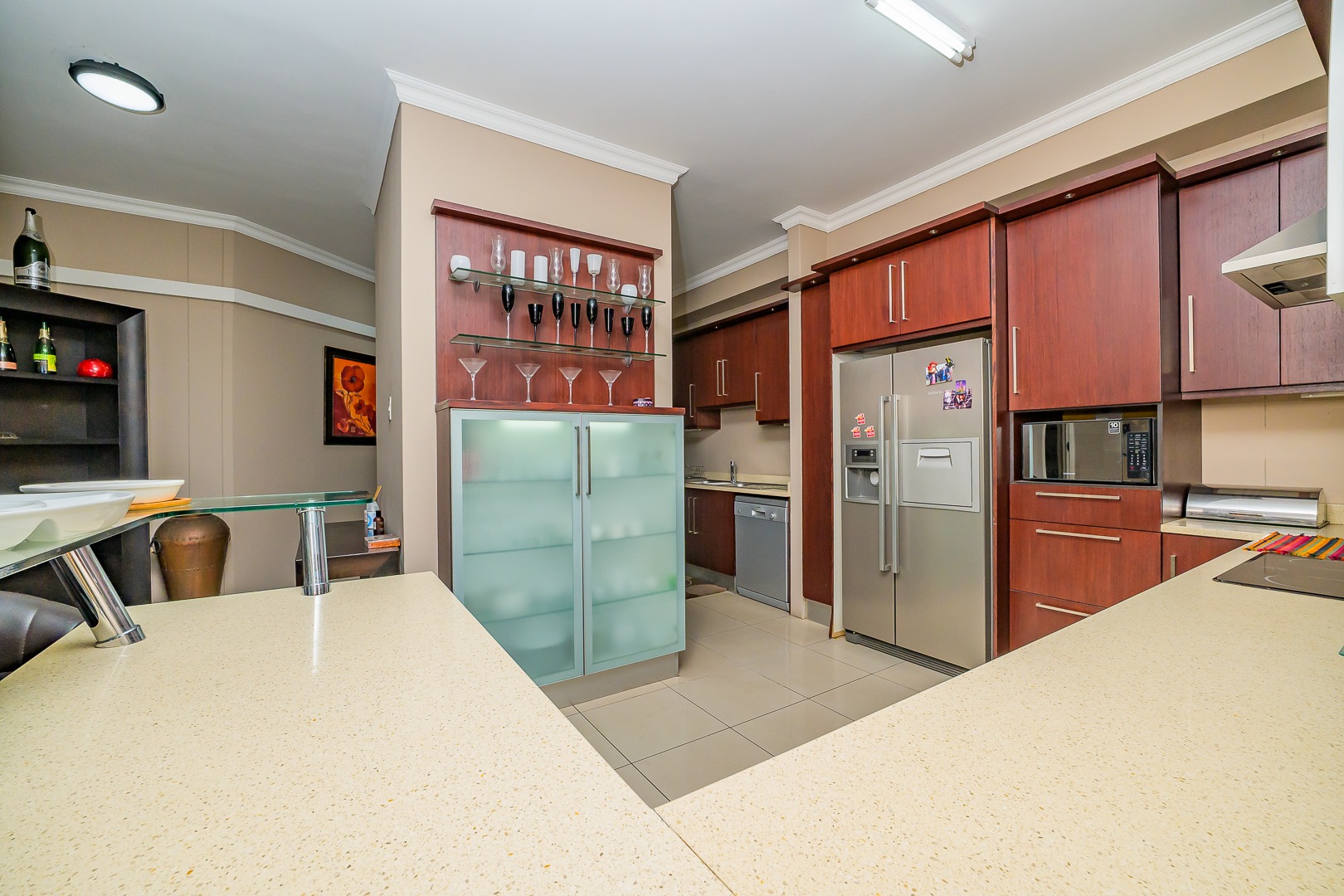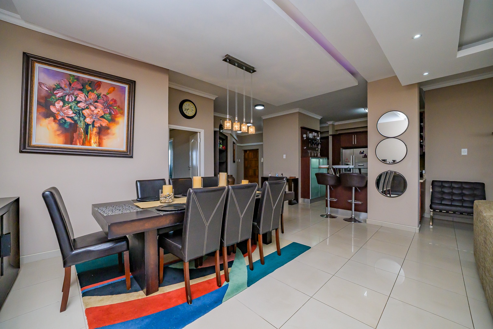 Step into modern coastal living with this expansive 214 sqm apartment located in the vibrant Umhlanga Ridge. The open-plan design seamlessly integrates the spacious lounge and dining areas, featuring contemporary recessed lighting, air conditioning, and elegant tiled flooring throughout. Large windows and sliding doors invite abundant natural light, creating a bright and airy ambiance. The well-appointed kitchen boasts dark wood cabinetry, with quartz countertops and an integrated bar area, perfect for entertaining. A convenient pantry adds to the functionality of this central hub.