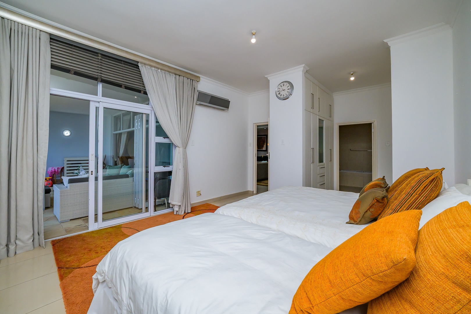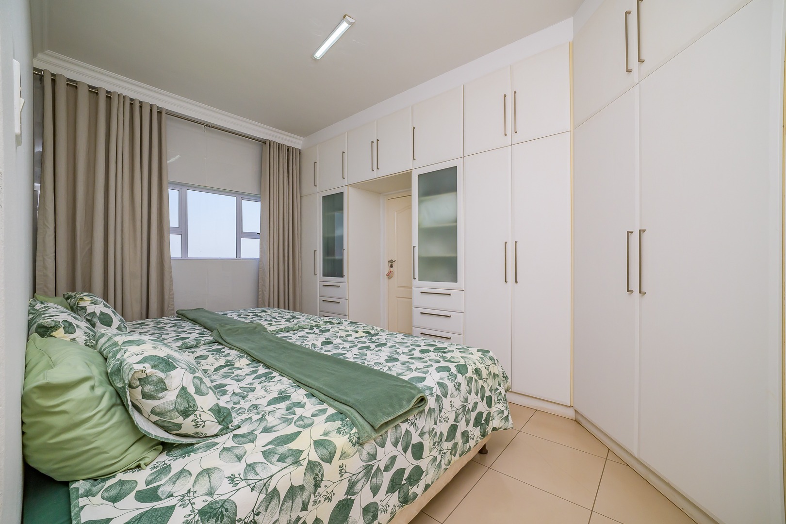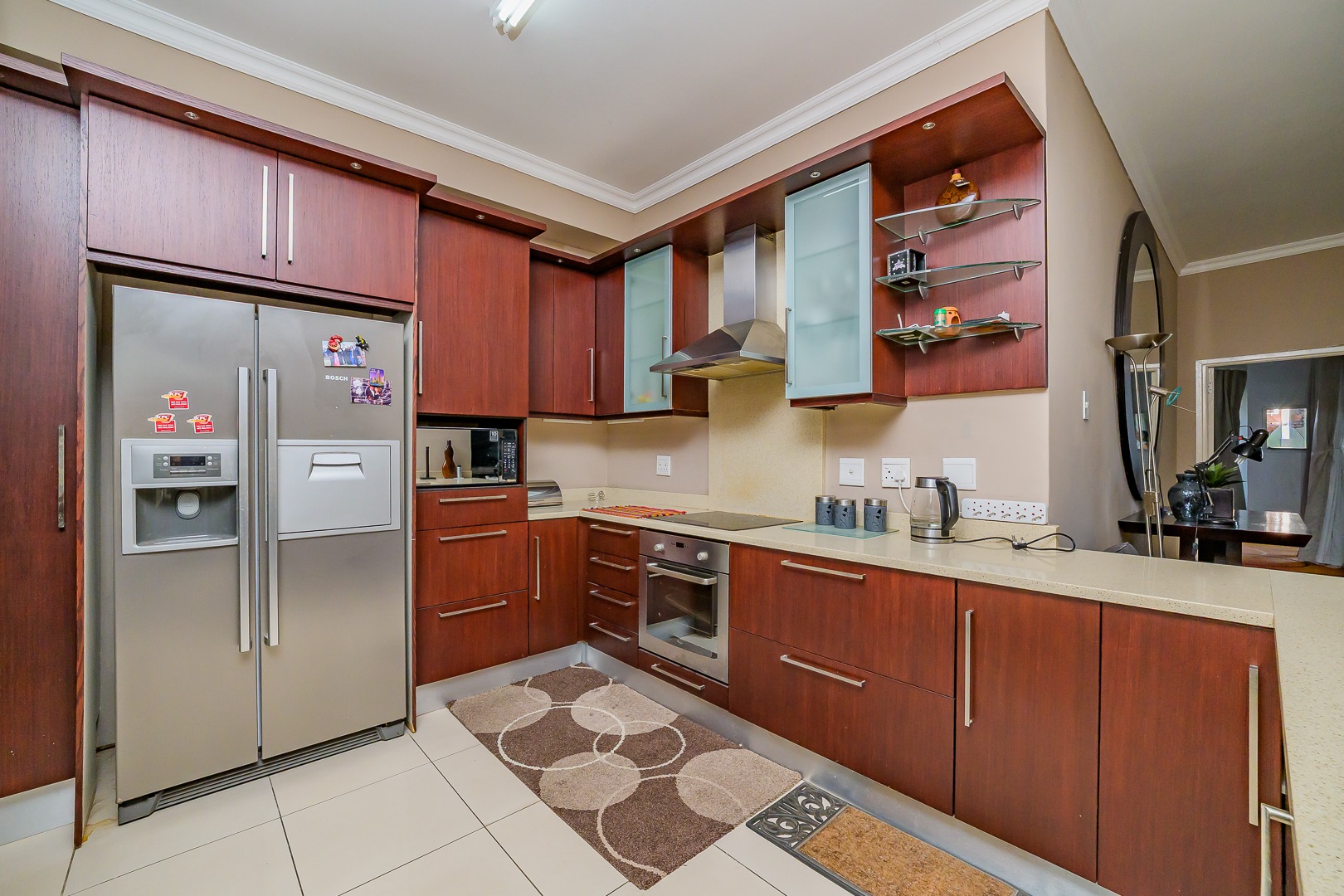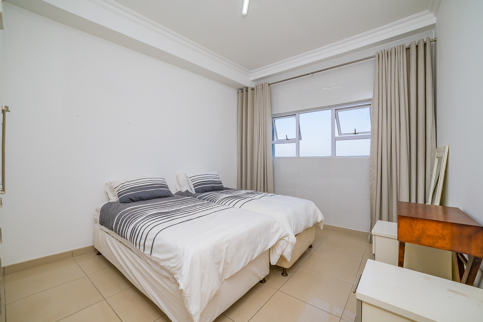 Step into modern coastal living with this expansive 214 sqm apartment located in the vibrant Umhlanga Ridge. The open-plan design seamlessly integrates the spacious lounge and dining areas, featuring contemporary recessed lighting, air conditioning, and elegant tiled flooring throughout. Large windows and sliding doors invite abundant natural light, creating a bright and airy ambiance. The well-appointed kitchen boasts dark wood cabinetry, with quartz countertops and an integrated bar area, perfect for entertaining. A convenient pantry adds to the functionality of this central hub.