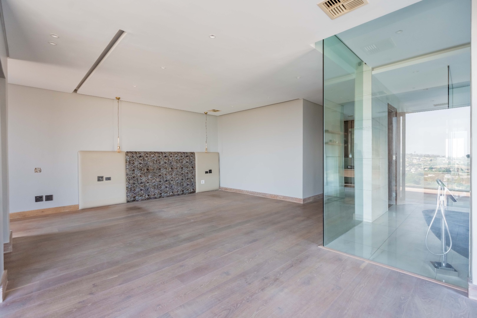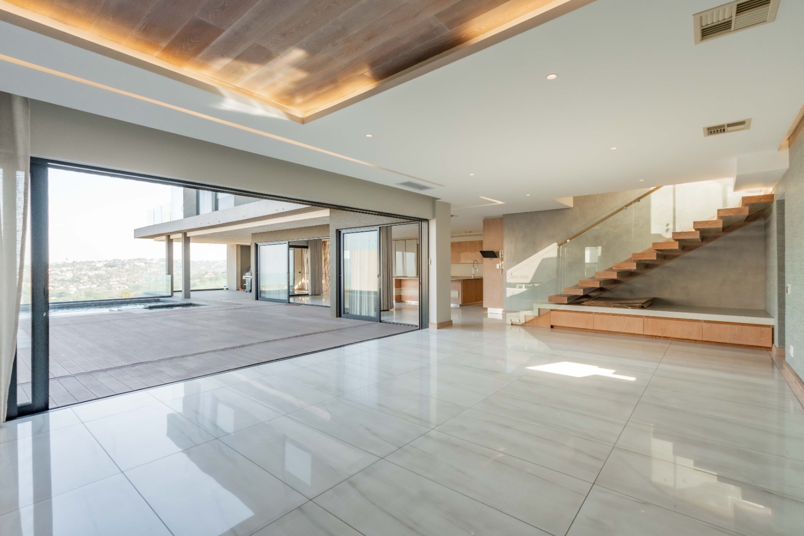Ascending to the principal living floor, the home opens in a grand, uninterrupted sweep of light-filled reception rooms, formal and informal lounges, and an elegant dining space — each framed by soaring glass expanses that dissolve into the horizon. From this elevated vantage point, panoramic vistas of the Indian Ocean, the glittering city skyline, and the harbour mouth unfold in a constantly shifting masterpiece.