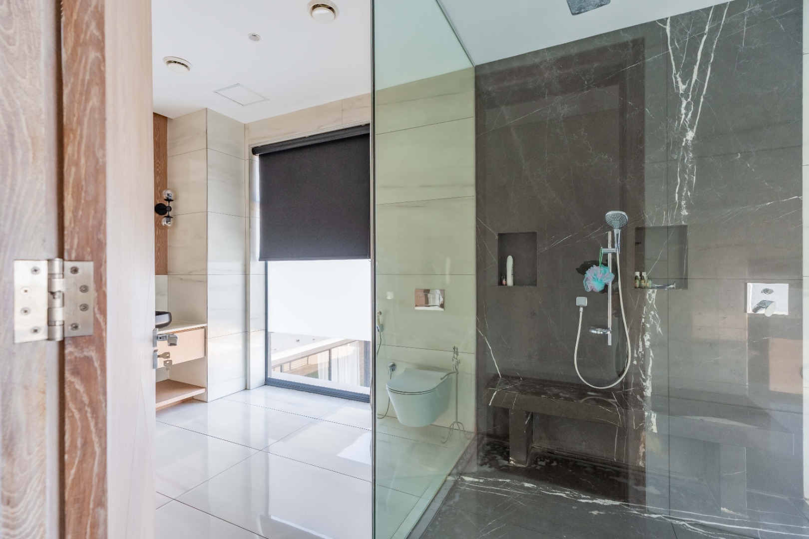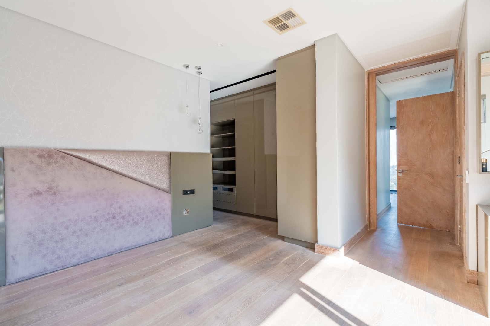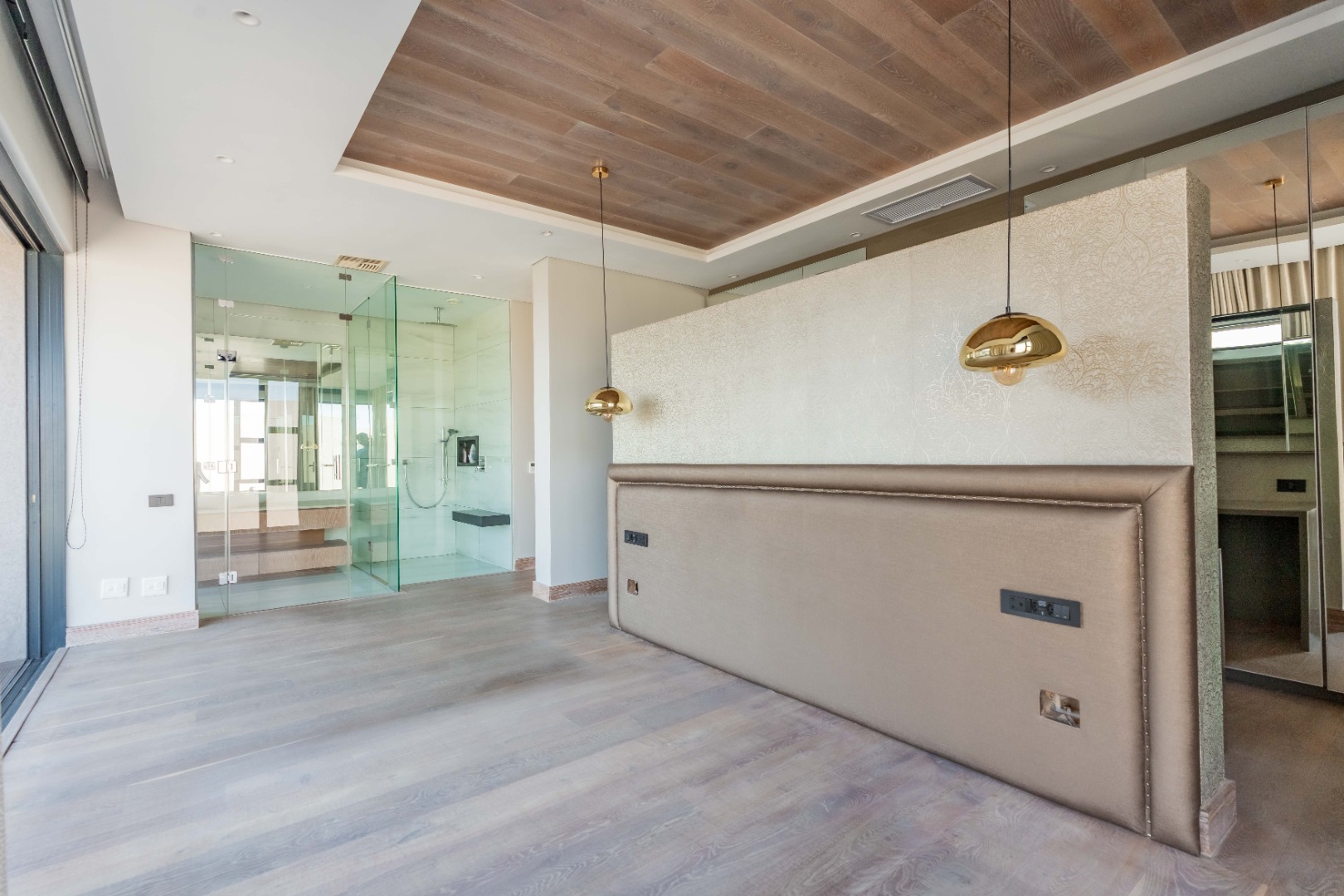 On the uppermost level, five indulgent bedroom suites await, each a private haven with its own luxuriously appointed bathroom. The primary suite is a residence within a residence — complete with an expansive dressing room, spa-like en-suite, and walls of glass opening to a canvas of sea and sky.