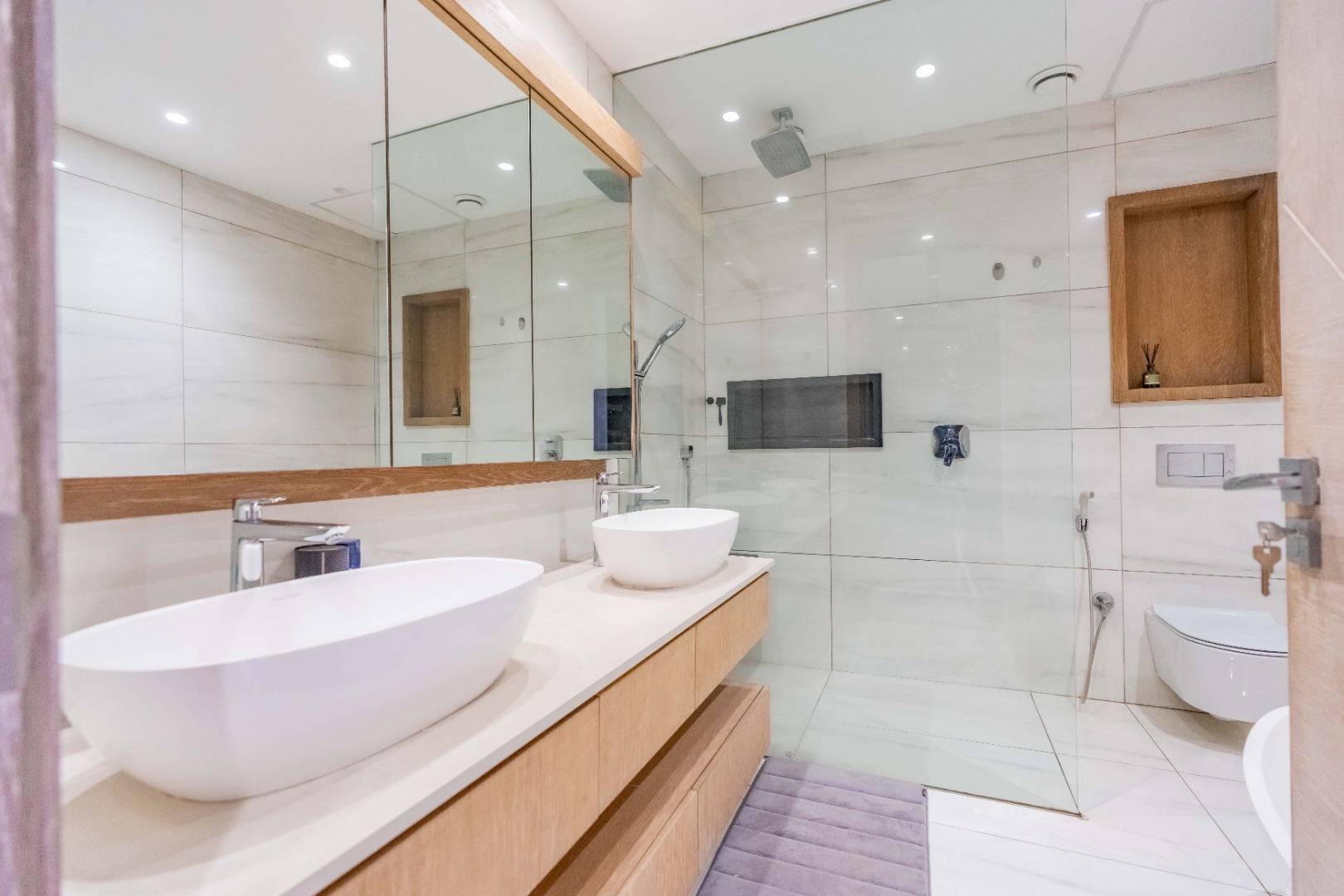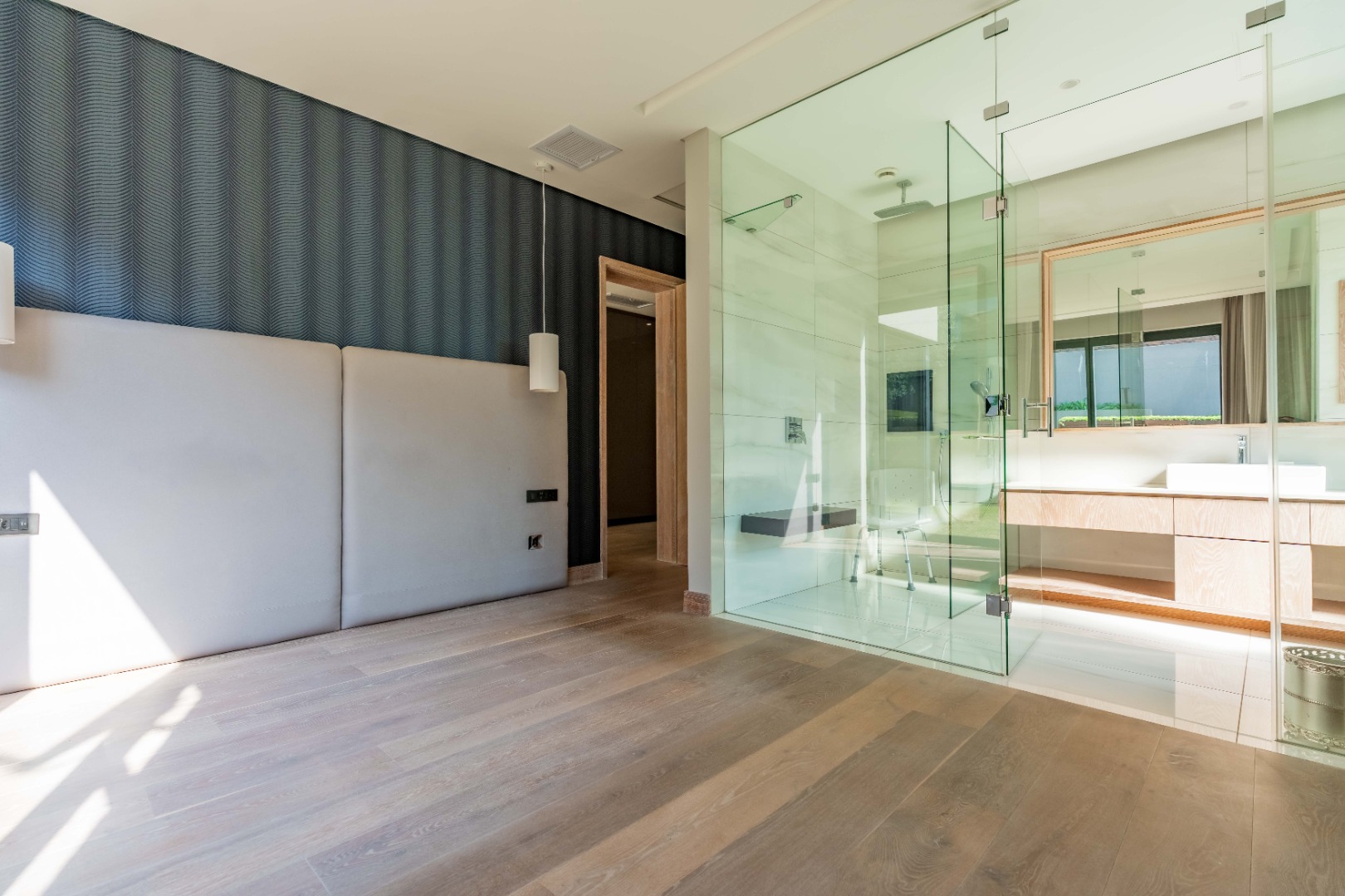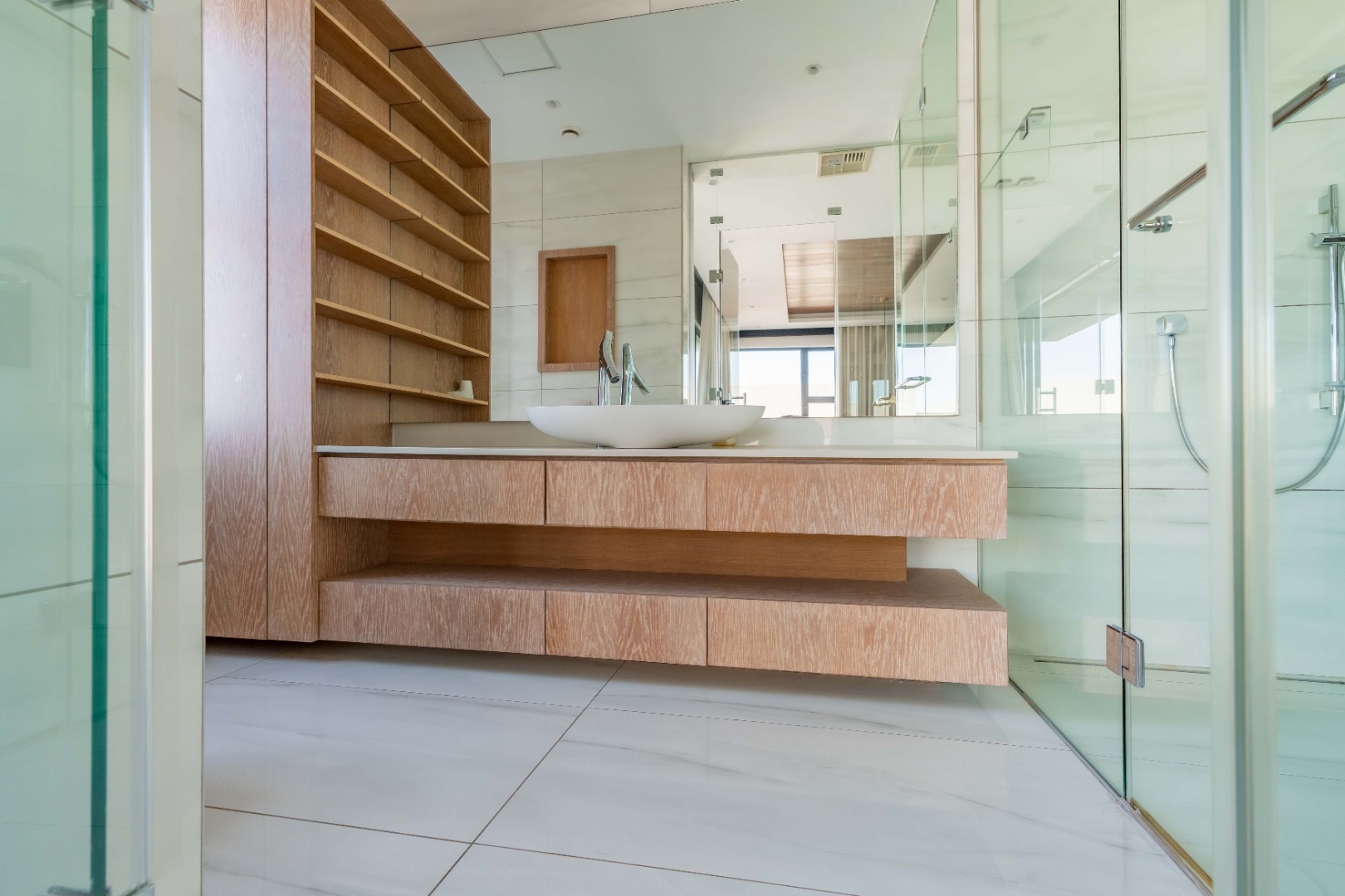 On the uppermost level, five indulgent bedroom suites await, each a private haven with its own luxuriously appointed bathroom. The primary suite is a residence within a residence — complete with an expansive dressing room, spa-like en-suite, and walls of glass opening to a canvas of sea and sky.
