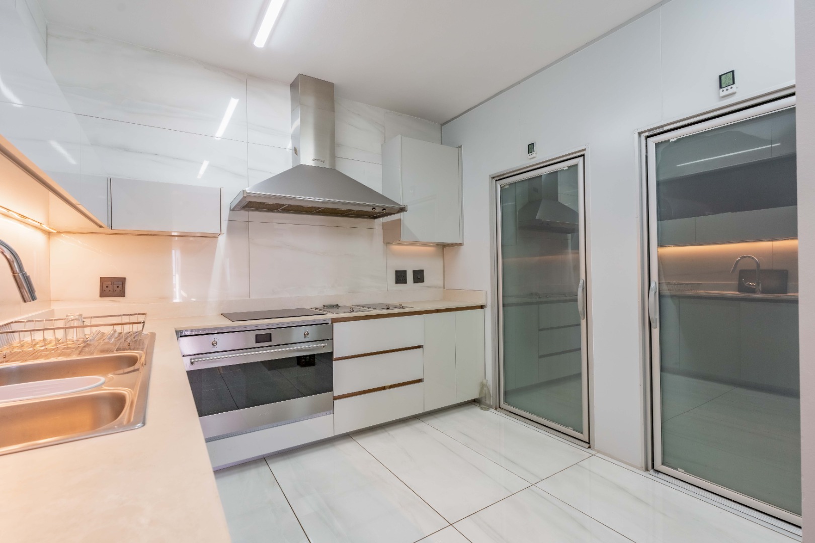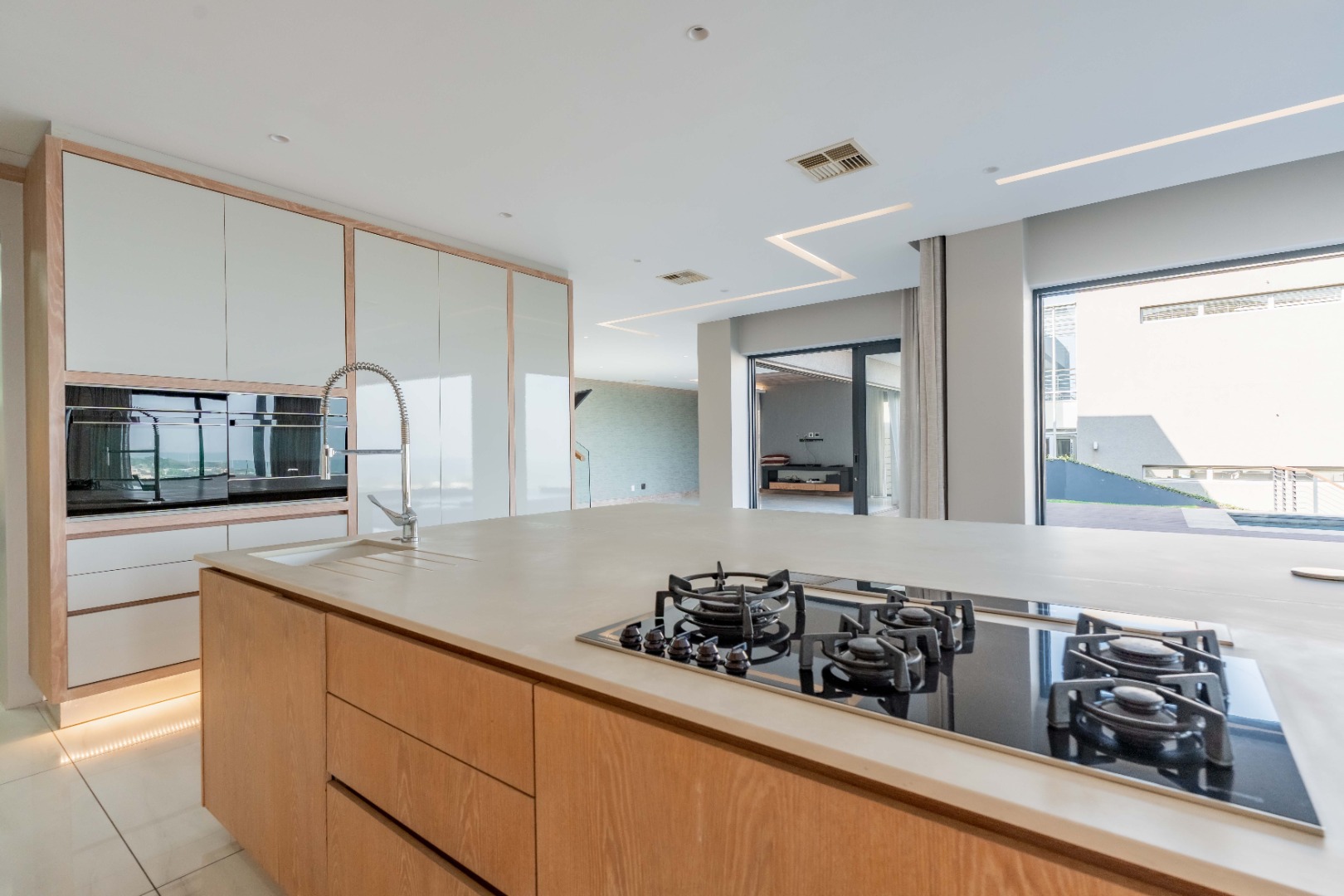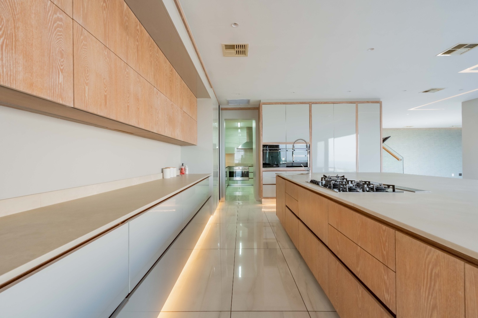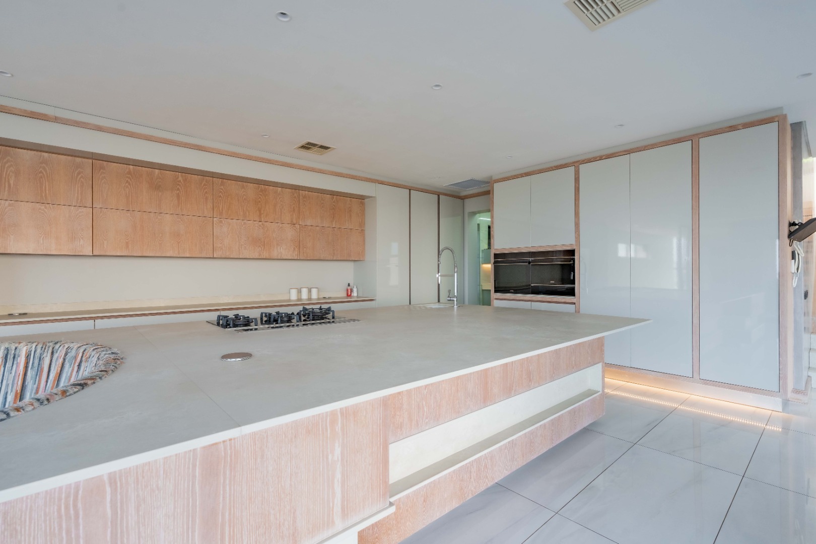 The culinary suite is both sculptural and functional — a bespoke designer kitchen with premium surfaces, integrated appliances, and a fluid connection to the entertainment areas.