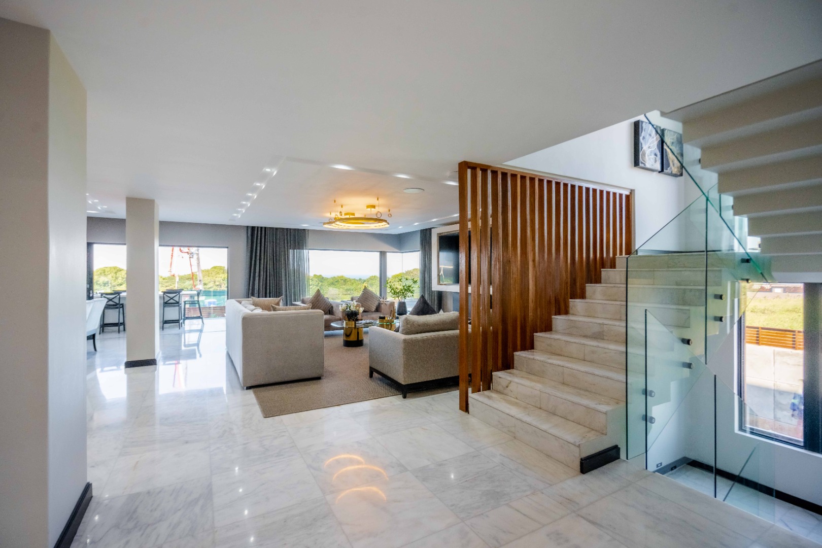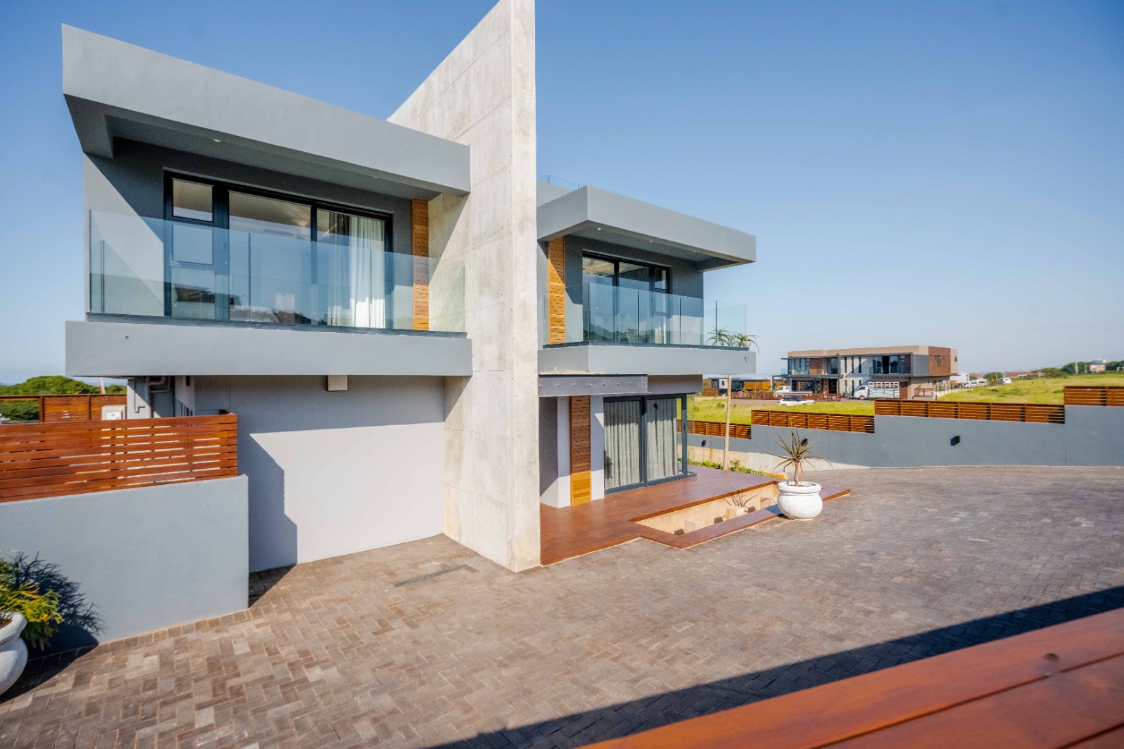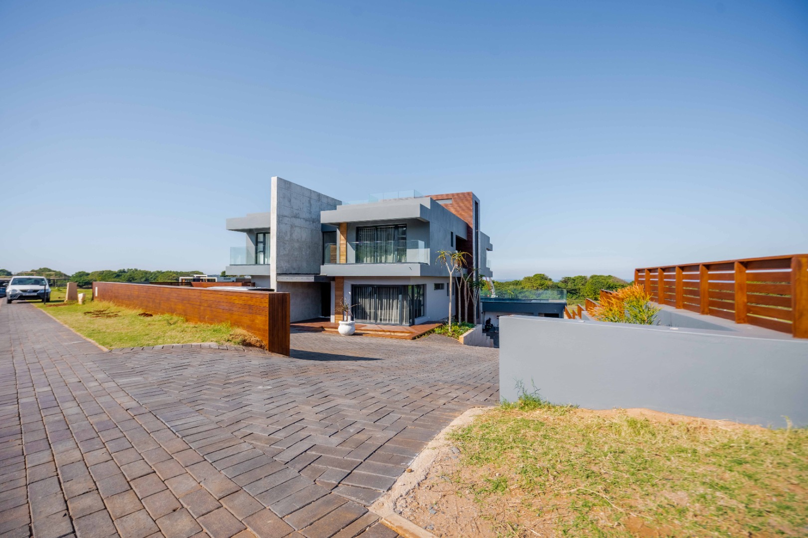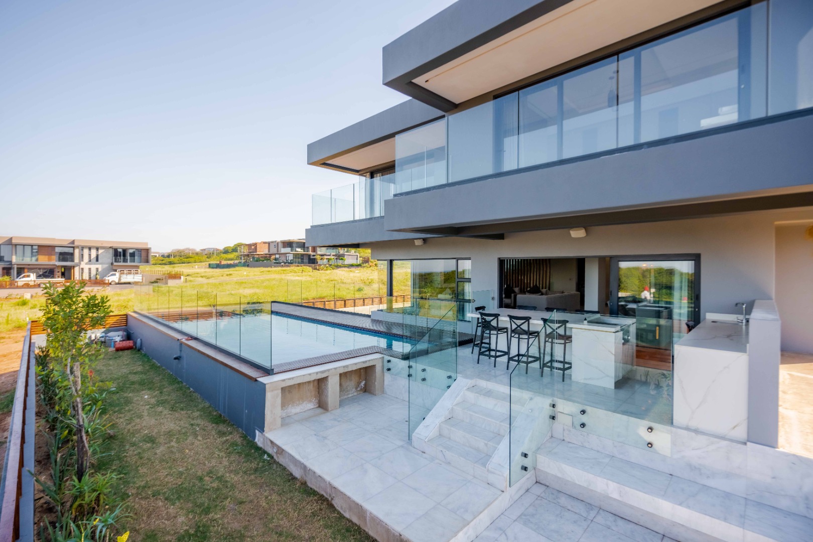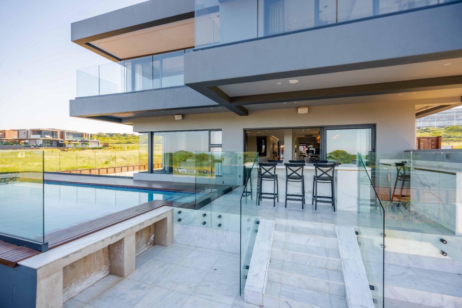 Discover an exquisite modern masterpiece, meticulously designed for opulent living and sophisticated entertaining in the prestigious Umhlanga Ridge. This multi-story residence captivates with its sleek architectural lines, a harmonious blend of grey and wood-paneled exteriors, and expansive glass elements that invite abundant natural light and frame breathtaking panoramic views, including a glimpse of the sea. A grand paved driveway leads to this contemporary sanctuary, setting an immediate tone of refined elegance. Step inside to a world of seamless luxury, where an open-concept layout effortlessly integrates living, dining, and a gourmet kitchen. Adorned with high-end finishes, including polished marble-look surfaces, bespoke cabinetry, and subtle gold accents, the interior exudes a bright and spacious ambiance. The state-of-the-art kitchen boasts a generous island and integrated appliances, perfect for culinary artistry. The residence features six lavish bedrooms, each with its own en-suite bathroom, ensuring ultimate privacy and comfort. Additional amenities include a dedicated study, a family TV room, a convenient pantry, laundry facilities, and ample storage. Embrace an unrivalled outdoor lifestyle with a private infinity pool, complete with elegant wooden decking, and a chic outdoor bar area – ideal for al fresco gatherings. The spacious patio, featuring marble tiles and glass railings, extends the living space outdoors, offering a perfect vantage point for enjoying the scenic surroundings. The property also includes staff quarters, a well-maintained garden, and air conditioning throughout, enhancing comfort and convenience. Nestled within a secure estate, this home offers peace of mind with 24-hour security, a security post, access gates, an alarm system, electric fencing, and security gates. The suburban locale of Umhlanga Ridge in Umhlanga, South Africa, provides a desirable address, combining tranquility with accessibility. Key Features: • Six en-suite bedrooms and six bathrooms • Open-plan living with panoramic and sea views • Gourmet kitchen with high-end finishes • Private infinity pool and outdoor bar • Expansive deck and patio for entertaining • Air conditioning throughout • Staff quarters and dedicated study • Secure estate living with 24-hour security • Ample parking: two garages and fifteen additional spaces