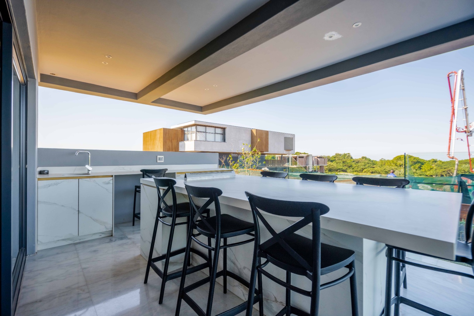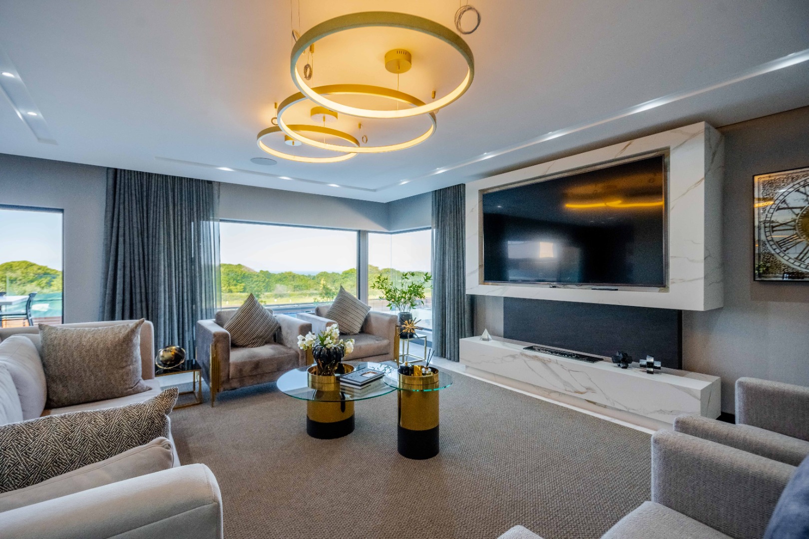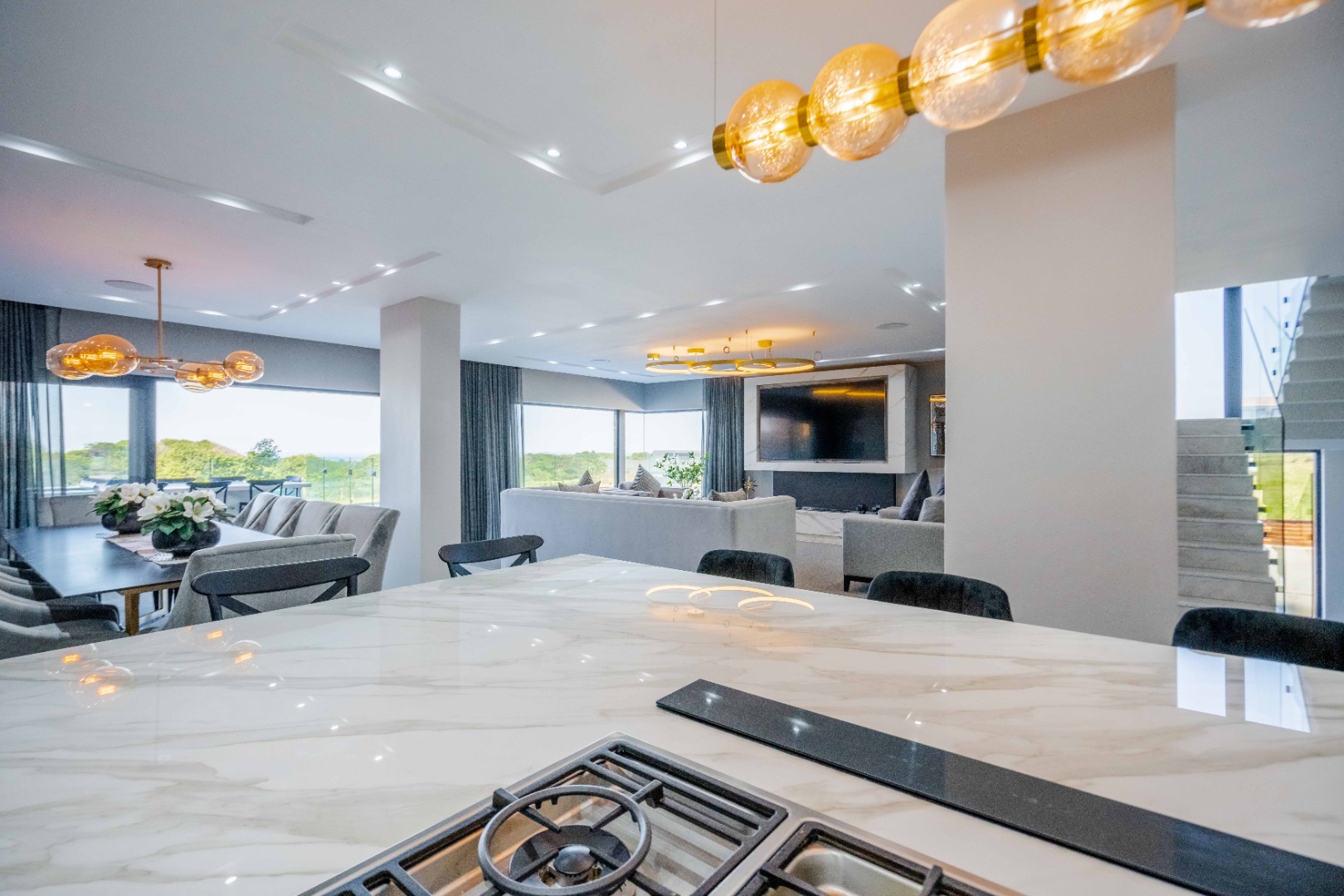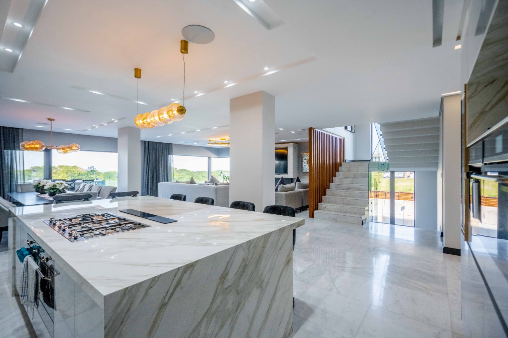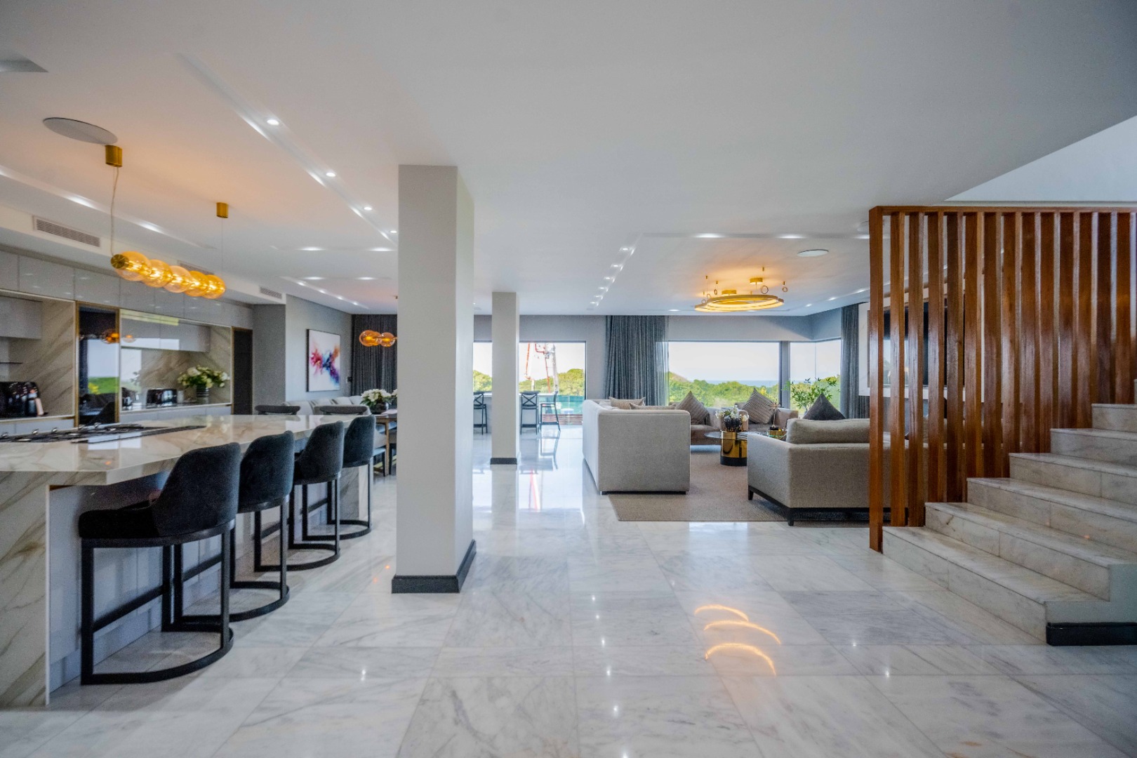 Discover an exquisite modern masterpiece, meticulously designed for opulent living and sophisticated entertaining in the prestigious Umhlanga Ridge. This multi-story residence captivates with its sleek architectural lines, a harmonious blend of grey and wood-paneled exteriors, and expansive glass elements that invite abundant natural light and frame breathtaking panoramic views, including a glimpse of the sea. A grand paved driveway leads to this contemporary sanctuary, setting an immediate tone of refined elegance. Step inside to a world of seamless luxury, where an open-concept layout effortlessly integrates living, dining, and a gourmet kitchen. Adorned with high-end finishes, including polished marble-look surfaces, bespoke cabinetry, and subtle gold accents, the interior exudes a bright and spacious ambiance. The state-of-the-art kitchen boasts a generous island and integrated appliances, perfect for culinary artistry. The residence features six lavish bedrooms, each with its own en-suite bathroom, ensuring ultimate privacy and comfort. Additional amenities include a dedicated study, a family TV room, a convenient pantry, laundry facilities, and ample storage. Embrace an unrivalled outdoor lifestyle with a private infinity pool, complete with elegant wooden decking, and a chic outdoor bar area – ideal for al fresco gatherings. The spacious patio, featuring marble tiles and glass railings, extends the living space outdoors, offering a perfect vantage point for enjoying the scenic surroundings. The property also includes staff quarters, a well-maintained garden, and air conditioning throughout, enhancing comfort and convenience. Nestled within a secure estate, this home offers peace of mind with 24-hour security, a security post, access gates, an alarm system, electric fencing, and security gates. The suburban locale of Umhlanga Ridge in Umhlanga, South Africa, provides a desirable address, combining tranquility with accessibility. Key Features: • Six en-suite bedrooms and six bathrooms • Open-plan living with panoramic and sea views • Gourmet kitchen with high-end finishes • Private infinity pool and outdoor bar • Expansive deck and patio for entertaining • Air conditioning throughout • Staff quarters and dedicated study • Secure estate living with 24-hour security • Ample parking: two garages and fifteen additional spaces
