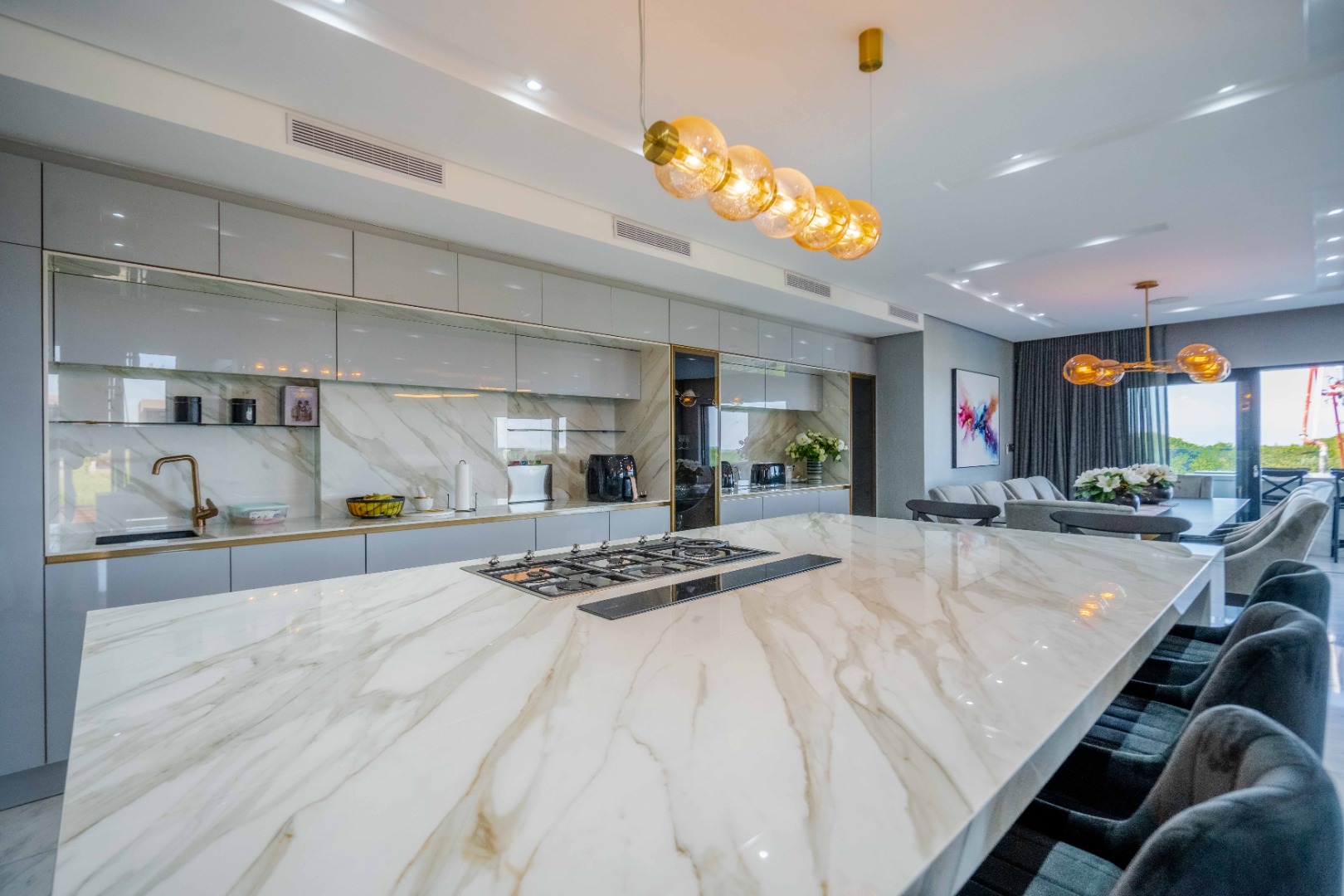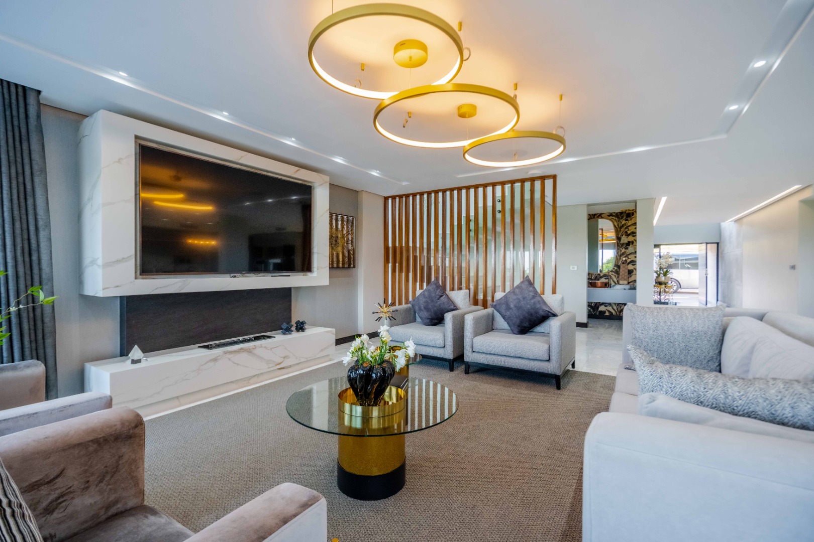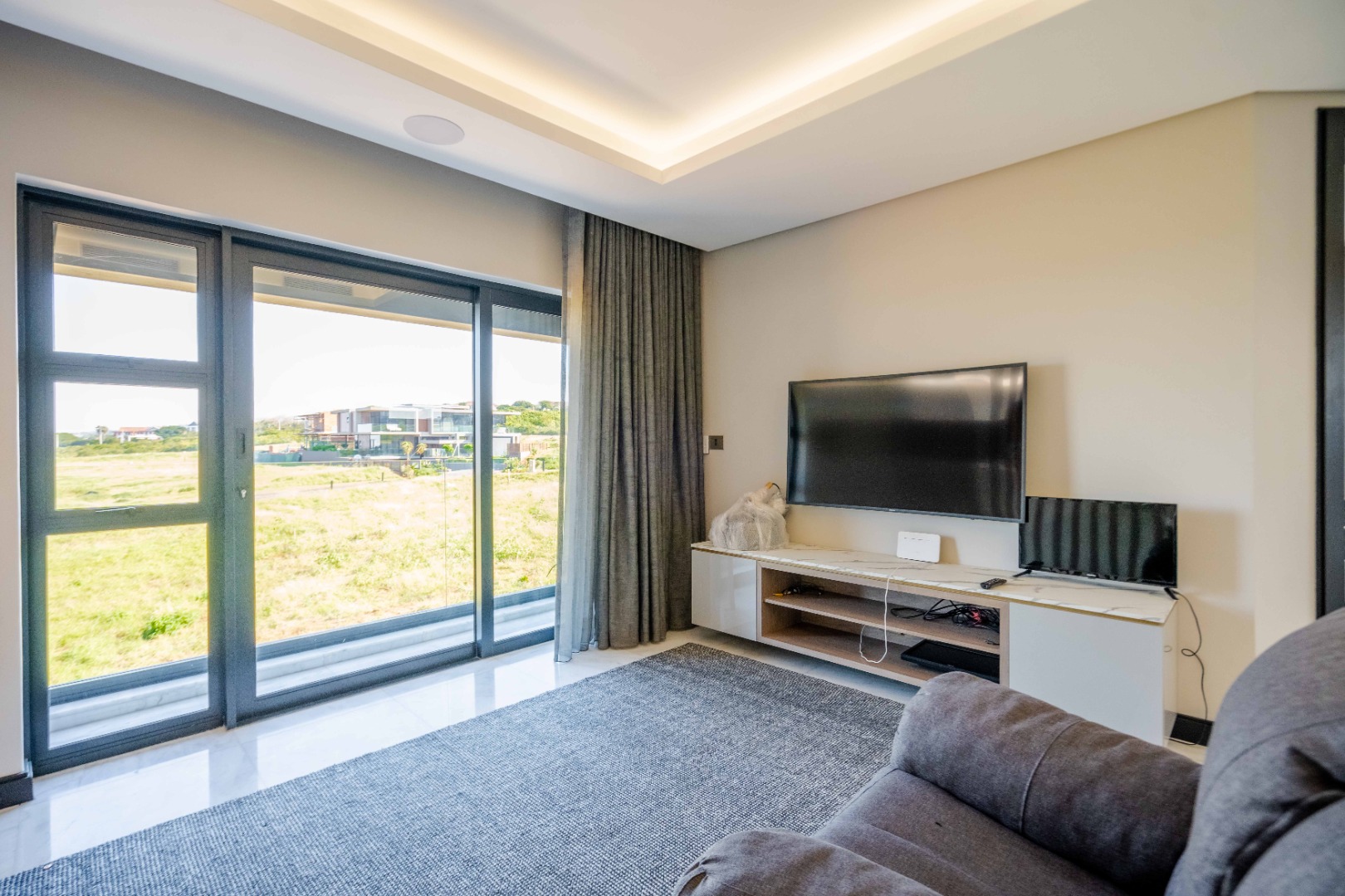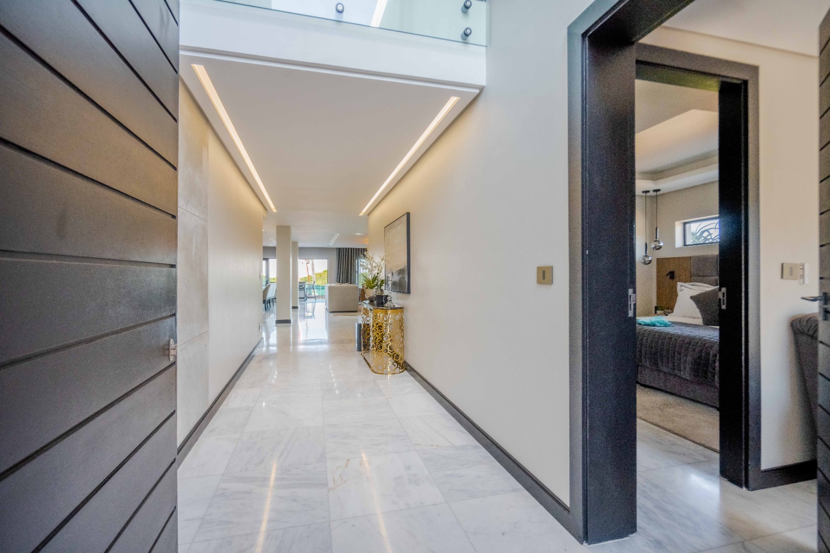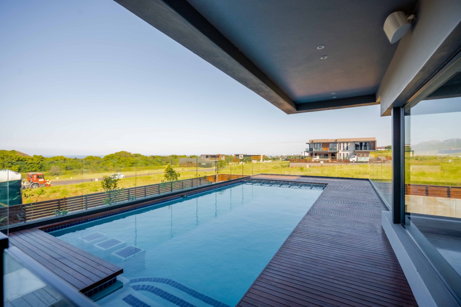 Discover an exquisite modern masterpiece, meticulously designed for opulent living and sophisticated entertaining in the prestigious Umhlanga Ridge. This multi-story residence captivates with its sleek architectural lines, a harmonious blend of grey and wood-paneled exteriors, and expansive glass elements that invite abundant natural light and frame breathtaking panoramic views, including a glimpse of the sea. A grand paved driveway leads to this contemporary sanctuary, setting an immediate tone of refined elegance. Step inside to a world of seamless luxury, where an open-concept layout effortlessly integrates living, dining, and a gourmet kitchen. Adorned with high-end finishes, including polished marble-look surfaces, bespoke cabinetry, and subtle gold accents, the interior exudes a bright and spacious ambiance. The state-of-the-art kitchen boasts a generous island and integrated appliances, perfect for culinary artistry. The residence features six lavish bedrooms, each with its own en-suite bathroom, ensuring ultimate privacy and comfort. Additional amenities include a dedicated study, a family TV room, a convenient pantry, laundry facilities, and ample storage. Embrace an unrivalled outdoor lifestyle with a private infinity pool, complete with elegant wooden decking, and a chic outdoor bar area – ideal for al fresco gatherings. The spacious patio, featuring marble tiles and glass railings, extends the living space outdoors, offering a perfect vantage point for enjoying the scenic surroundings. The property also includes staff quarters, a well-maintained garden, and air conditioning throughout, enhancing comfort and convenience. Nestled within a secure estate, this home offers peace of mind with 24-hour security, a security post, access gates, an alarm system, electric fencing, and security gates. The suburban locale of Umhlanga Ridge in Umhlanga, South Africa, provides a desirable address, combining tranquility with accessibility. Key Features: • Six en-suite bedrooms and six bathrooms • Open-plan living with panoramic and sea views • Gourmet kitchen with high-end finishes • Private infinity pool and outdoor bar • Expansive deck and patio for entertaining • Air conditioning throughout • Staff quarters and dedicated study • Secure estate living with 24-hour security • Ample parking: two garages and fifteen additional spaces