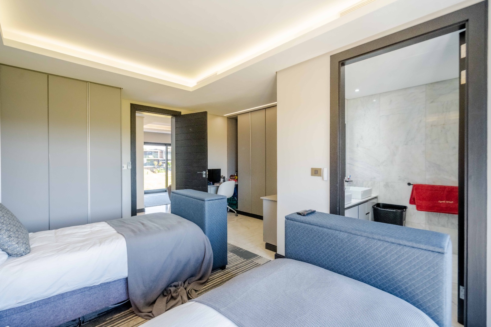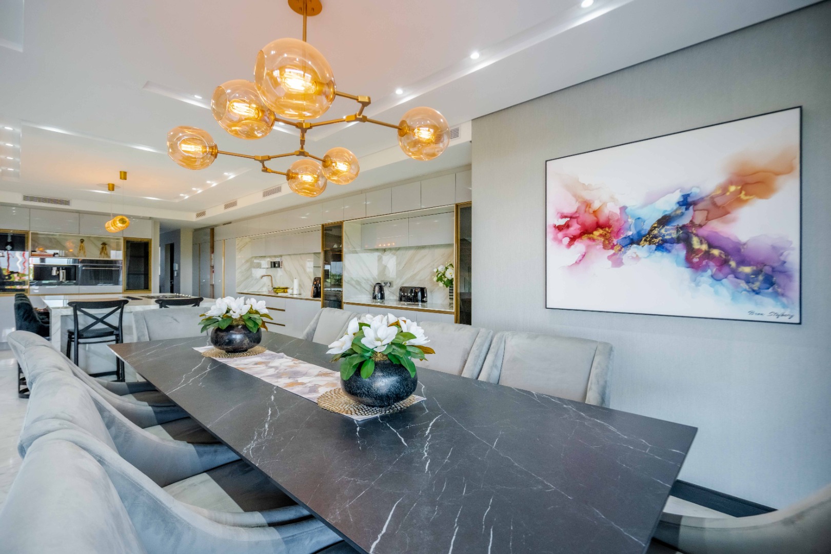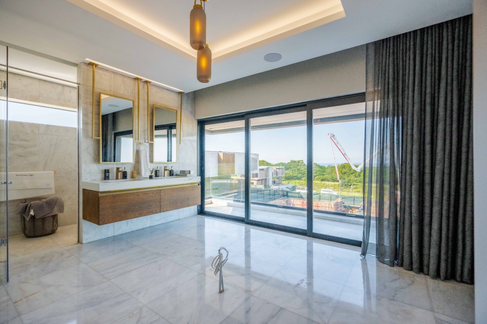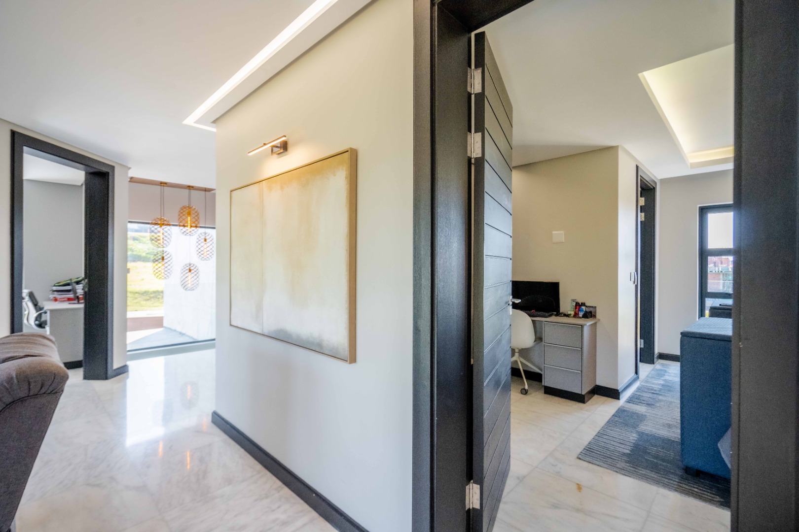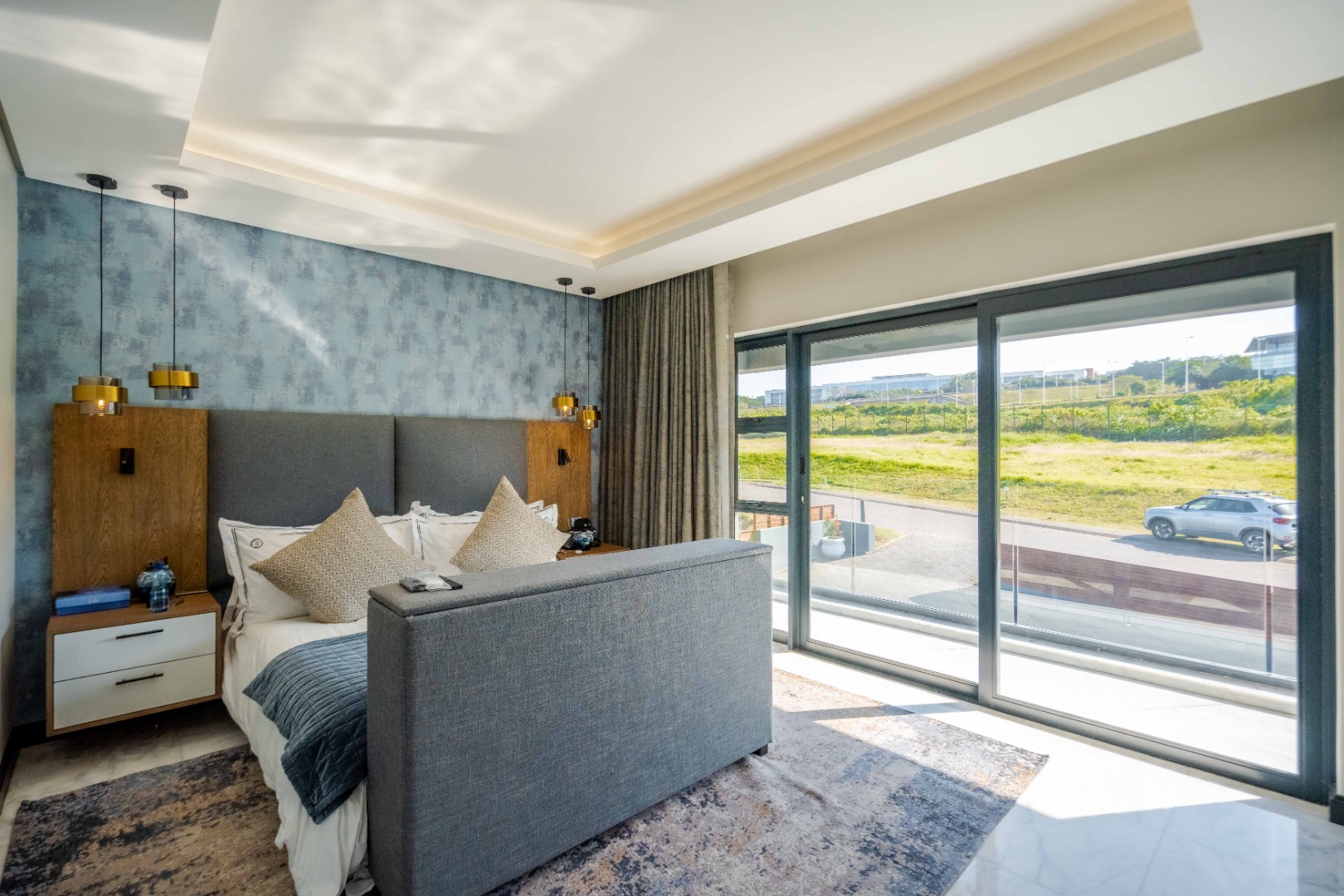 Discover an exquisite modern masterpiece, meticulously designed for opulent living and sophisticated entertaining in the prestigious Umhlanga Ridge. This multi-story residence captivates with its sleek architectural lines, a harmonious blend of grey and wood-paneled exteriors, and expansive glass elements that invite abundant natural light and frame breathtaking panoramic views, including a glimpse of the sea. A grand paved driveway leads to this contemporary sanctuary, setting an immediate tone of refined elegance. Step inside to a world of seamless luxury, where an open-concept layout effortlessly integrates living, dining, and a gourmet kitchen. Adorned with high-end finishes, including polished marble-look surfaces, bespoke cabinetry, and subtle gold accents, the interior exudes a bright and spacious ambiance. The state-of-the-art kitchen boasts a generous island and integrated appliances, perfect for culinary artistry. The residence features six lavish bedrooms, each with its own en-suite bathroom, ensuring ultimate privacy and comfort. Additional amenities include a dedicated study, a family TV room, a convenient pantry, laundry facilities, and ample storage. Embrace an unrivalled outdoor lifestyle with a private infinity pool, complete with elegant wooden decking, and a chic outdoor bar area – ideal for al fresco gatherings. The spacious patio, featuring marble tiles and glass railings, extends the living space outdoors, offering a perfect vantage point for enjoying the scenic surroundings. The property also includes staff quarters, a well-maintained garden, and air conditioning throughout, enhancing comfort and convenience. Nestled within a secure estate, this home offers peace of mind with 24-hour security, a security post, access gates, an alarm system, electric fencing, and security gates. The suburban locale of Umhlanga Ridge in Umhlanga, South Africa, provides a desirable address, combining tranquility with accessibility. Key Features: • Six en-suite bedrooms and six bathrooms • Open-plan living with panoramic and sea views • Gourmet kitchen with high-end finishes • Private infinity pool and outdoor bar • Expansive deck and patio for entertaining • Air conditioning throughout • Staff quarters and dedicated study • Secure estate living with 24-hour security • Ample parking: two garages and fifteen additional spaces