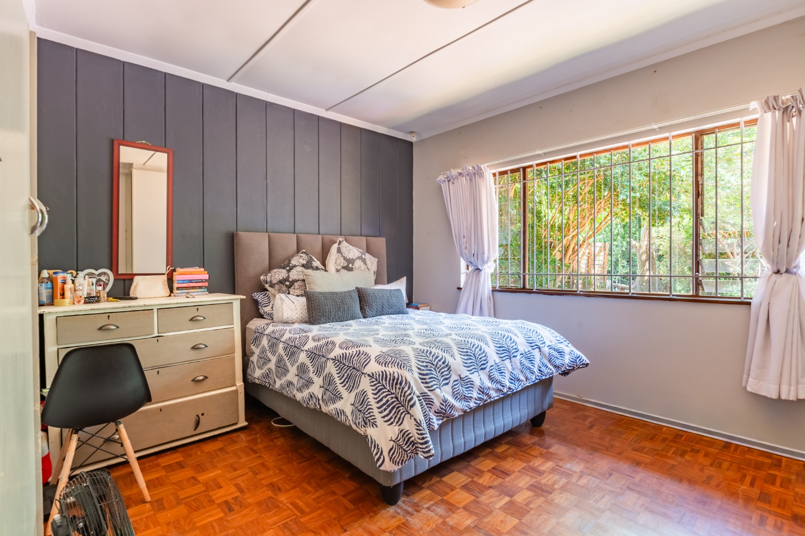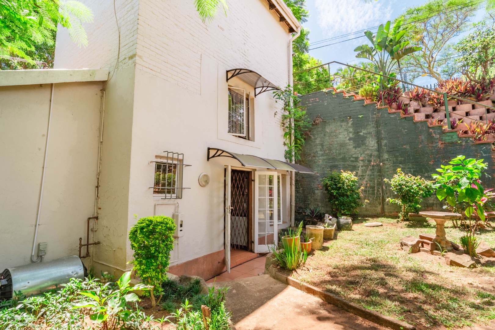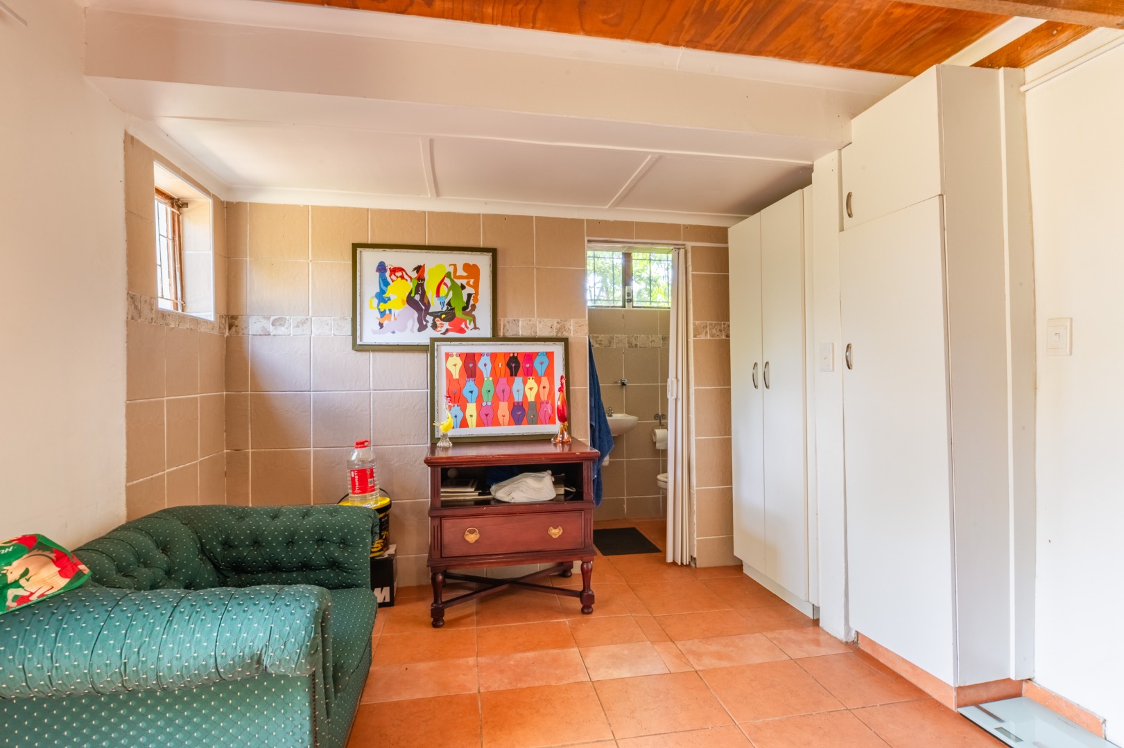 Continuing down a few more steps, you arrive at the main residence set on very level land. The three-bedroom, one-and-a-half-bathroom home is exceptionally neat and well cared for, with a full bathroom that includes both a bath and shower and a separate loo. Inside, the home boasts modern flooring, a spacious kitchen, and a separate scullery, offering both practicality and style.