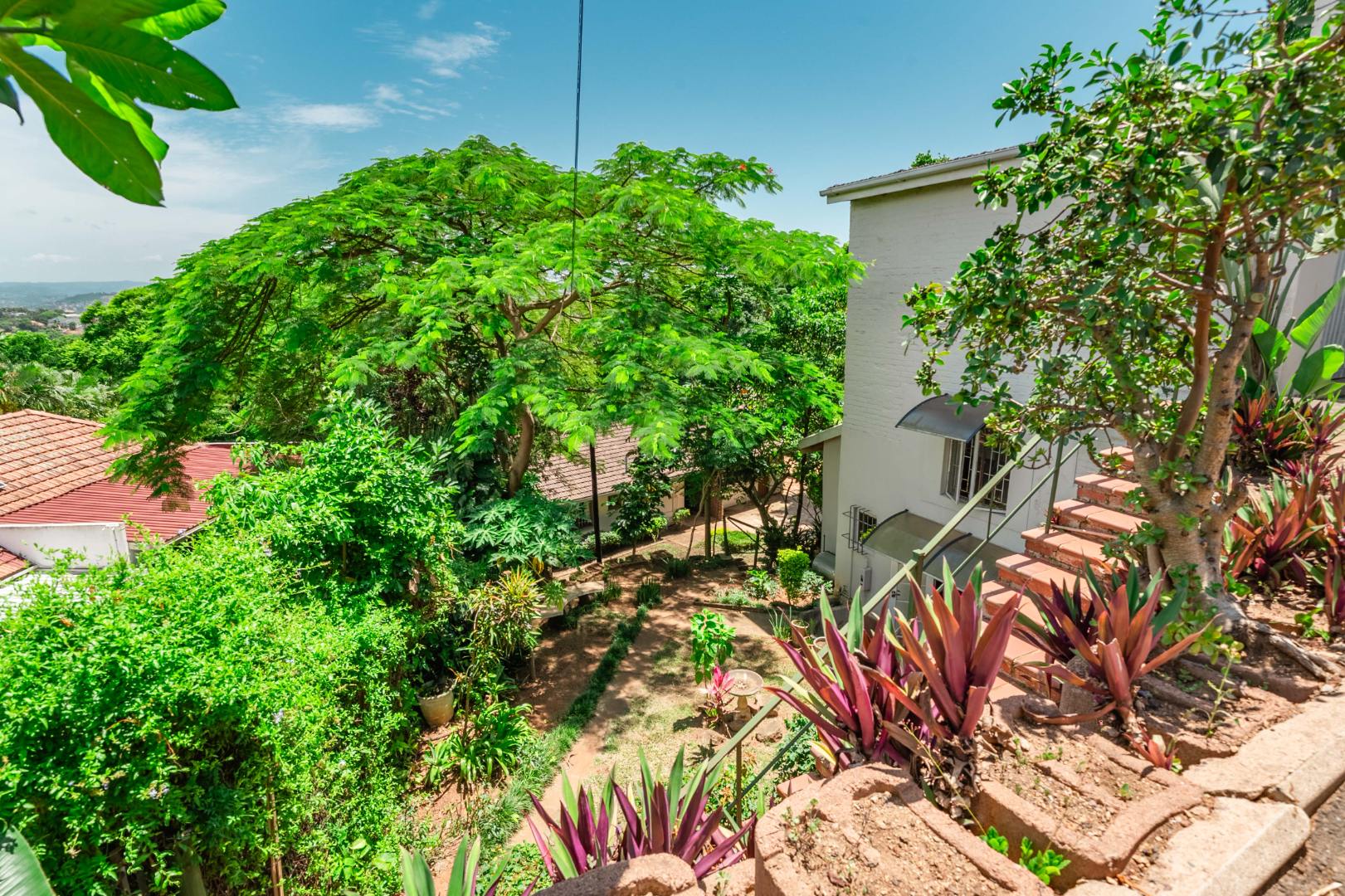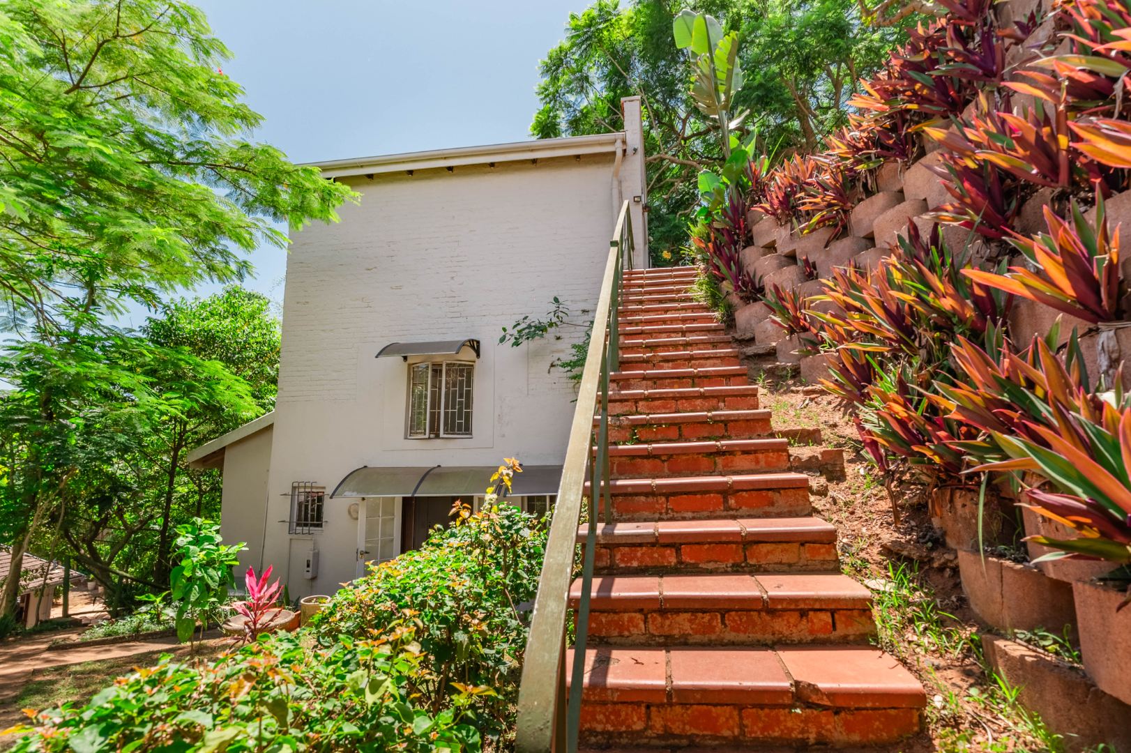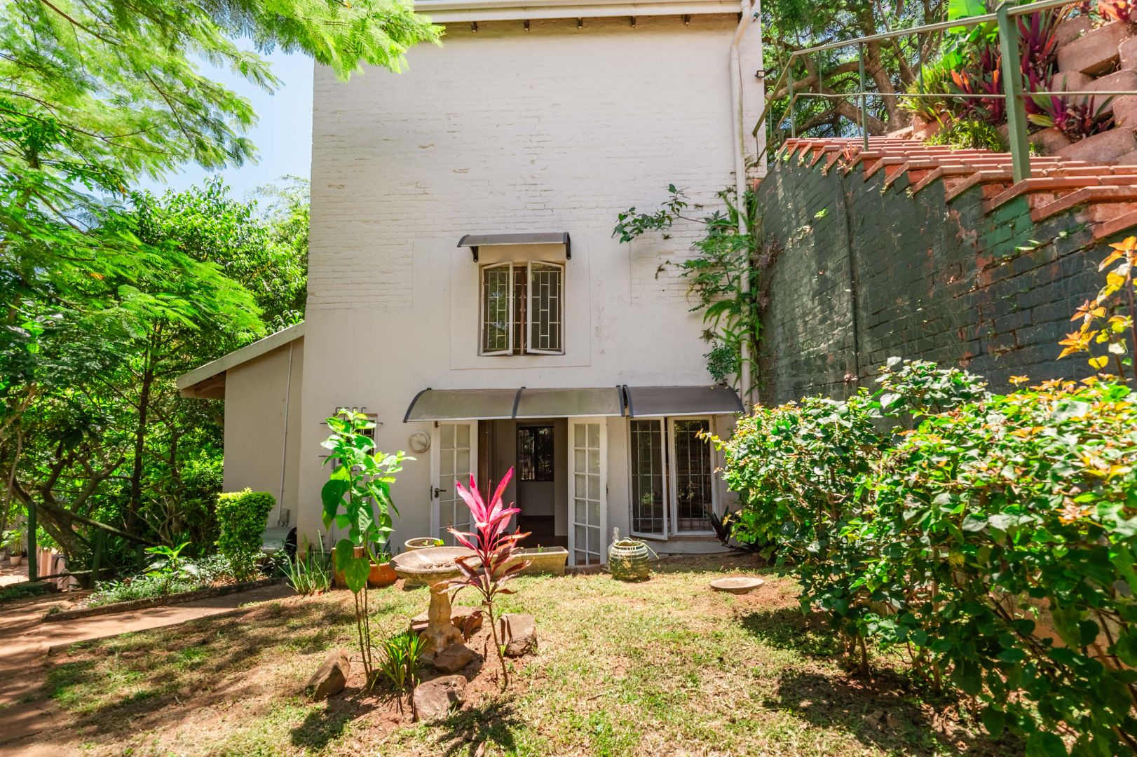 Continuing down a few more steps, you arrive at the main residence set on very level land. The three-bedroom, one-and-a-half-bathroom home is exceptionally neat and well cared for, with a full bathroom that includes both a bath and shower and a separate loo. Inside, the home boasts modern flooring, a spacious kitchen, and a separate scullery, offering both practicality and style.