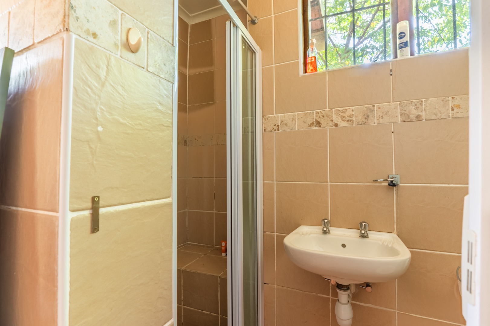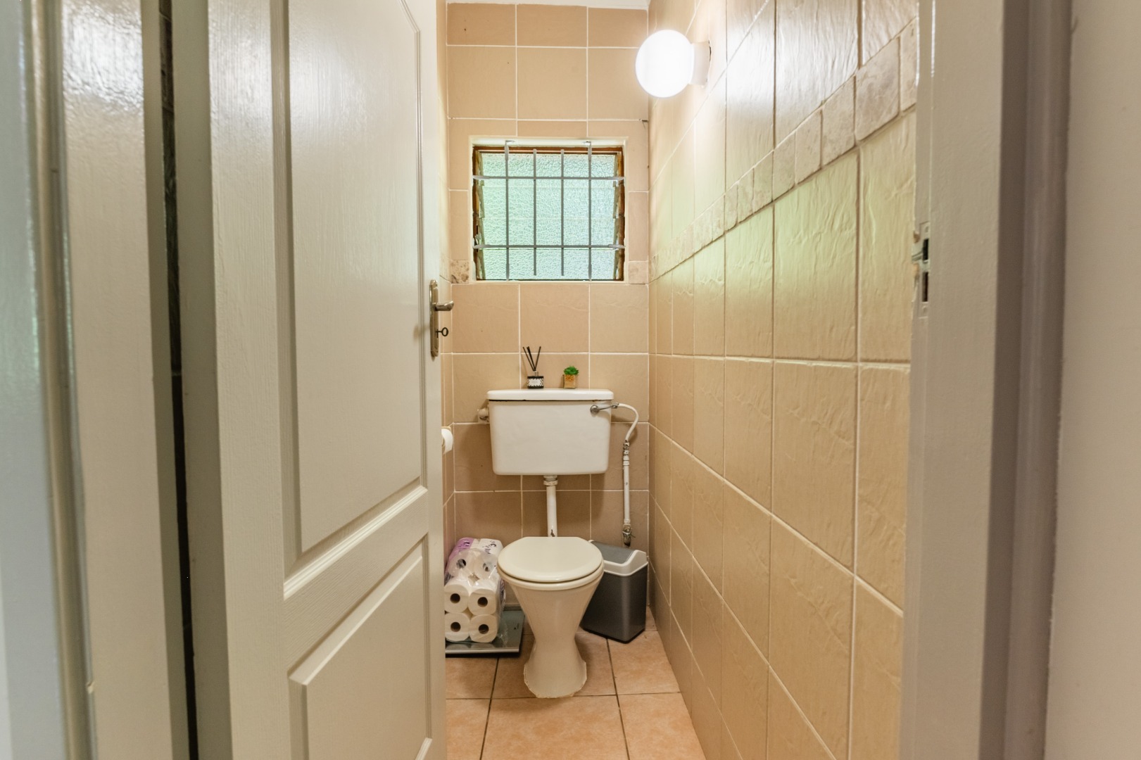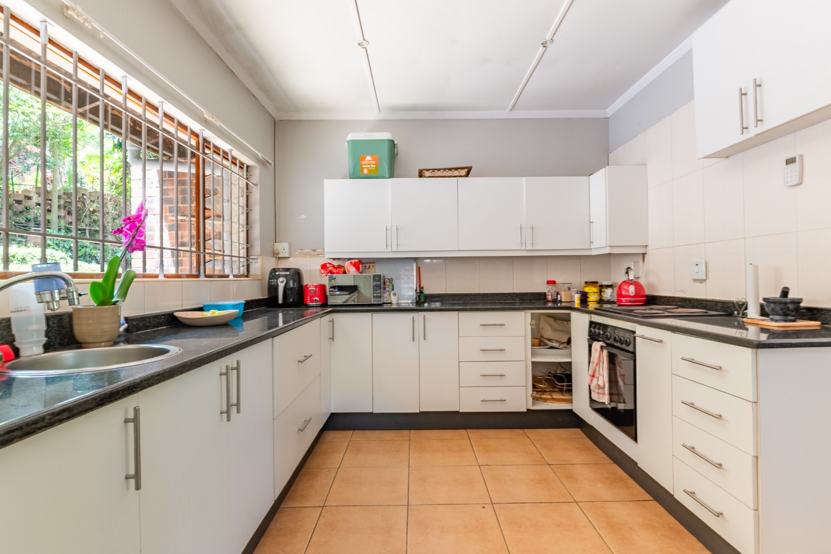Continuing down a few more steps, you arrive at the main residence set on very level land. The three-bedroom, one-and-a-half-bathroom home is exceptionally neat and well cared for, with a full bathroom that includes both a bath and shower and a separate loo. Inside, the home boasts modern flooring, a spacious kitchen, and a separate scullery, offering both practicality and style.