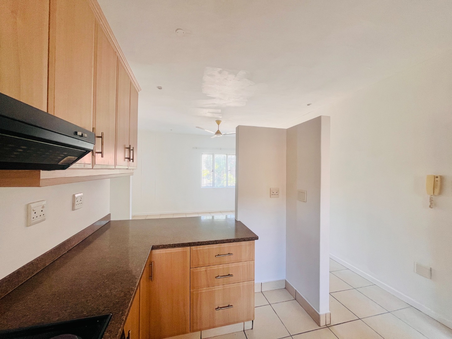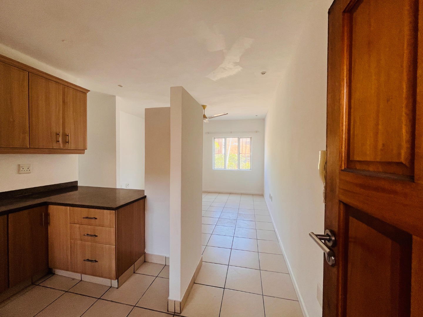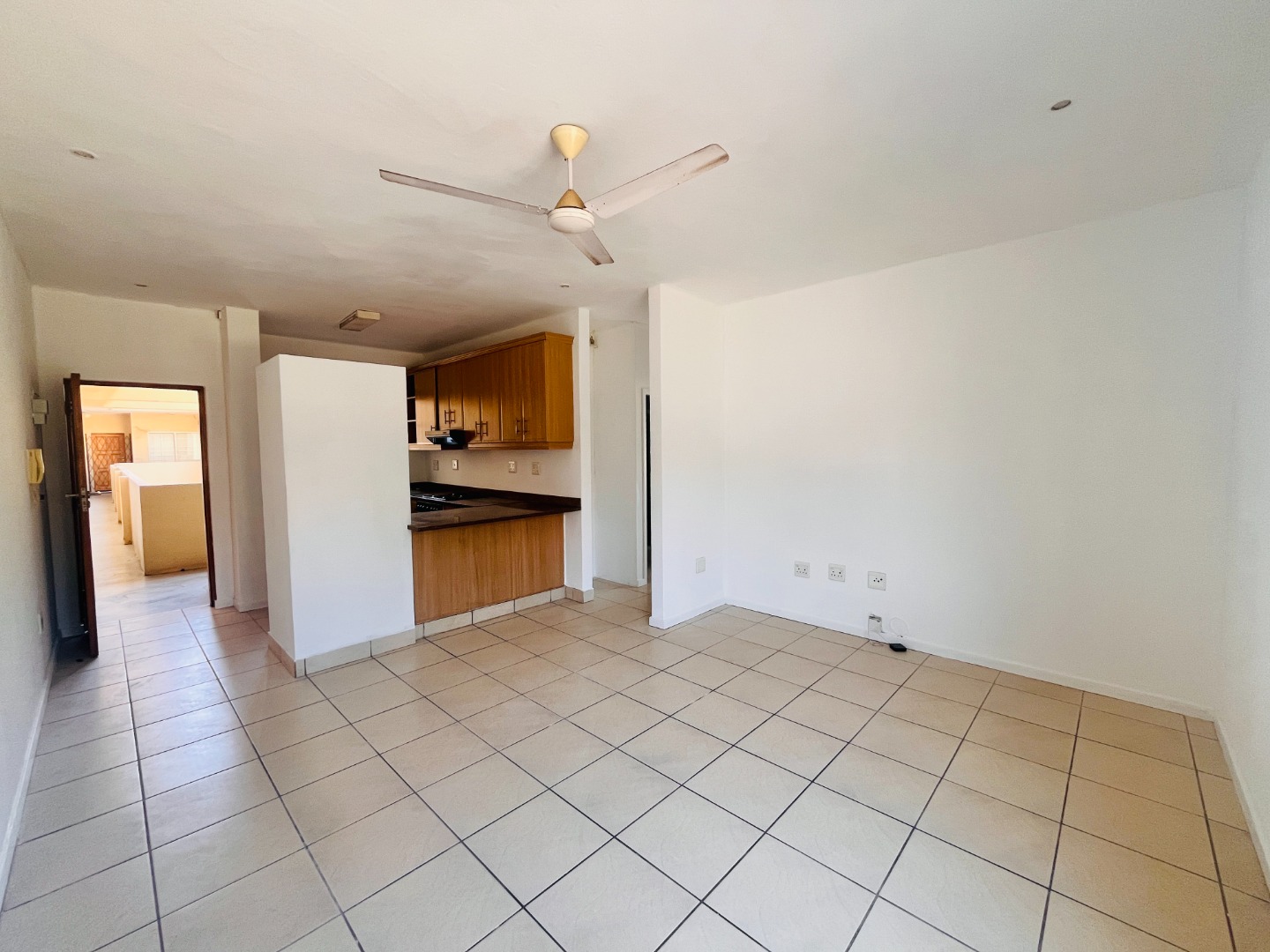 Two Tiled Bedrooms with Built-in-Cupboards and Ceiling Fans. Kitchen has ample Storage Cupboards, Granite Tops and Plumbing for a Washing Machine. Open-plan Lounge and Dining Area.