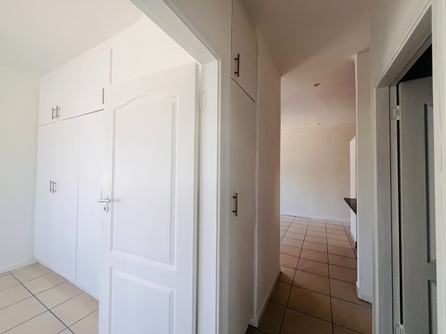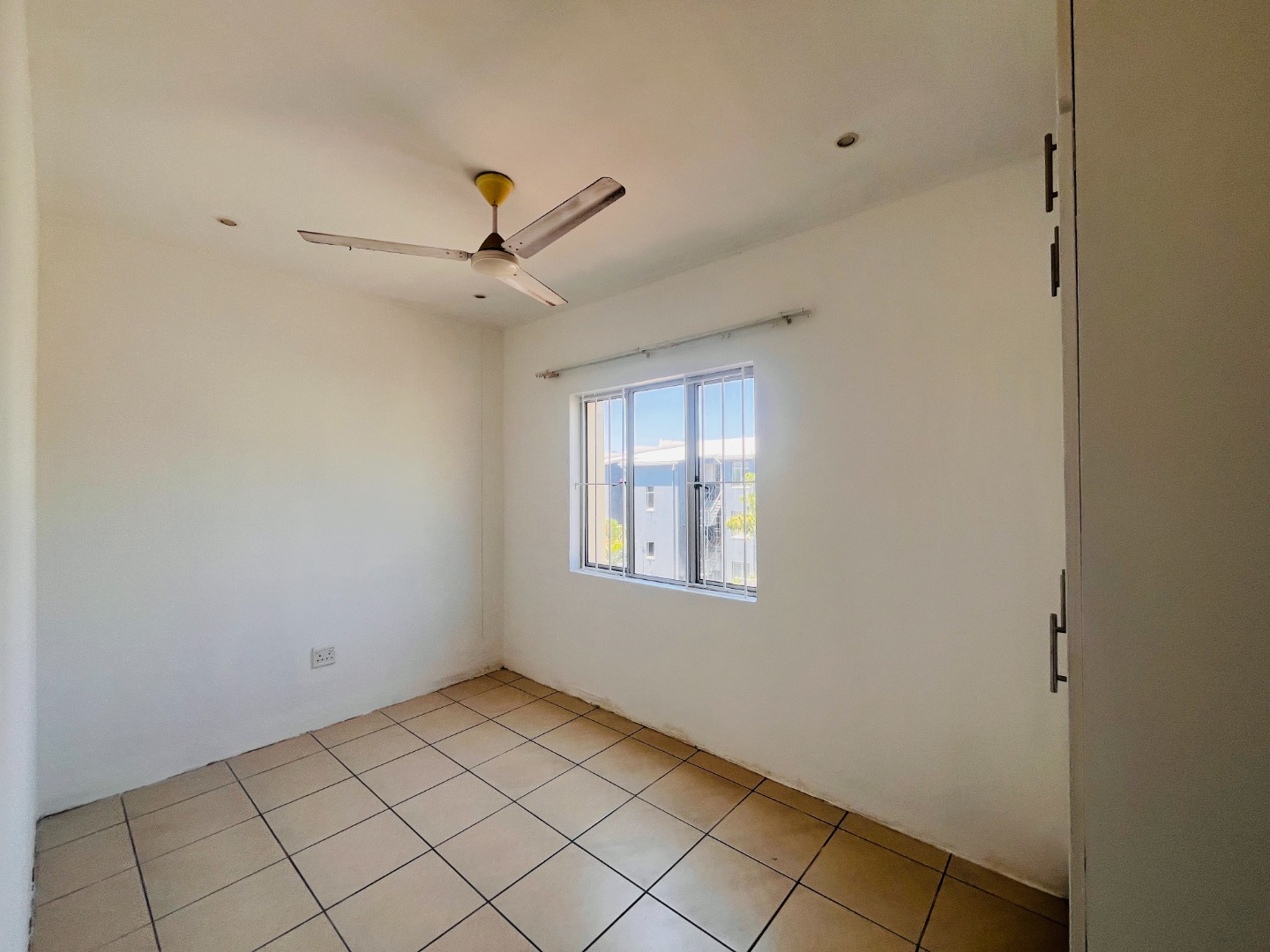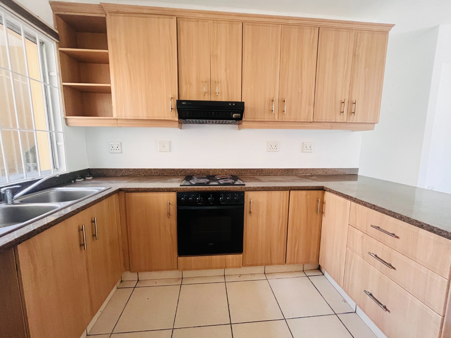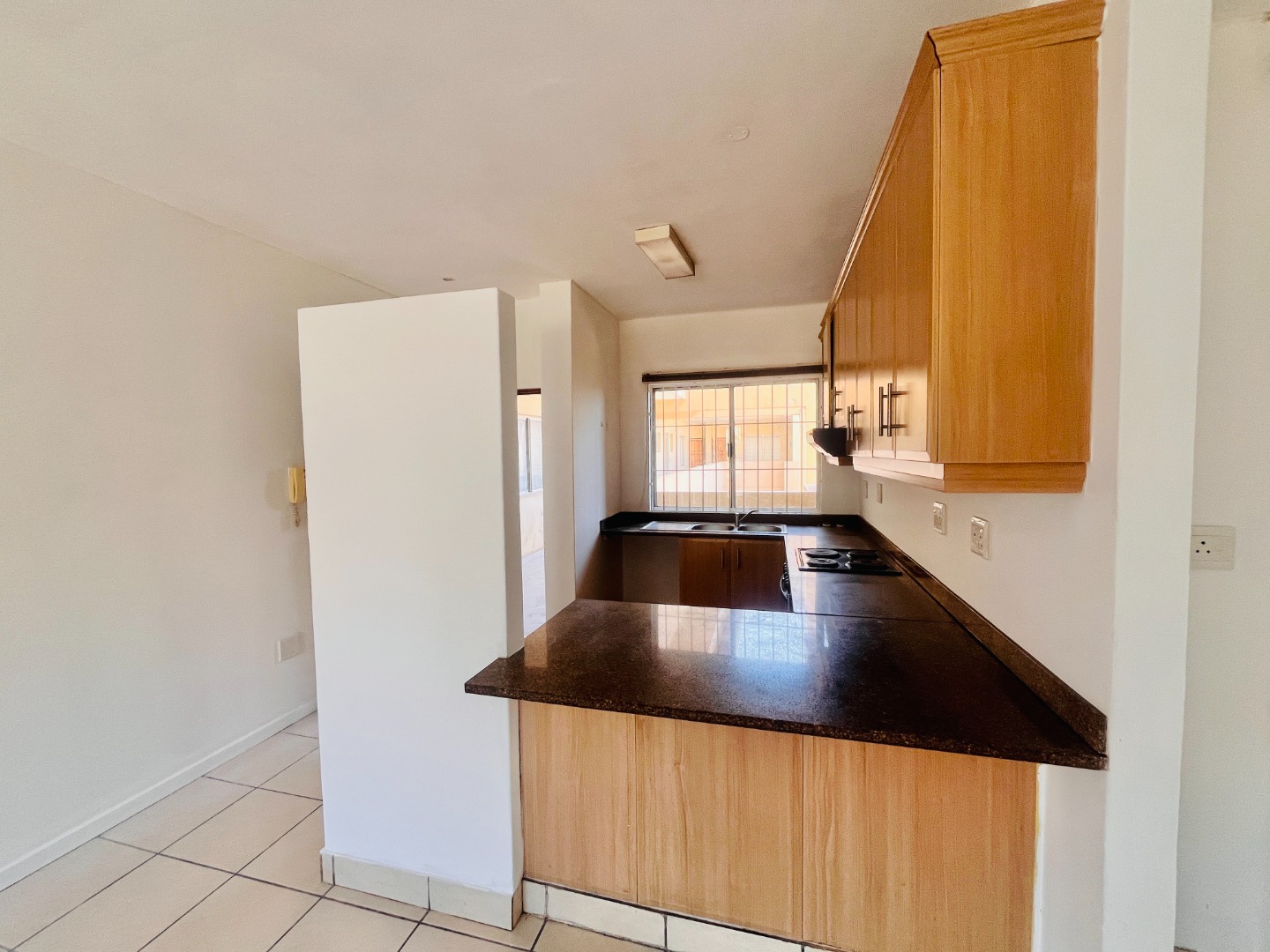 Two Tiled Bedrooms with Built-in-Cupboards and Ceiling Fans. Kitchen has ample Storage Cupboards, Granite Tops and Plumbing for a Washing Machine. Open-plan Lounge and Dining Area.