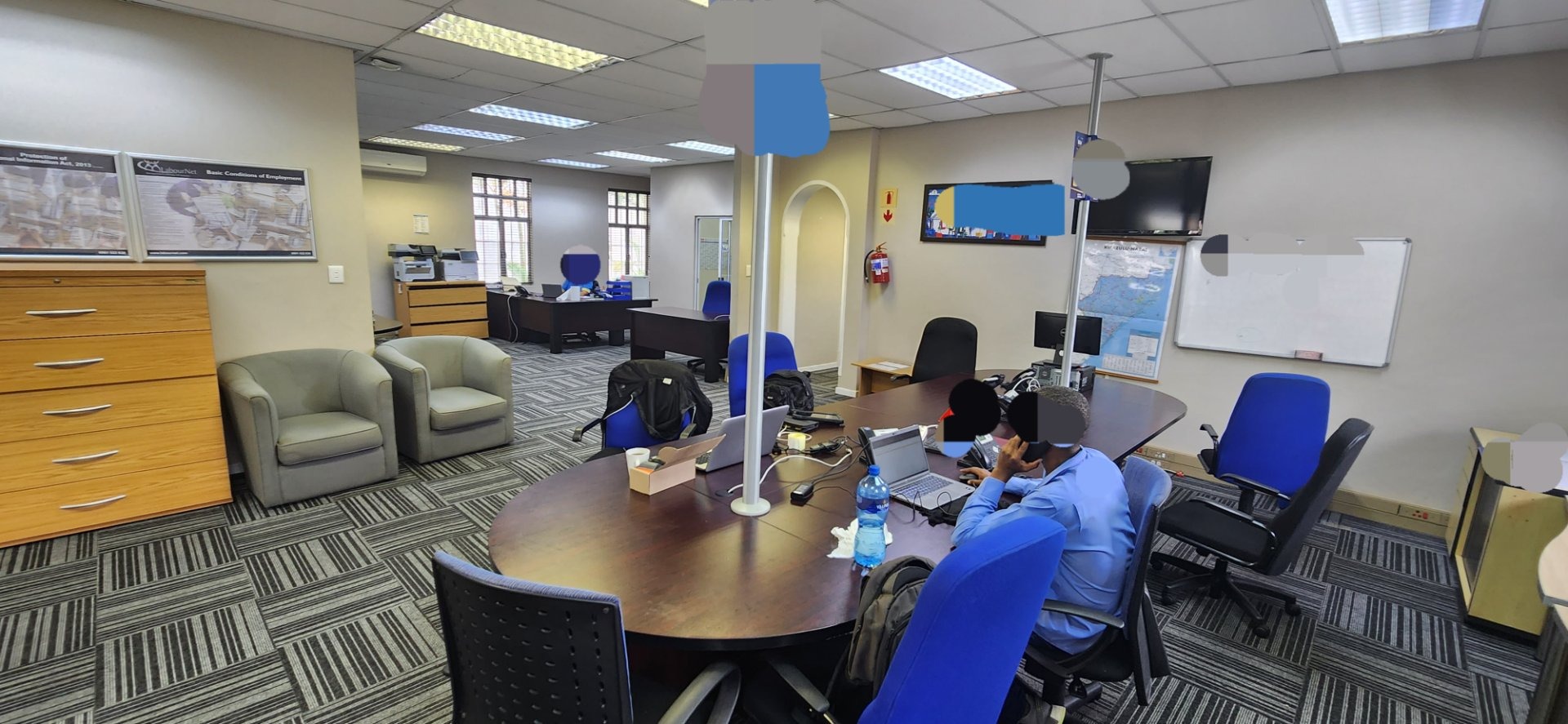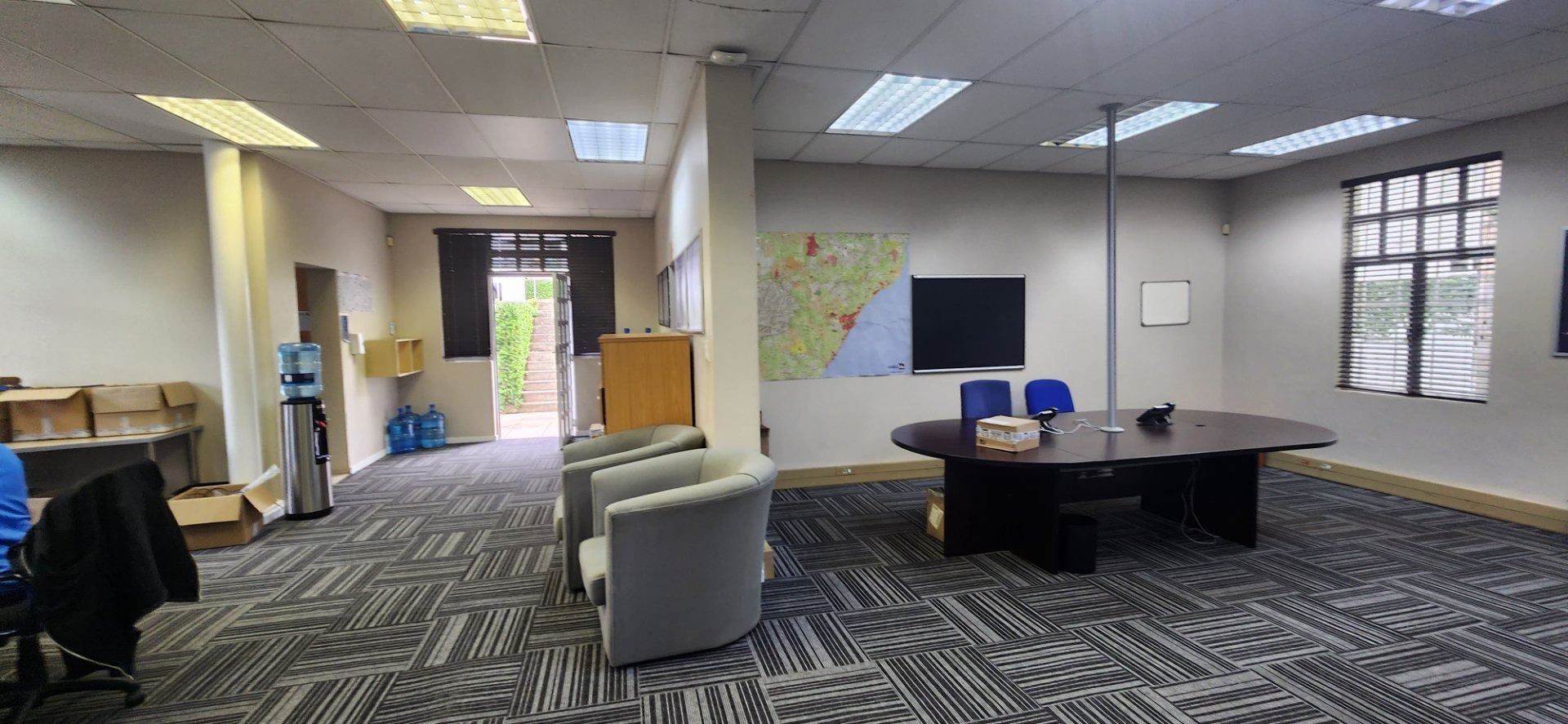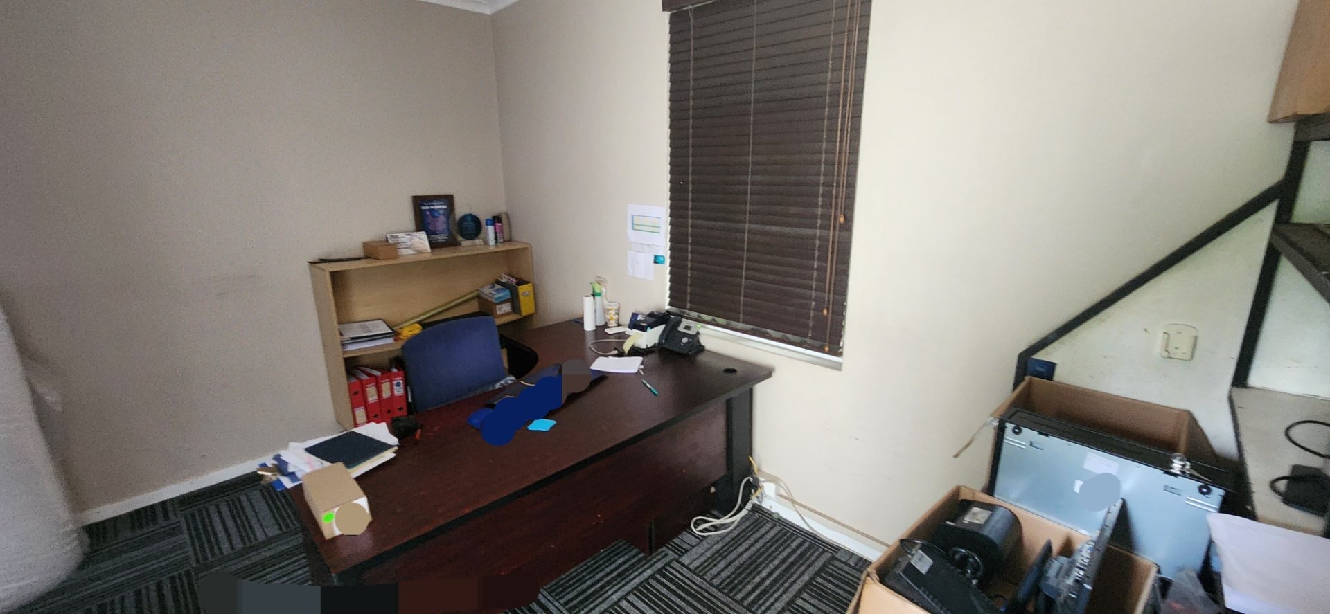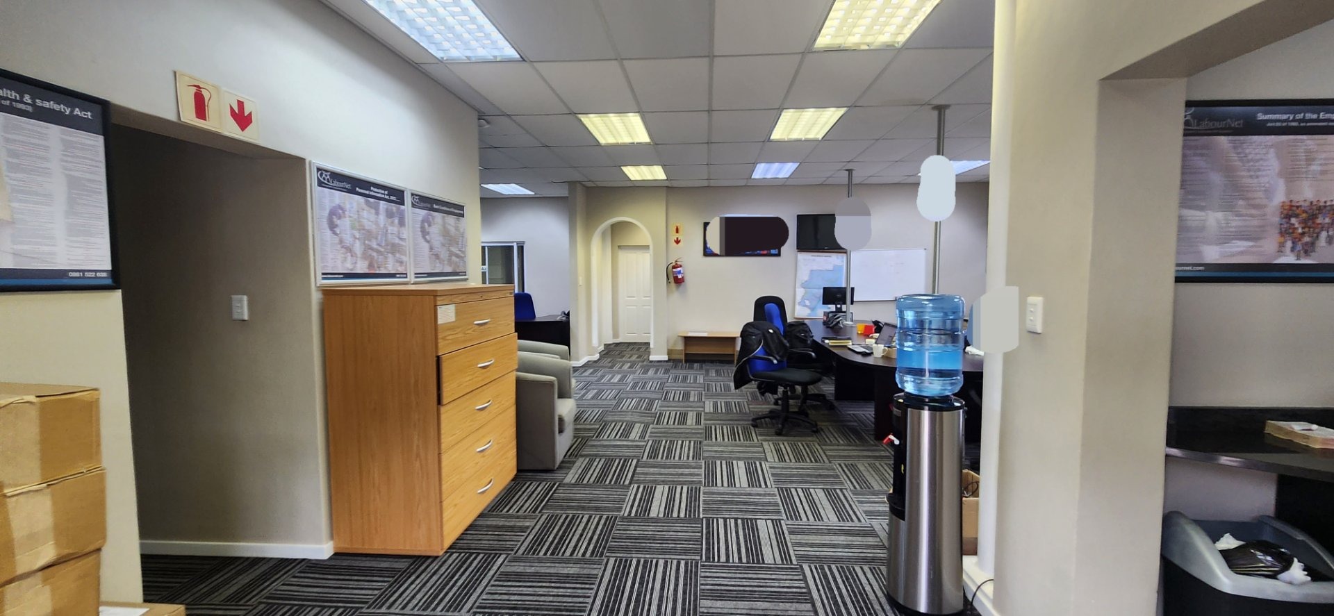 The front of the building opens into a small reception with a boardroom leading off this. The passage leads into a smart private office and a large open plan work area . This can be further partitioned. There is another individual office at the back plus a server room. There is a male and female ablution and a kitchen. There are 3 outside storerooms. 2 of these can be converted back to garages.