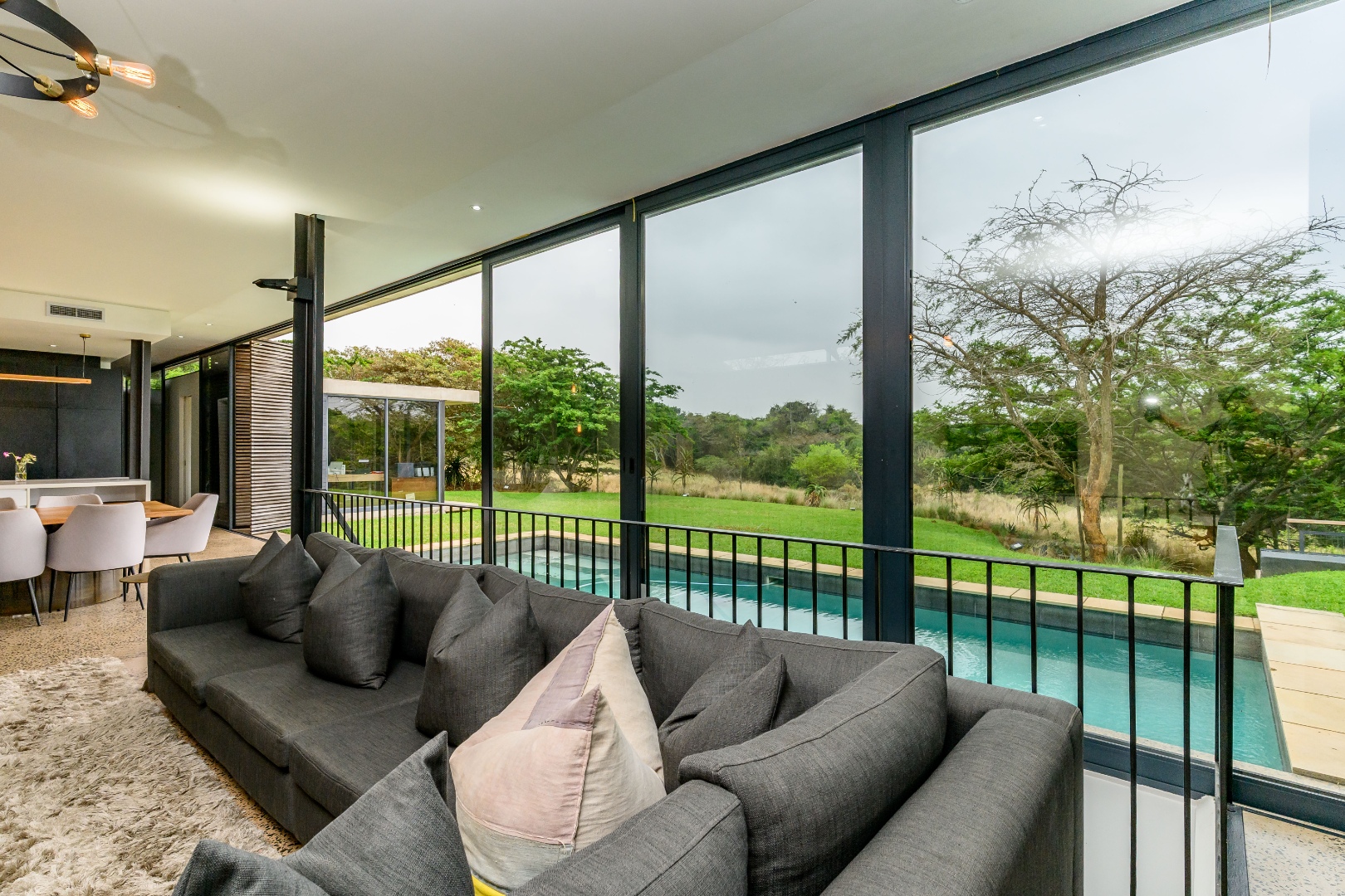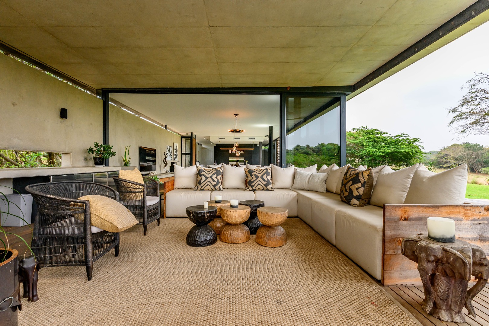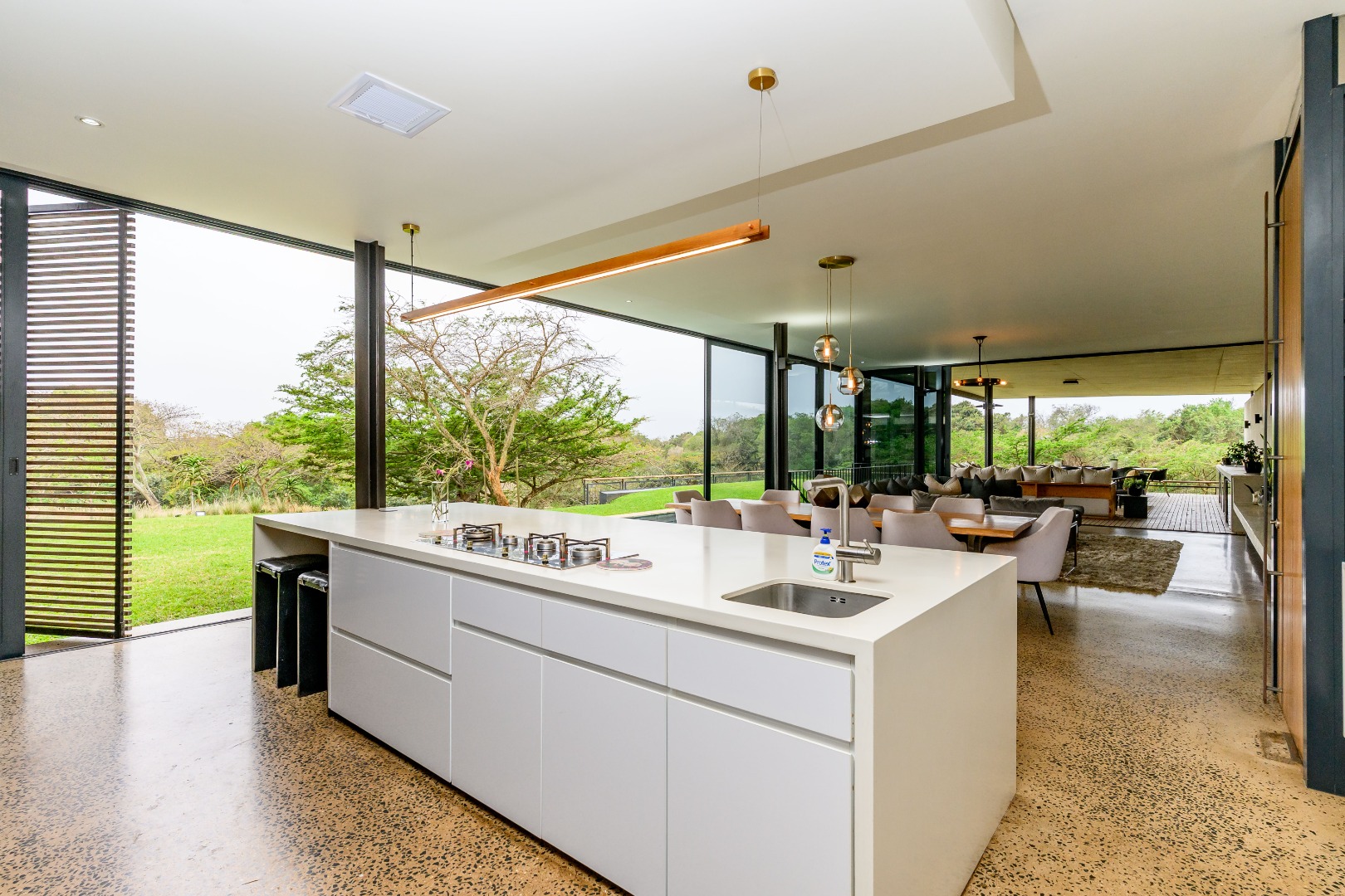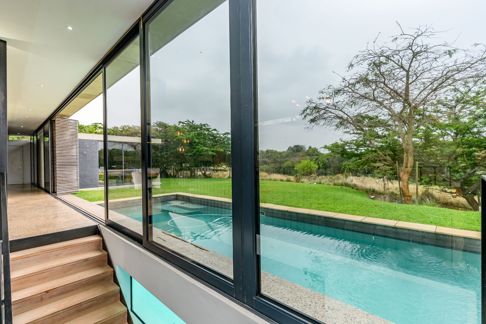 From the moment you enter, expansive glass windows frame the natural bushveld outlook, filling the home with light and bringing the outdoors in. Designed with space and flow in mind, the open-plan living areas connect seamlessly to a large covered outdoor entertainment space — ideal for alfresco dining, relaxing, or hosting friends and family.