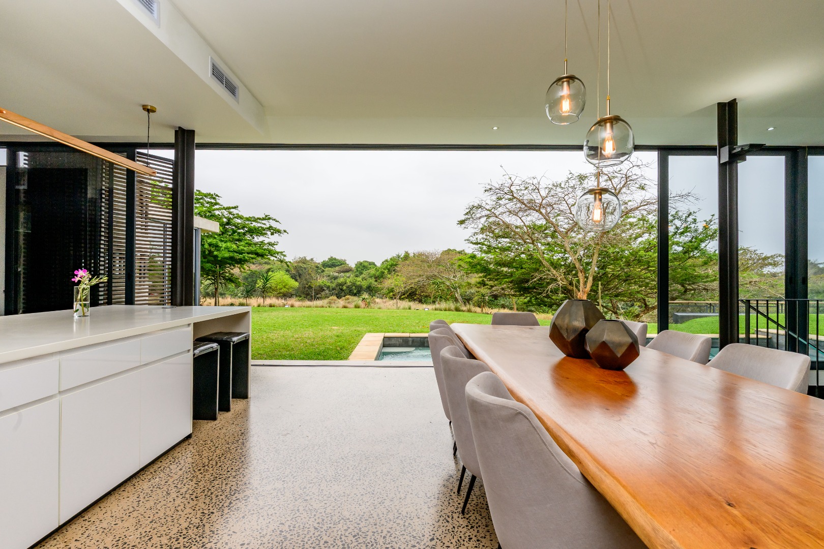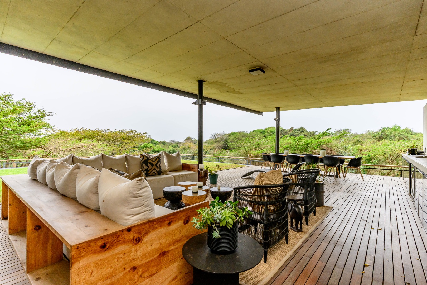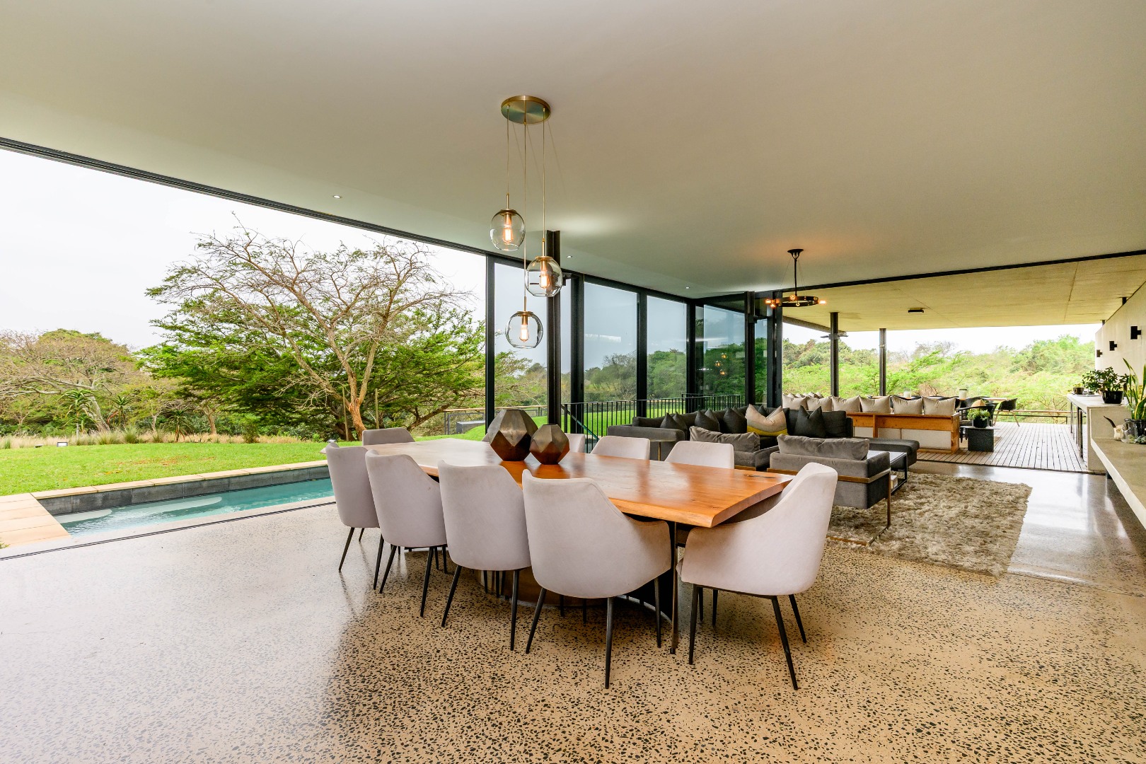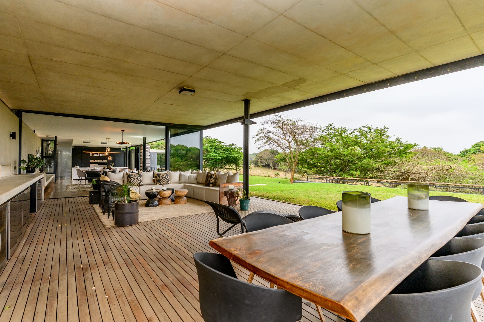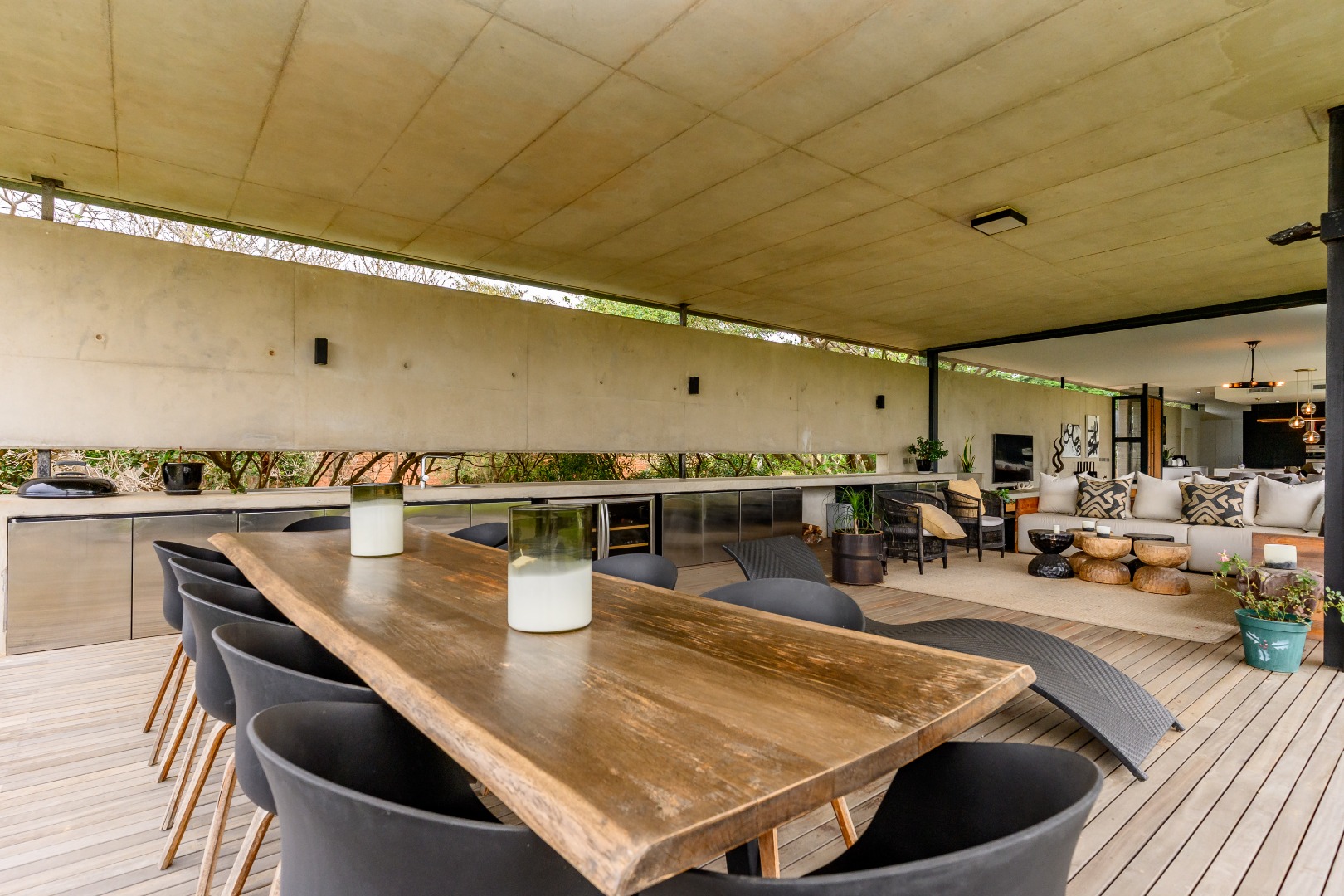 From the moment you enter, expansive glass windows frame the natural bushveld outlook, filling the home with light and bringing the outdoors in. Designed with space and flow in mind, the open-plan living areas connect seamlessly to a large covered outdoor entertainment space — ideal for alfresco dining, relaxing, or hosting friends and family.