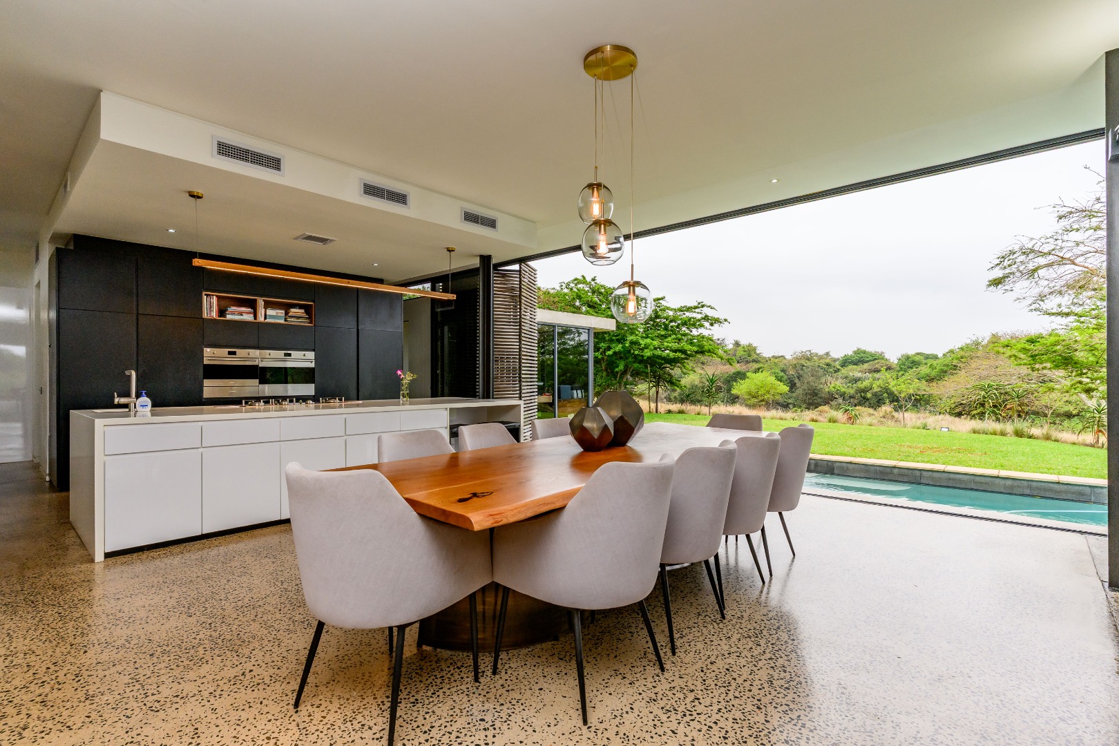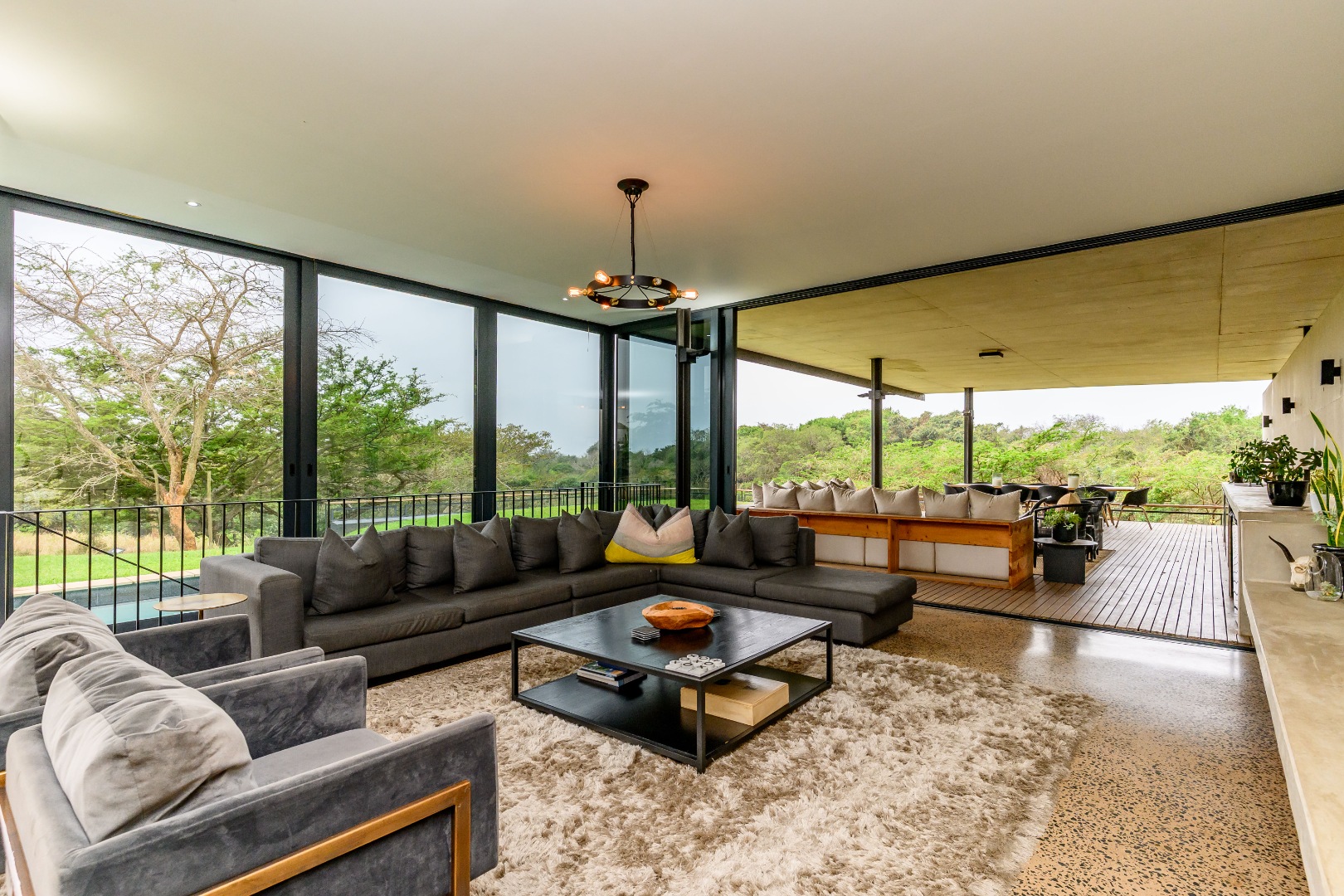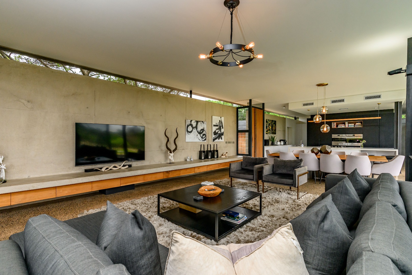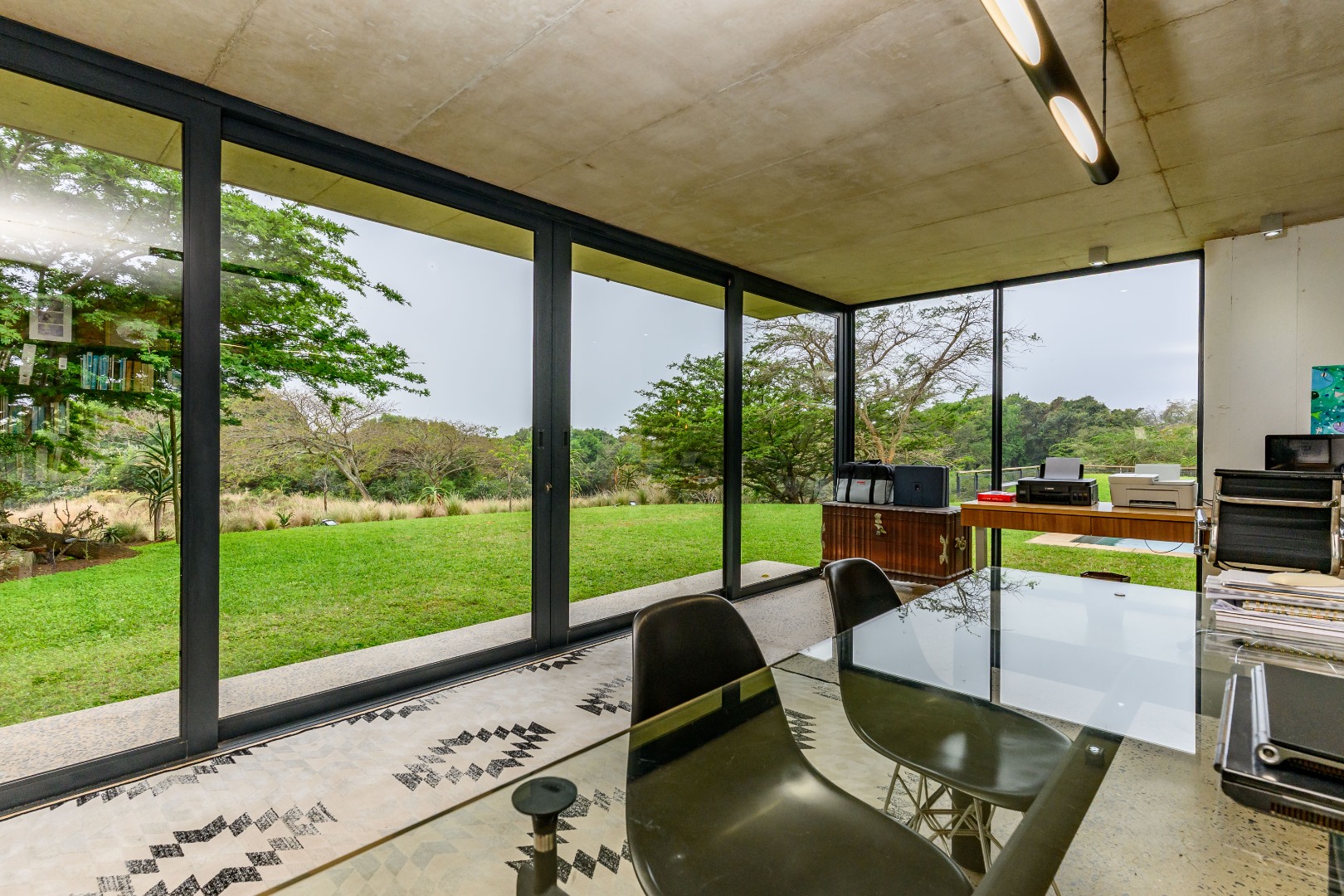 From the moment you enter, expansive glass windows frame the natural bushveld outlook, filling the home with light and bringing the outdoors in. Designed with space and flow in mind, the open-plan living areas connect seamlessly to a large covered outdoor entertainment space — ideal for alfresco dining, relaxing, or hosting friends and family.