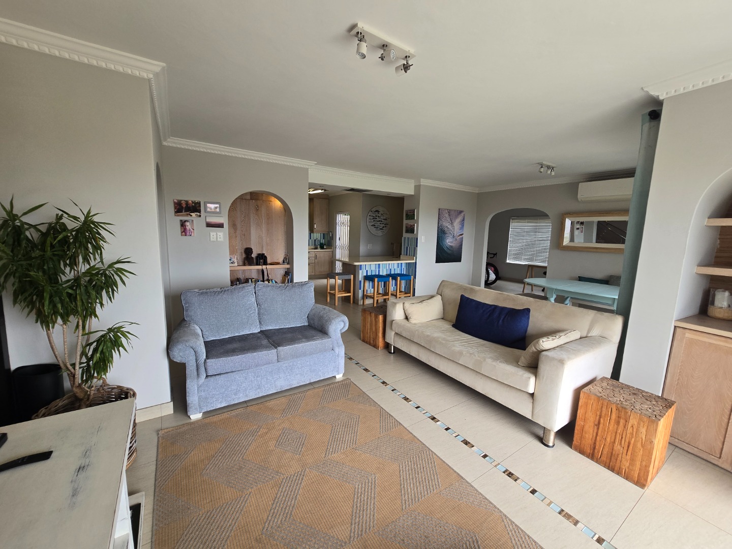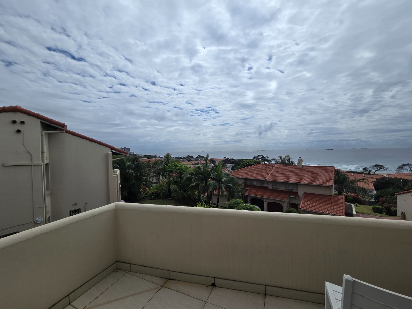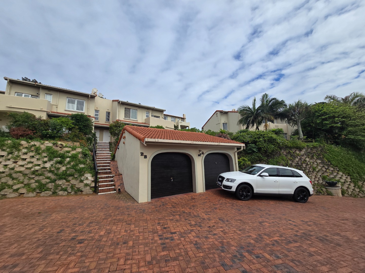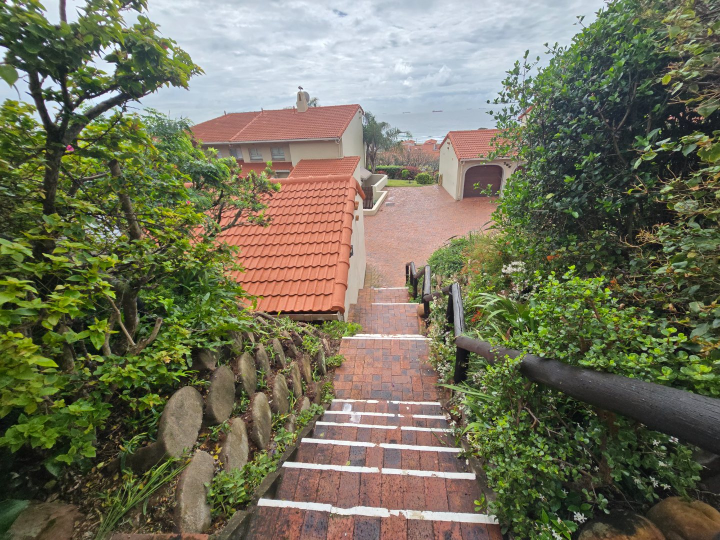 Across the road from the beach in La Lucia and a leisurely stroll to the start of the Umhlanga Promenade this well looked after complex offers safety and security and ocean views. Offering 3 beds 2 baths upstairs with a lounge dining room and kitchen plus pantry cupboard, guest toilet and extra lounge or study or screen off for a 4 th bedroom. Stairs from the single garage and parking bay.