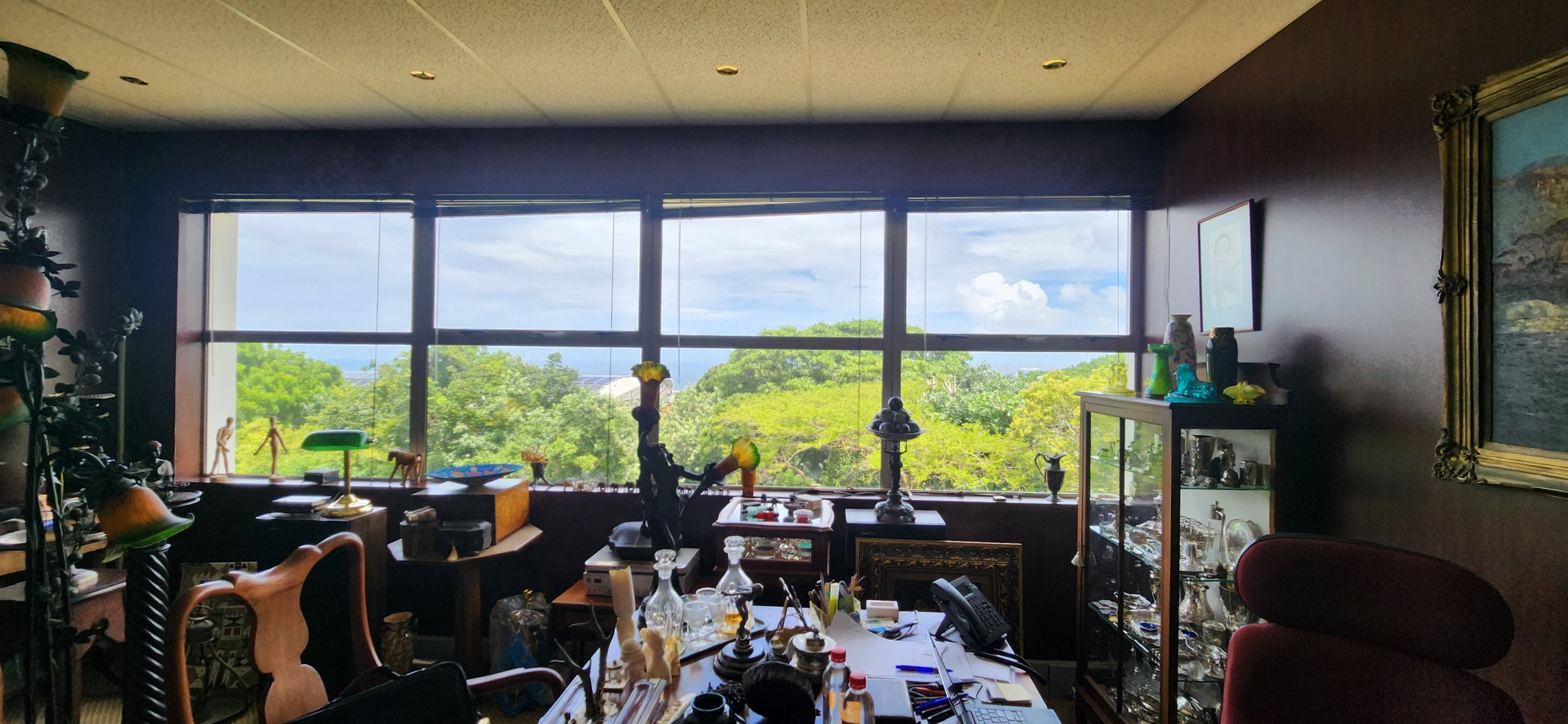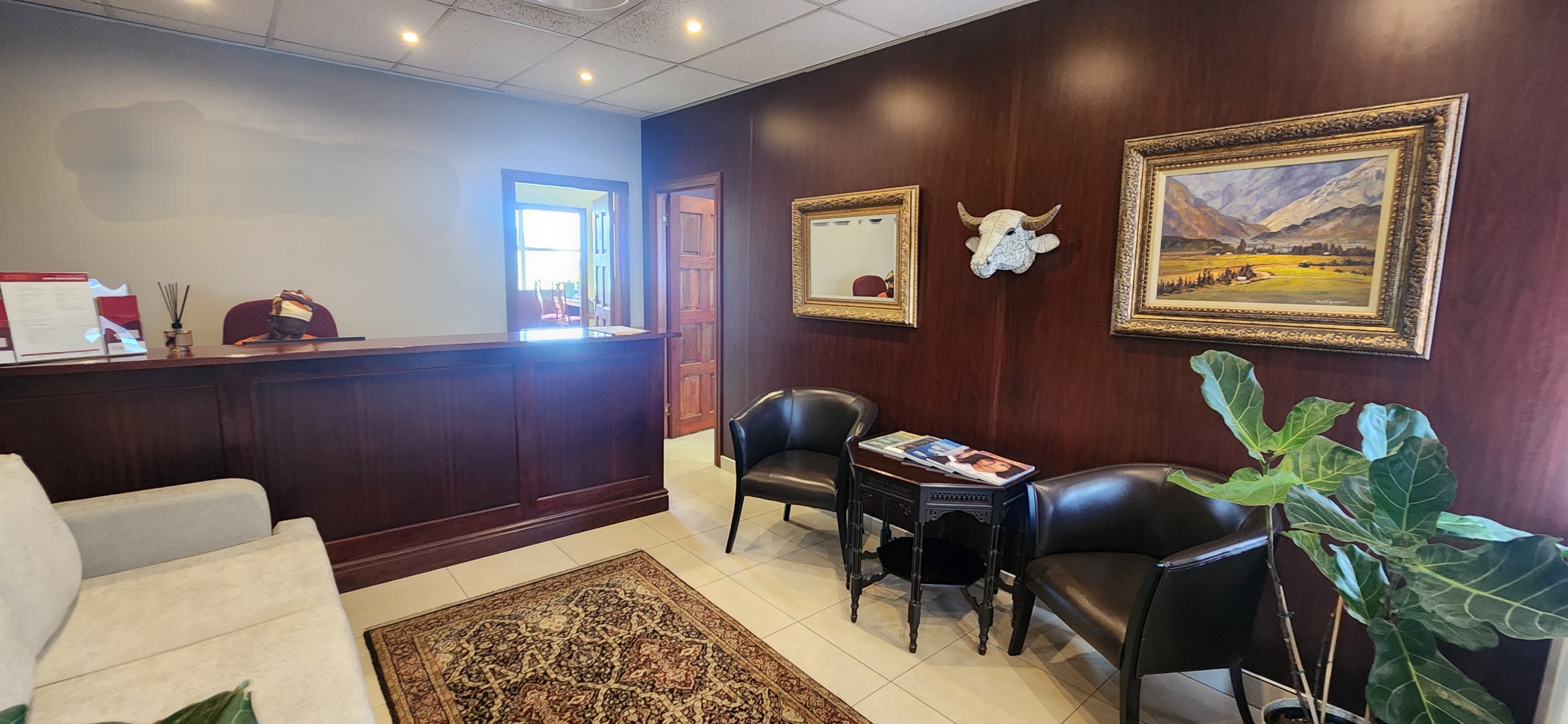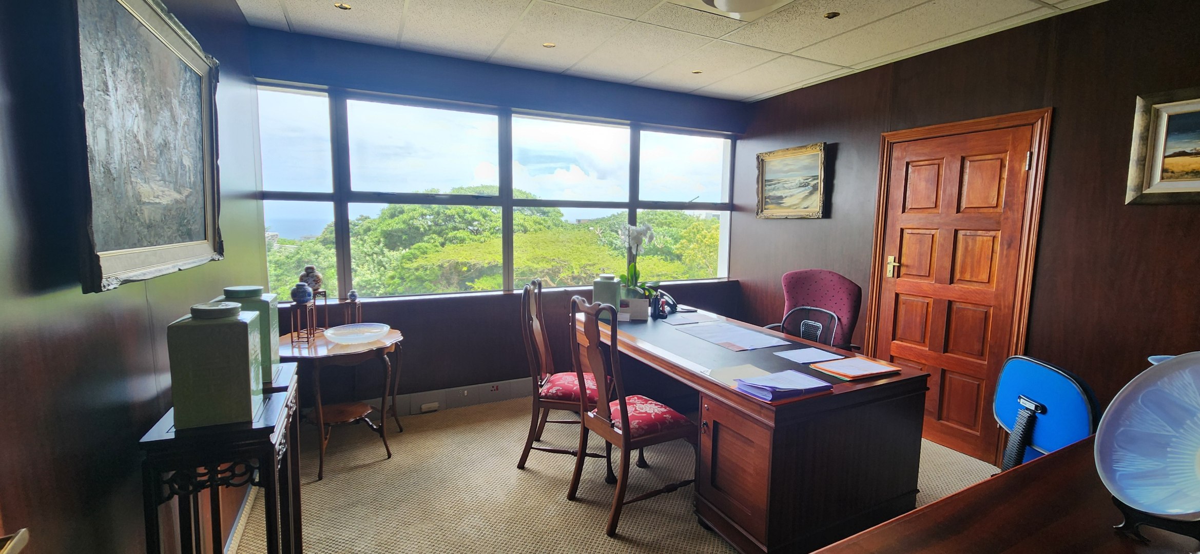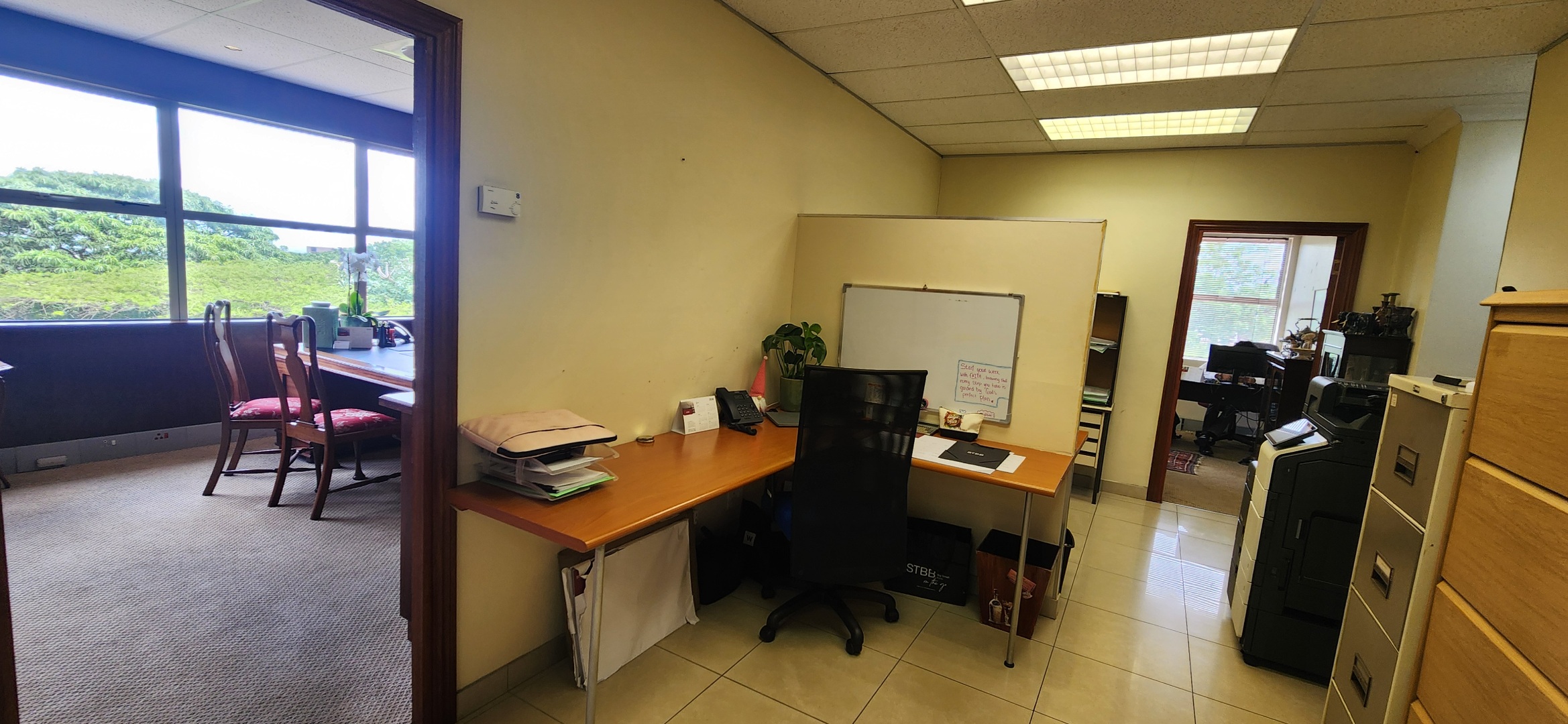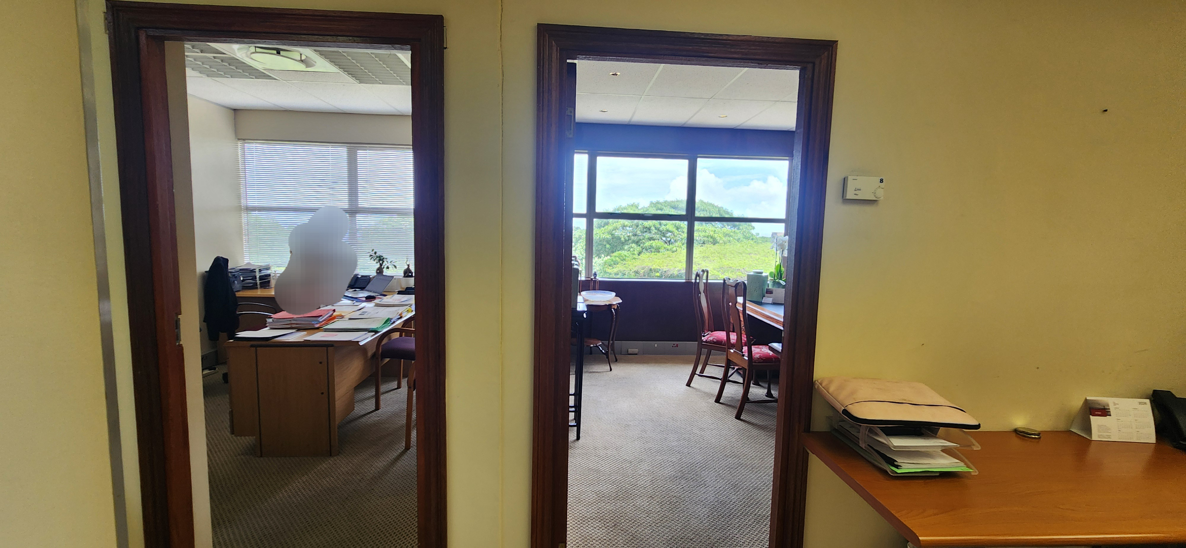 The current layout integrates multiple private offices, each benefiting from abundant natural light and serene green vistas, alongside an adaptable open-plan workstation area. A dedicated, professional reception area ensures a distinguished first impression for clients and visitors, complemented by a formal boardroom, ideal for collaborative sessions or corporate entertaining.