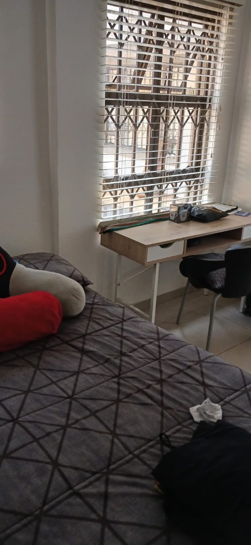 The compact yet functional kitchen is equipped with a refrigerator, a modern sink, 2 plate cooker, and ample storage provided by under-sink cabinets and open shelving. The living area is thoughtfully arranged with a comfortable 2 seater sofa, a patterned rug, and a wall-mounted TV (tenant to subscribe to TV channels at their cost) setup complemented by an integrated shelving unit, offering both storage and display space. The bedroom provides a dedicated workspace with a desk and chair, all benefiting from natural light.