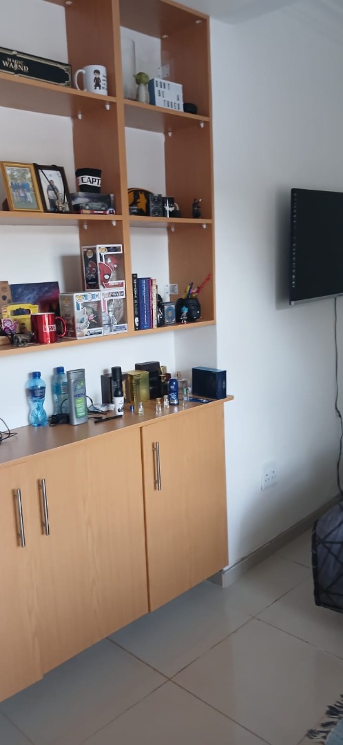 The compact yet functional kitchen is equipped with a refrigerator, a modern sink, 2 plate cooker, and ample storage provided by under-sink cabinets and open shelving. The living area is thoughtfully arranged with a comfortable 2 seater sofa, a patterned rug, and a wall-mounted TV (tenant to subscribe to TV channels at their cost) setup complemented by an integrated shelving unit, offering both storage and display space. The bedroom provides a dedicated workspace with a desk and chair, all benefiting from natural light.
