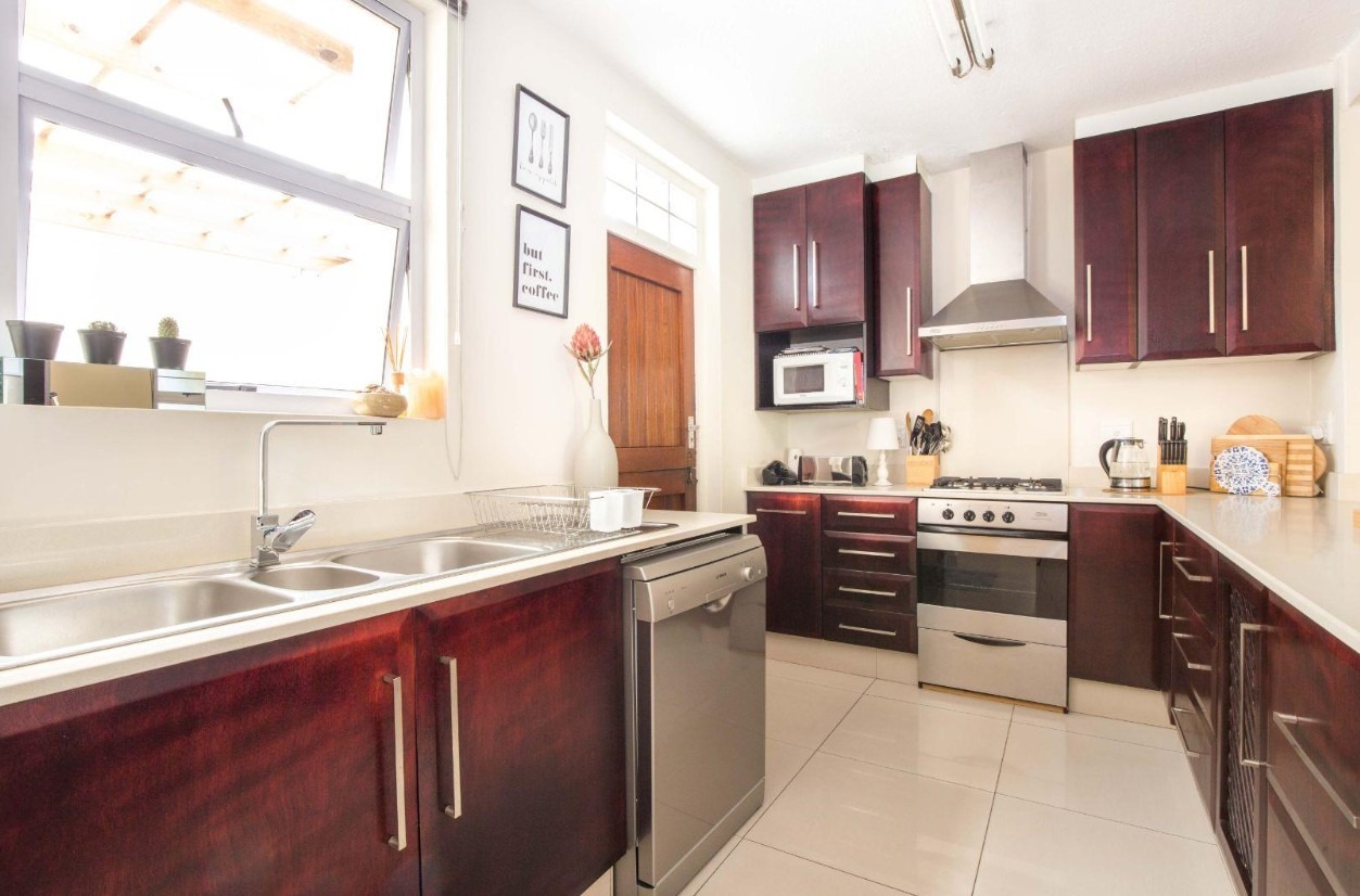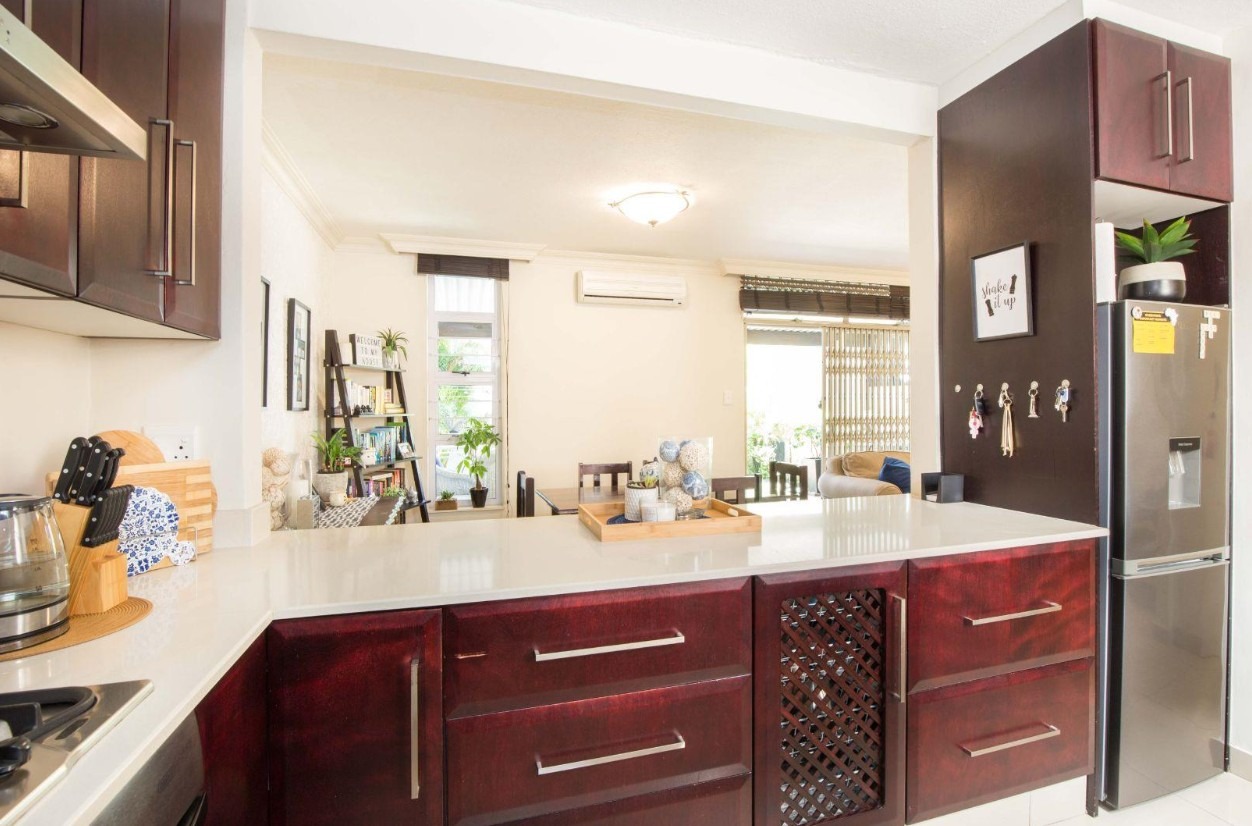 Step inside and you'll find a welcoming open-plan living, dining, and kitchen area. The kitchen is quite modern, featuring dark wood cabinetry and caesar stone countertops, double sink, prep bowl and a gas stove. The living space is bright and airy, with neutral walls and an air conditioning unit to keep things cool. Large sliding doors, fitted with security gates, lead out to your private outdoor space.