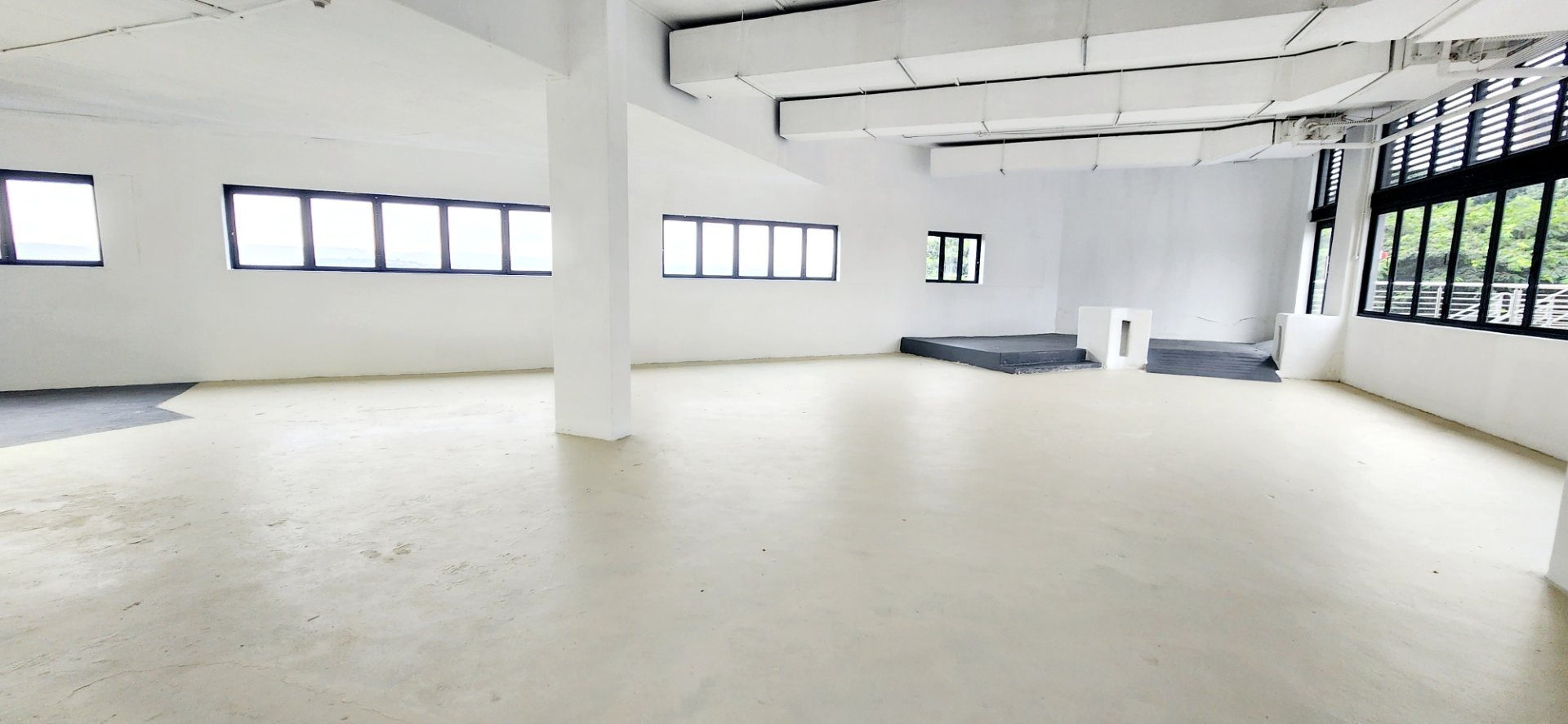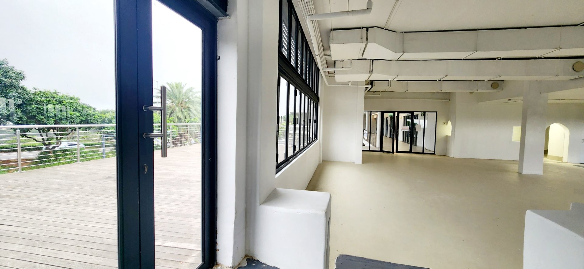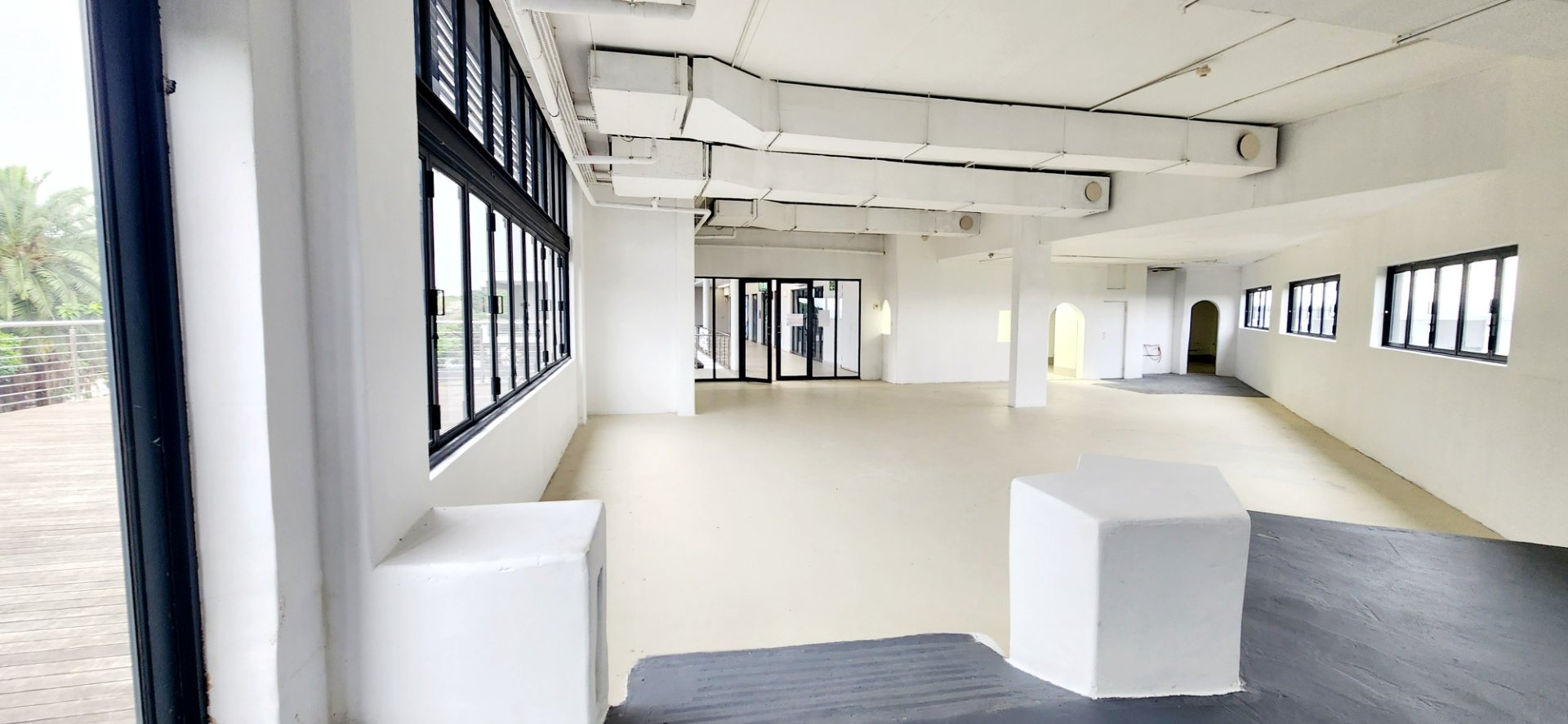 This unit has an uncover area of 210m². It is on the top floor with extensive windows offering a light and airy open space with a spacious deck of 67m². The deck is charged at a lower rental rate. It has a separate area for an industrial kitchen - with a private delivery entrance. There is also plenty of free customer parking in the carpark and in the basements below ( accessed by lift and stairs). There are plenty of common smart ablutions just outside the unit.