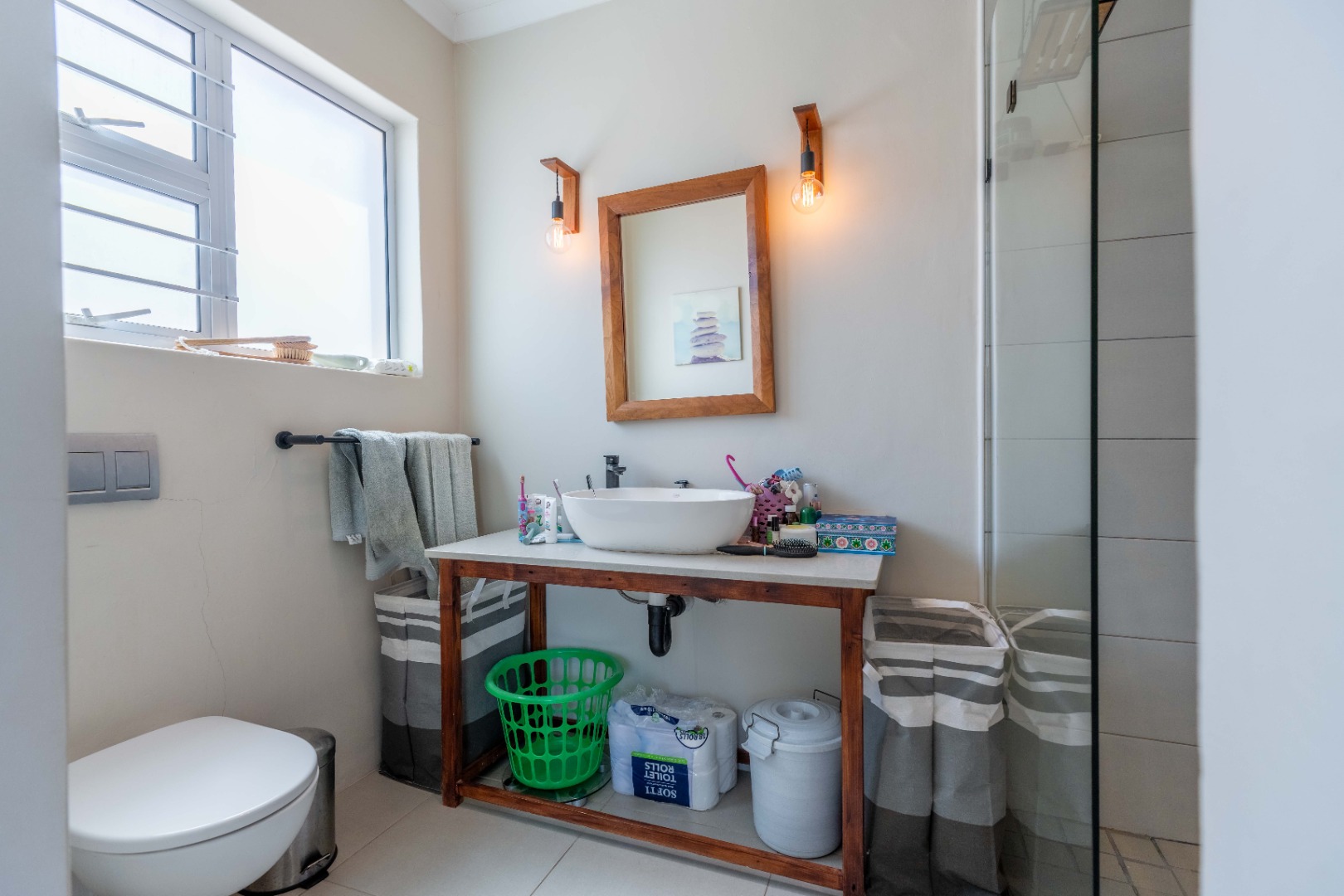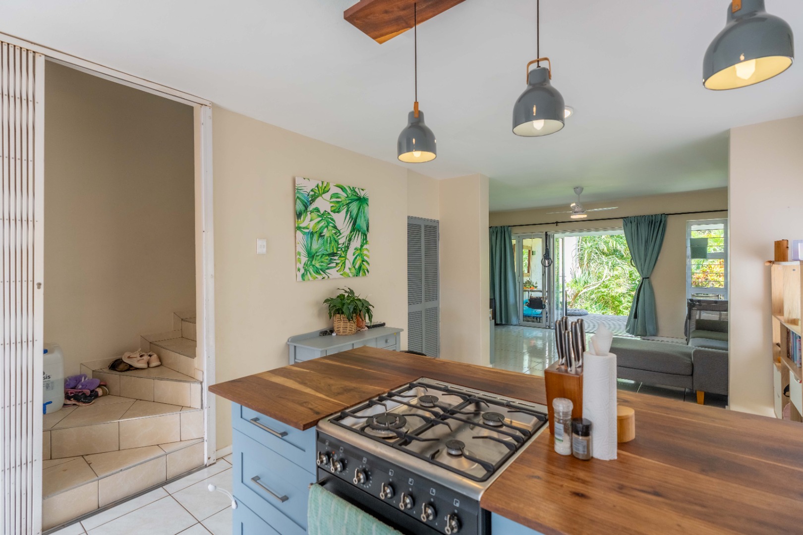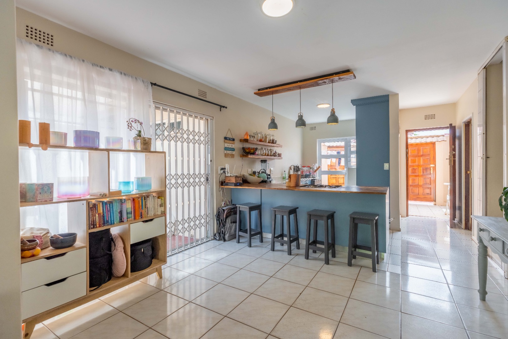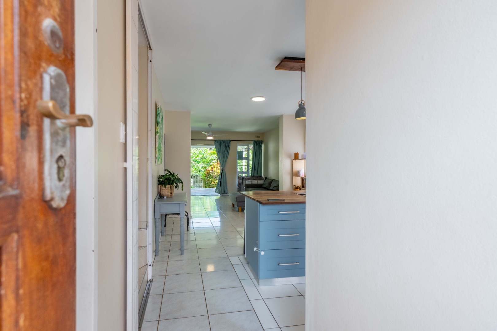 Step into a bright and airy open-plan living space filled with natural light, creating an inviting and tranquil atmosphere. The living area flows seamlessly onto a private wooden deck, perfect for morning coffee or unwinding while overlooking a serene garden setting. The contemporary kitchen is a standout feature, complete with elegant Kiaat countertops and a premium Smeg hob, making it ideal for home cooks and entertainers alike.