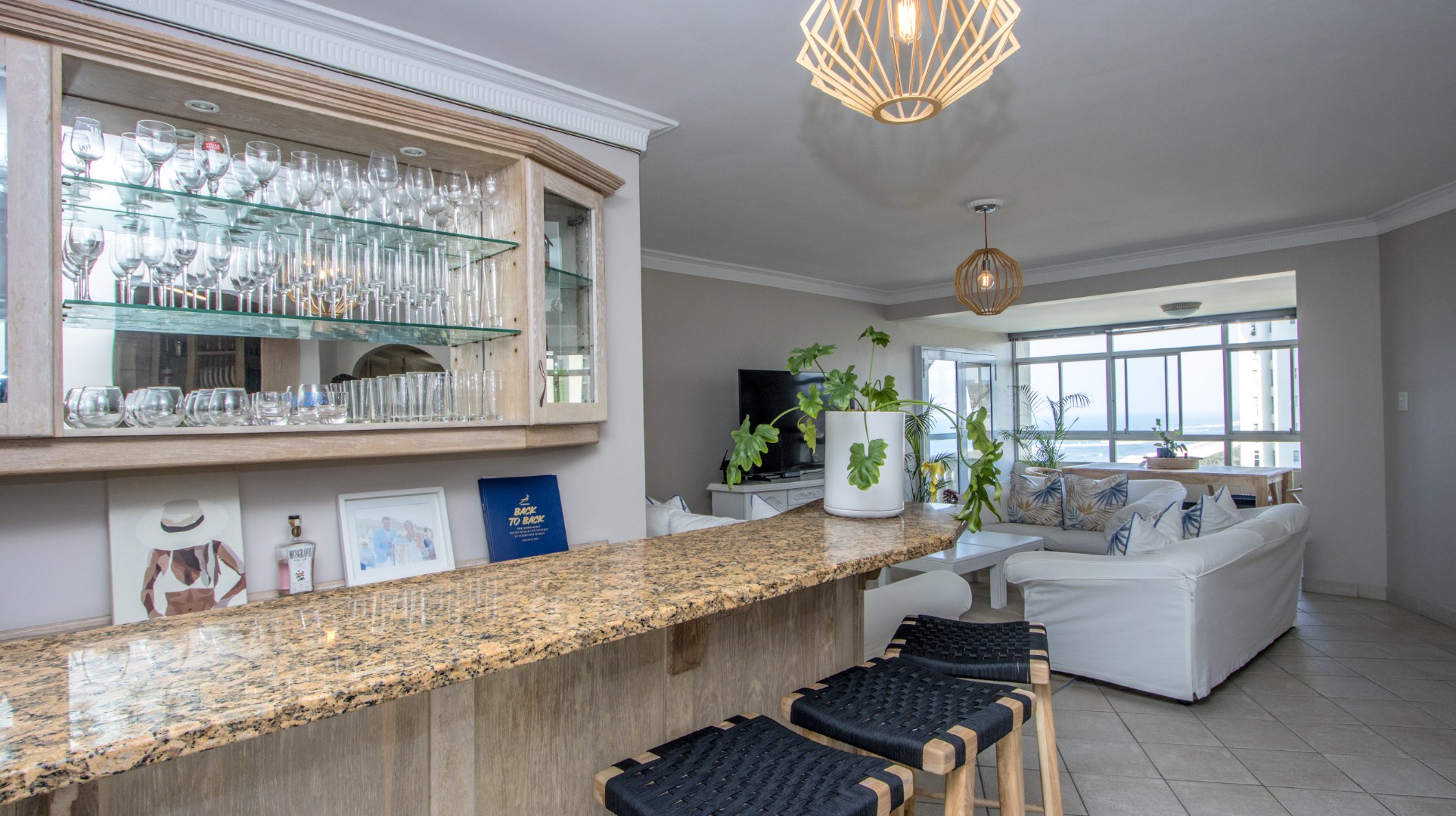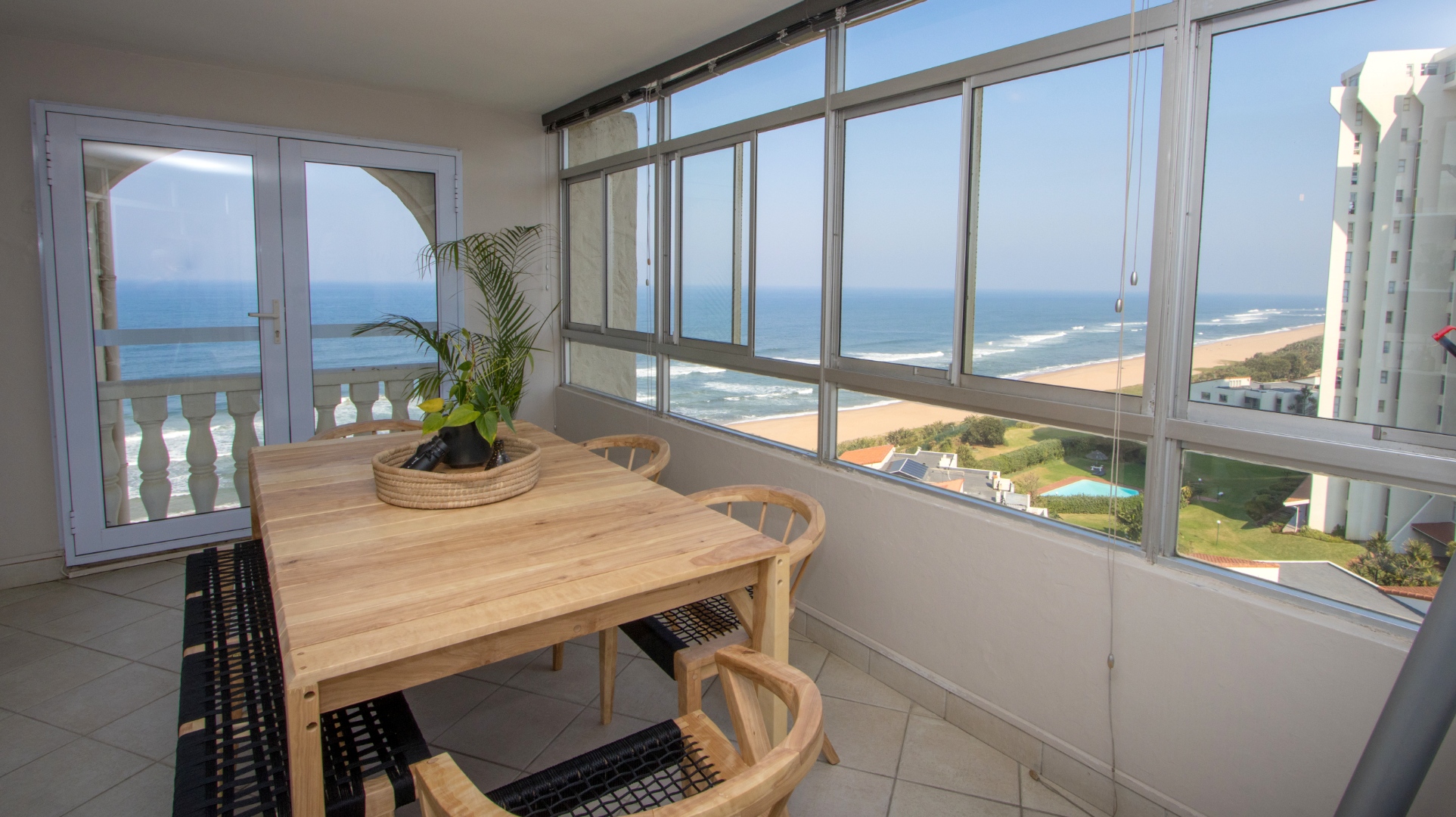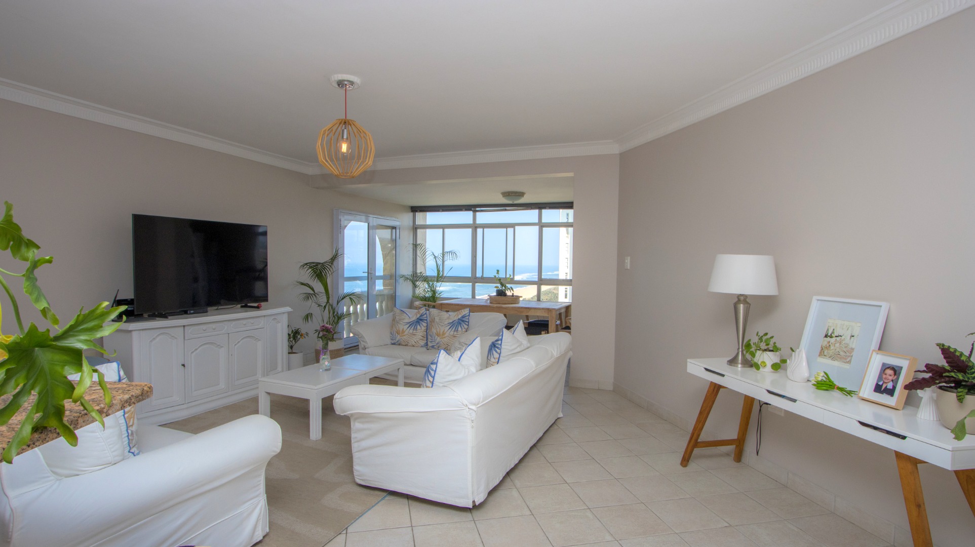 Discover exceptional coastal living in this spacious 157 sqm apartment available for rent in Umhlanga Rocks. Boasting three bedrooms and two bathrooms, including one en-suite, this residence offers comfortable and modern accommodation. The open-plan layout seamlessly connects the living areas, enhanced by abundant natural light and elegant crown molding. A highlight is the enclosed sunroom/balcony, providing panoramic, unobstructed ocean and beach views, perfect for dining or relaxation. The well-appointed kitchen features granite countertops, light wood cabinetry, and a stainless steel hood, catering to all culinary needs. Adjacent to the living space, a dedicated built-in bar area, also with granite countertops and extensive glassware storage, makes entertaining effortless. Tiled flooring throughout ensures practicality and easy maintenance, ideal for a beachfront property. This property is designed for a vibrant coastal lifestyle, suitable for professionals or families seeking a secure and convenient home. Residents benefit from access to a clean communal swimming pool, surrounded by lush green lawns and multiple shaded seating areas, including thatched umbrellas. A communal braai facility further enhances outdoor enjoyment, offering a perfect setting for social gatherings. Security is paramount, with 24-hour security, a security post, access gates, and an intercom system ensuring peace of mind within this security complex and estate. The building is wheelchair-friendly and features lifts for easy access. Situated in the desirable suburban area of Umhlanga Rocks, this waterfront property offers direct access to coastal and beach activities, making it an ideal location for those who appreciate sea views and a dynamic environment. Key Features: * 3 Bedrooms, 2 Bathrooms (1 En-suite) * 157 sqm Floor Size * Panoramic Ocean & Beach Views * Enclosed Sunroom/Balcony * Open-Plan Living with Built-in Bar * Modern Kitchen with Granite Countertops * Communal Swimming Pool & Braai Area * 24-Hour Security & Access Control * Wheelchair Friendly with Lifts * 2 Parking Bays