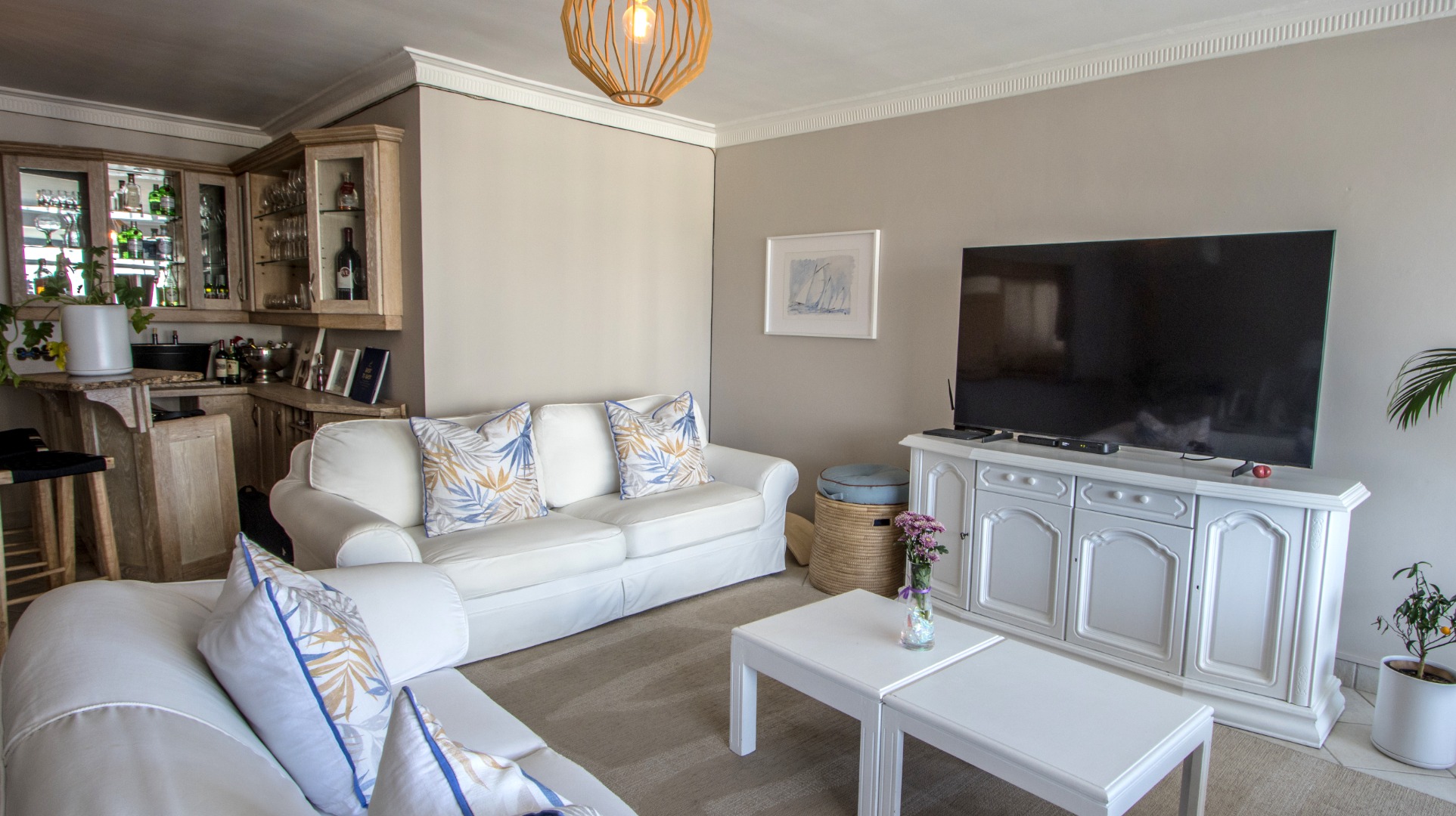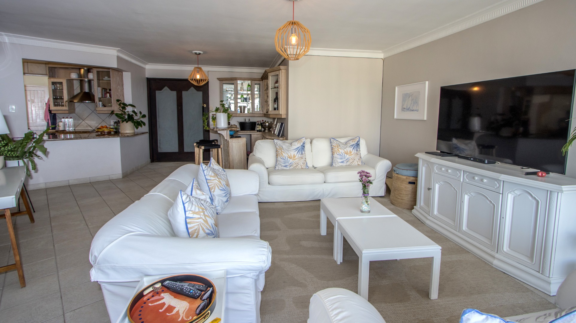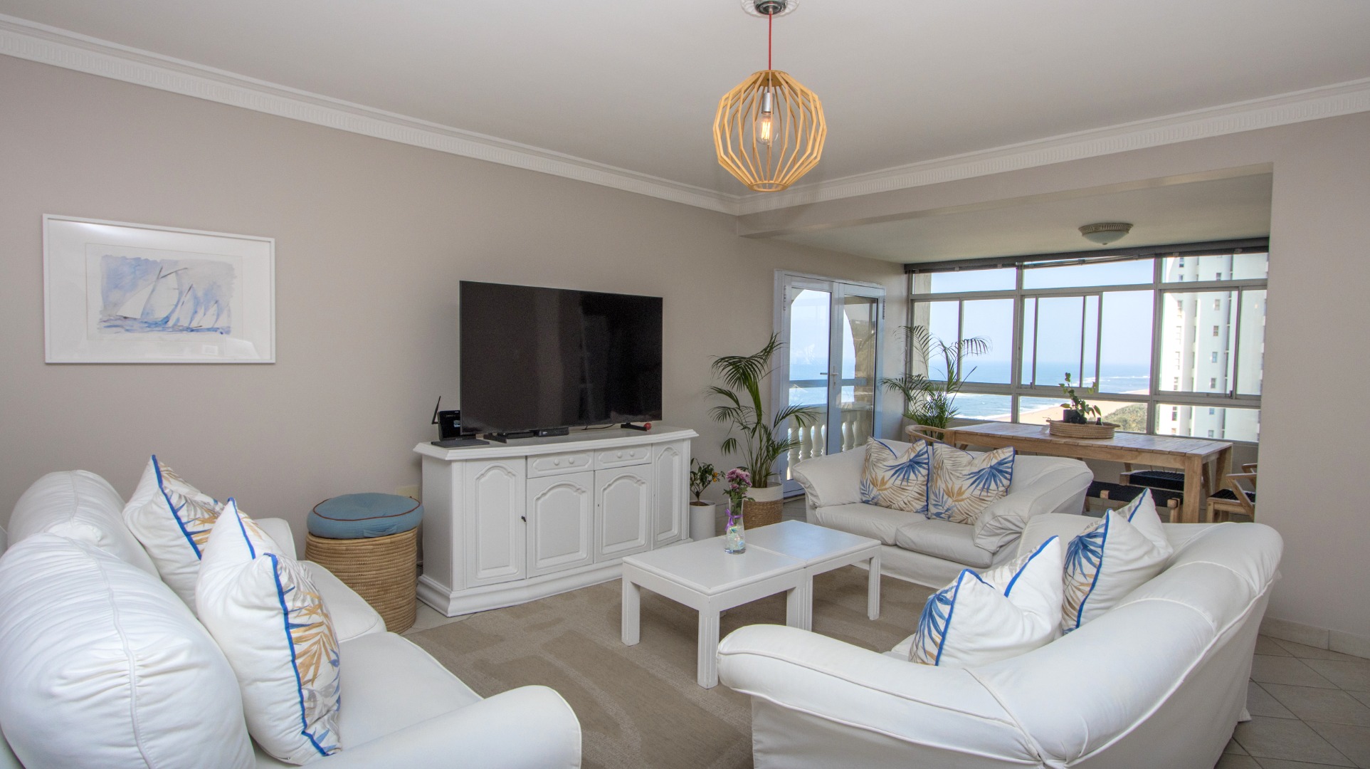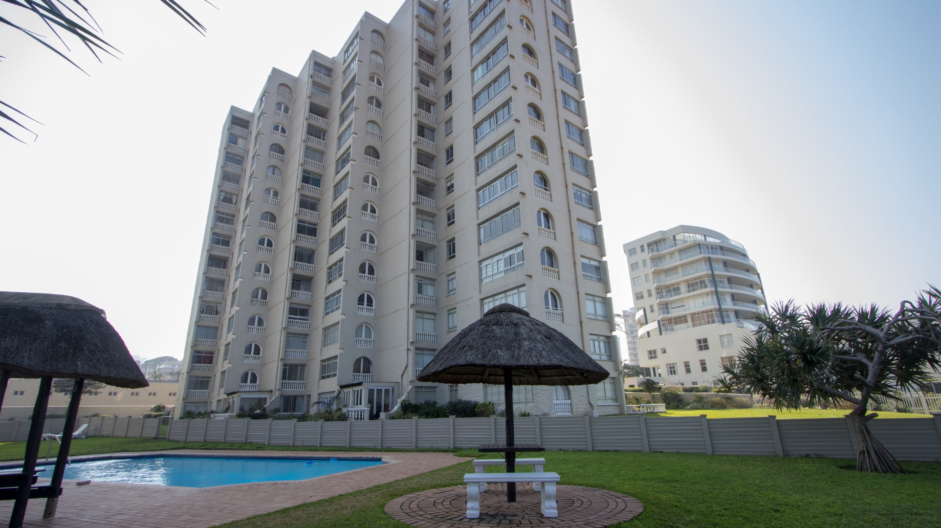 Discover exceptional coastal living in this spacious 157 sqm apartment available for rent in Umhlanga Rocks. Boasting three bedrooms and two bathrooms, including one en-suite, this residence offers comfortable and modern accommodation. The open-plan layout seamlessly connects the living areas, enhanced by abundant natural light and elegant crown molding. A highlight is the enclosed sunroom/balcony, providing panoramic, unobstructed ocean and beach views, perfect for dining or relaxation. The well-appointed kitchen features granite countertops, light wood cabinetry, and a stainless steel hood, catering to all culinary needs. Adjacent to the living space, a dedicated built-in bar area, also with granite countertops and extensive glassware storage, makes entertaining effortless. Tiled flooring throughout ensures practicality and easy maintenance, ideal for a beachfront property. This property is designed for a vibrant coastal lifestyle, suitable for professionals or families seeking a secure and convenient home. Residents benefit from access to a clean communal swimming pool, surrounded by lush green lawns and multiple shaded seating areas, including thatched umbrellas. A communal braai facility further enhances outdoor enjoyment, offering a perfect setting for social gatherings. Security is paramount, with 24-hour security, a security post, access gates, and an intercom system ensuring peace of mind within this security complex and estate. The building is wheelchair-friendly and features lifts for easy access. Situated in the desirable suburban area of Umhlanga Rocks, this waterfront property offers direct access to coastal and beach activities, making it an ideal location for those who appreciate sea views and a dynamic environment. Key Features: * 3 Bedrooms, 2 Bathrooms (1 En-suite) * 157 sqm Floor Size * Panoramic Ocean & Beach Views * Enclosed Sunroom/Balcony * Open-Plan Living with Built-in Bar * Modern Kitchen with Granite Countertops * Communal Swimming Pool & Braai Area * 24-Hour Security & Access Control * Wheelchair Friendly with Lifts * 2 Parking Bays