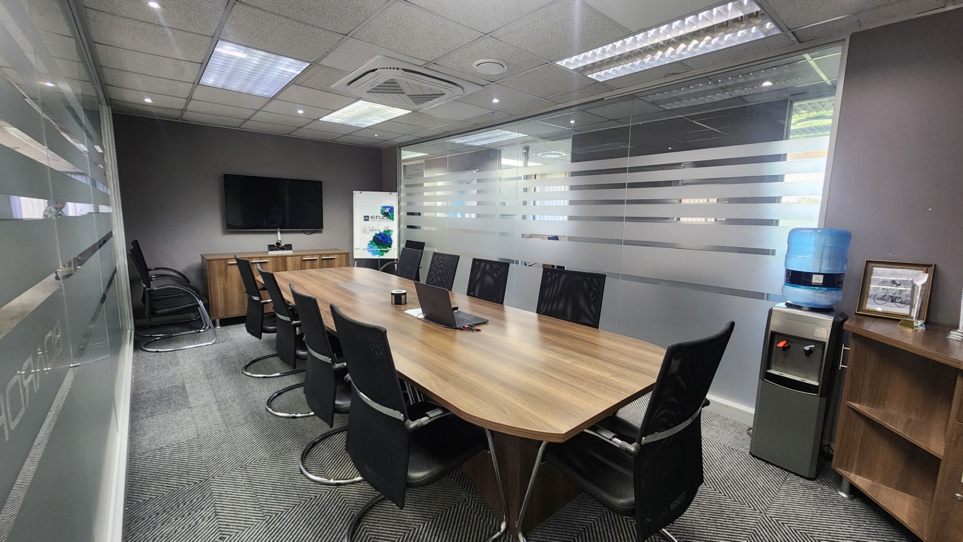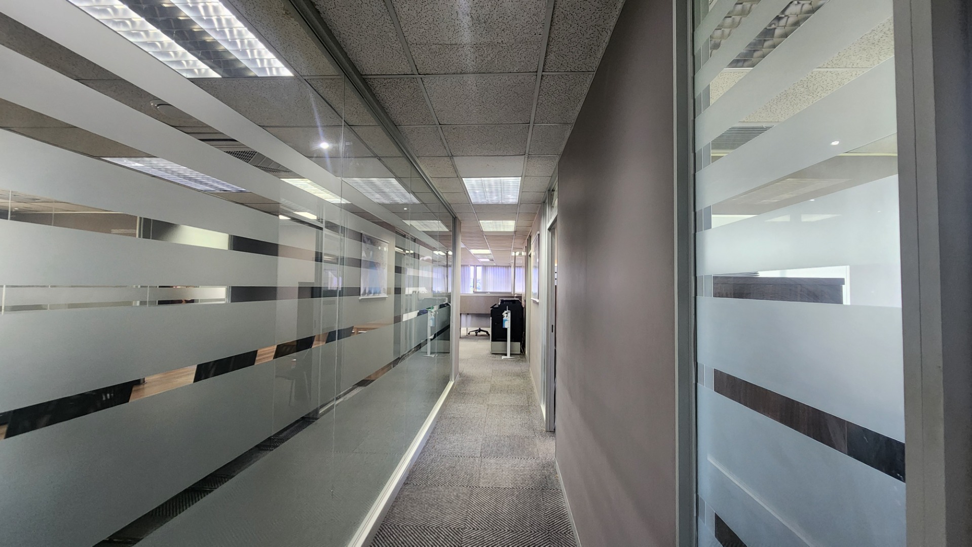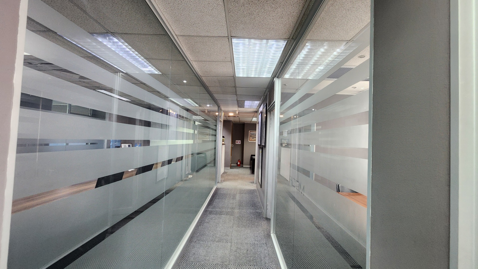 The interior boasts stylish fittings and is entirely glass partitioned, creating a bright and contemporary workspace. It features a welcoming reception area, a dedicated boardroom, three large private offices, and an expansive open-plan area, providing flexibility for various team configurations. A well-appointed kitchen and common serviced male and female ablutions ensure convenience for all occupants.